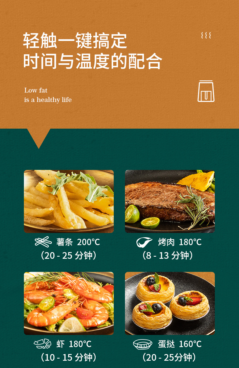 空气炸锅适合烹饪各种肉类、薯条、蛋挞(某宝上可直接买坯子 蛋液)。也可加热买来的外卖熟食,如 披萨、香肠、猪蹄、面包片类之类的,还是很方便的,也是厨房中实用比较高的厨具。