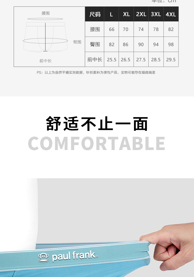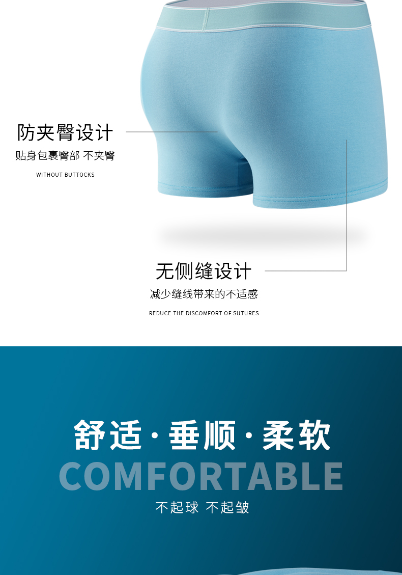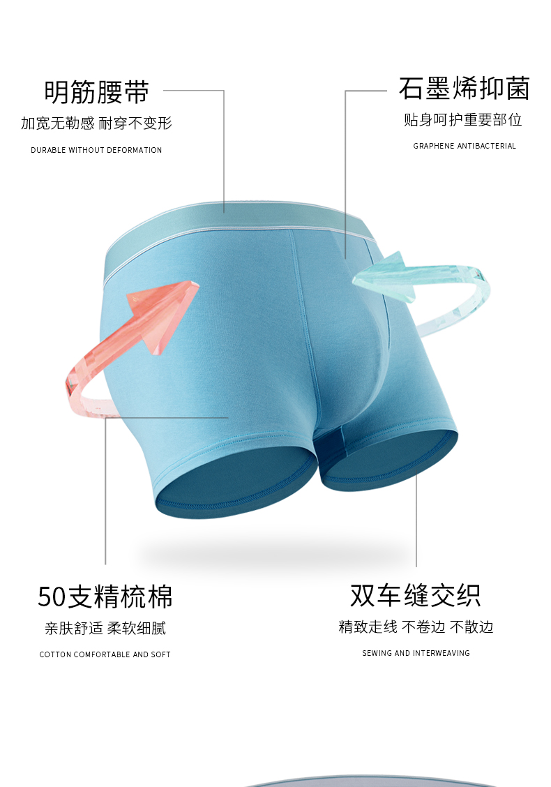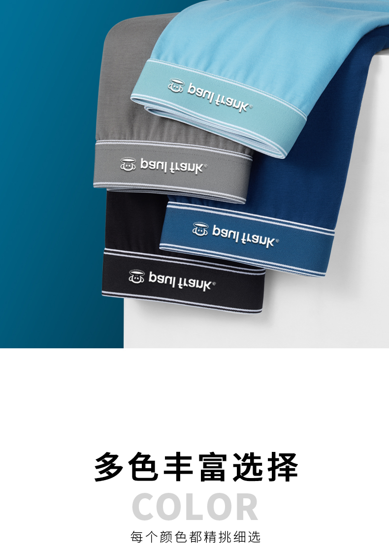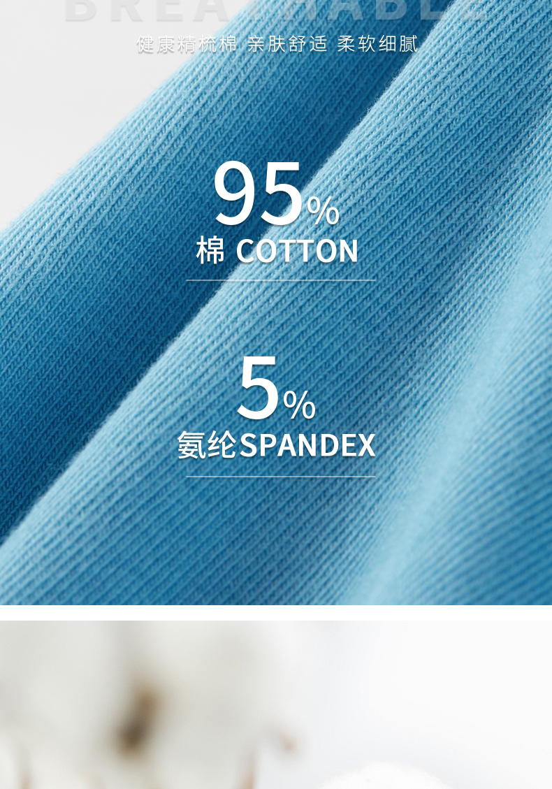 这款平角裤采用95纯棉面料,面料混入5%氨纶增加弹力,并采用50支高支工艺织成,手感柔软细腻,吸湿性和透气性良好,不易起球褶皱,穿着亲肤舒适。
