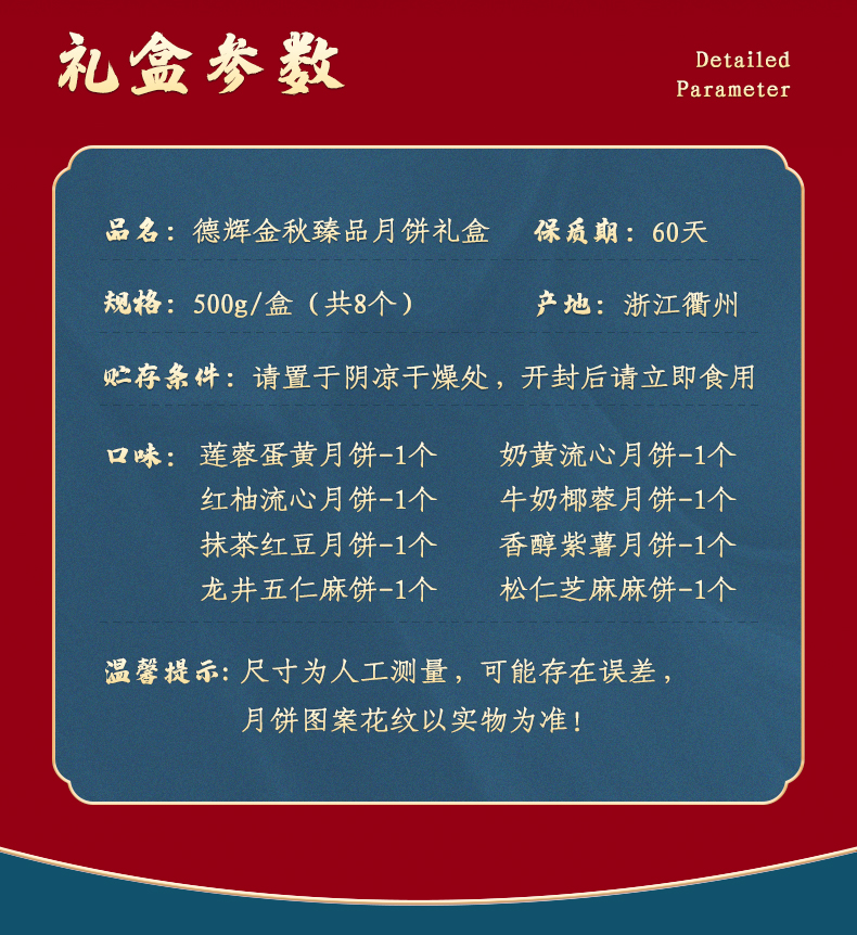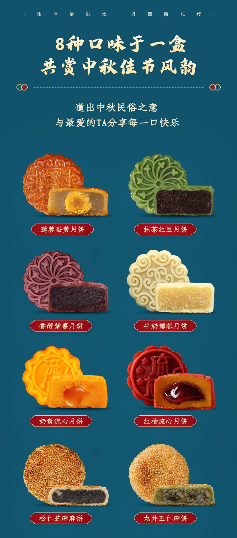 8味8饼共500g 包含:莲蓉蛋黄月饼、奶黄流心月饼、红柚流心月饼、牛奶椰蓉月饼、抹茶红豆月饼、香醇紫薯月饼、龙井五仁麻饼、松仁芝麻麻饼、