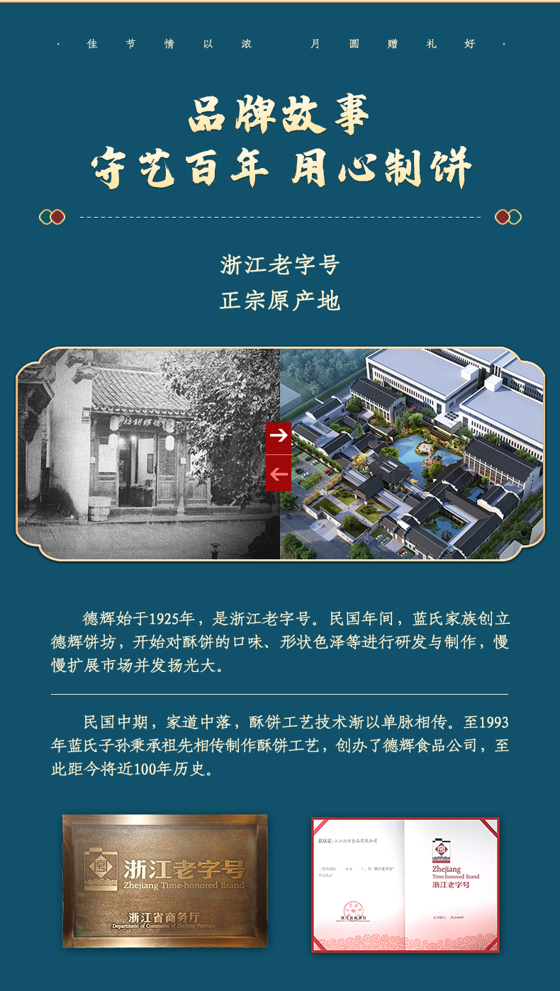 德辉始于1925年,是浙江老字号。民国年间,蓝氏家族创立德辉饼坊,开始对酥饼的口味、形状色泽等进行研发与制作,慢慢扩展市场并发扬光大。民国中期,家道中落,酥饼工艺技术渐以单脉相传。至1993年蓝氏子孙秉承祖先相传制作酥饼工艺,创办了德辉食品公司,至此距今将近100年历史。