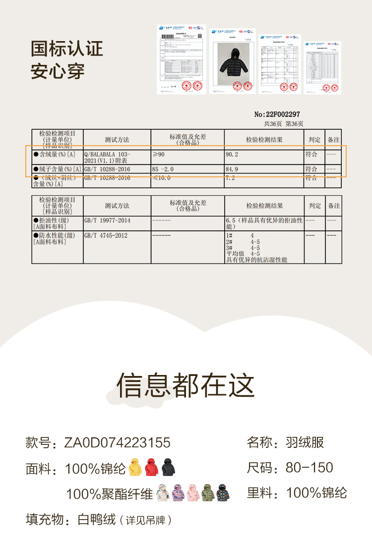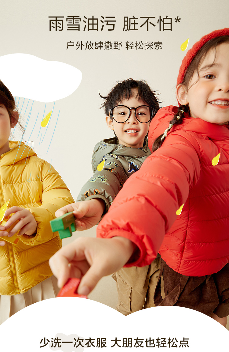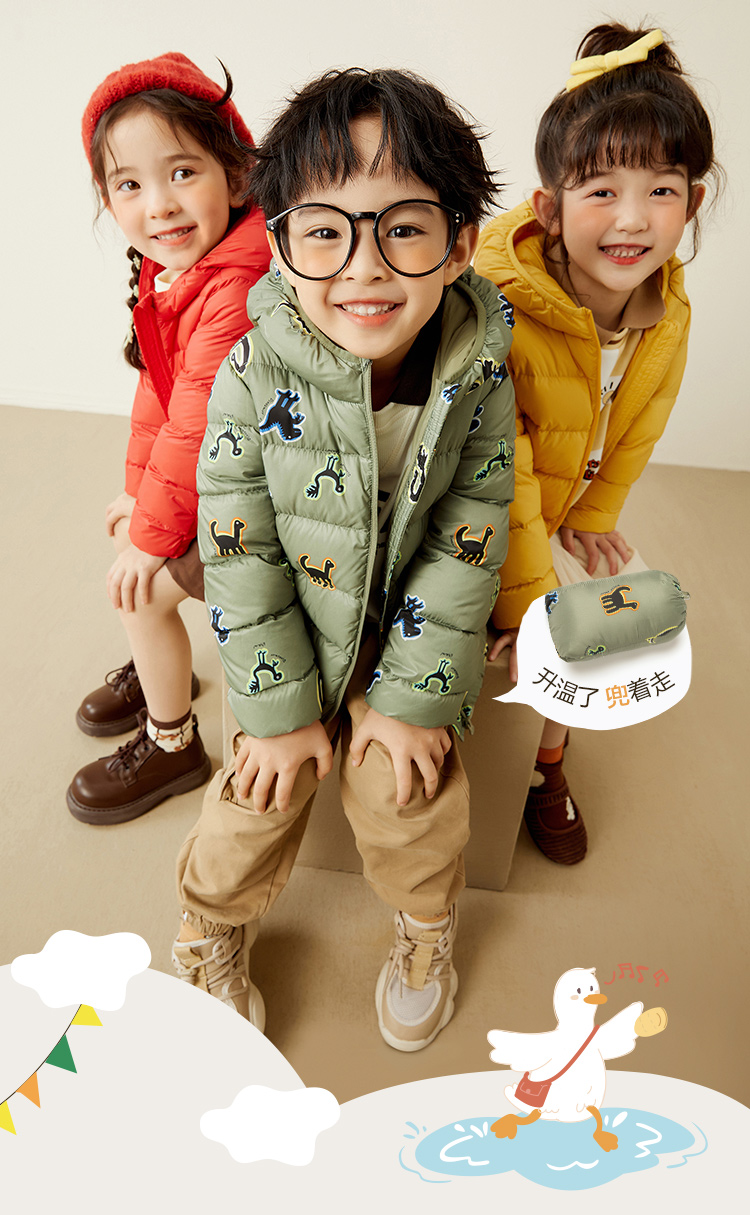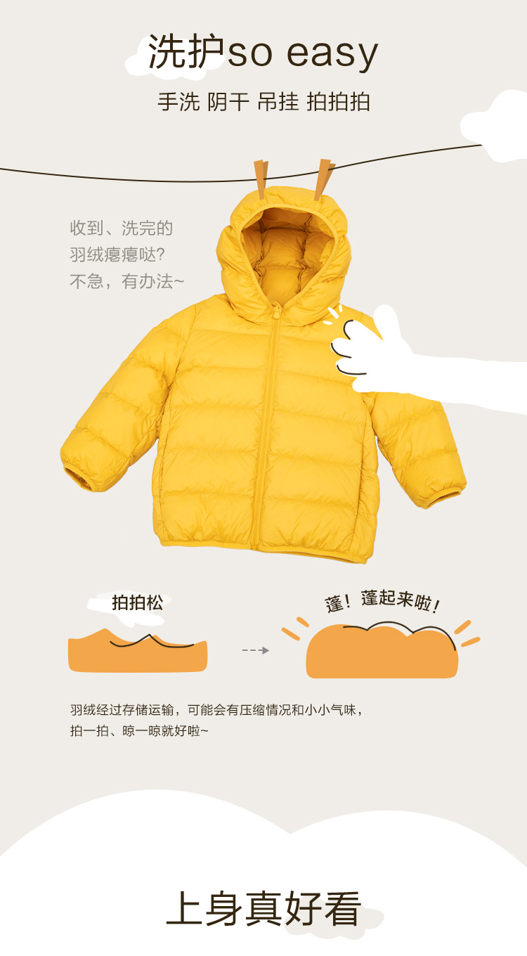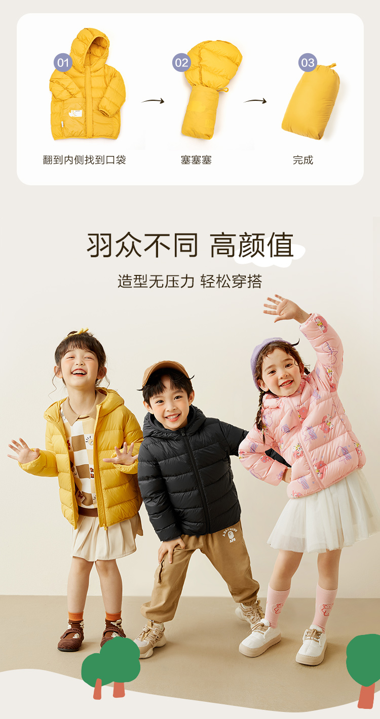 这款儿童轻薄羽绒服,防水防油污面料,色泽鲜亮,透气性好,新国标90白鸭绒,绒子含量85%,羽绒蓬松,舒适保暖,6重锁绒技术、20+道净味工序,呵护健康,无异味不跑绒,时尚卡通印花设计,充满萌趣,小朋友喜欢。内置收纳袋,轻松收纳方便携带。