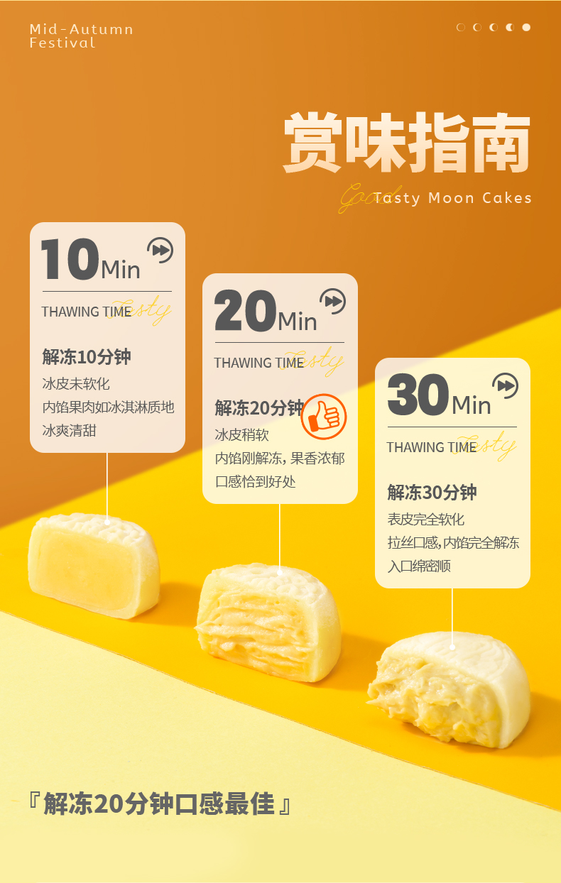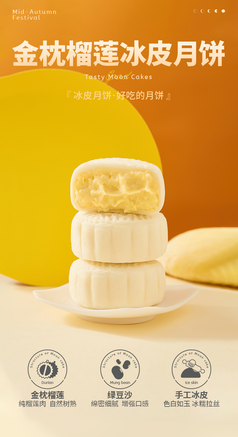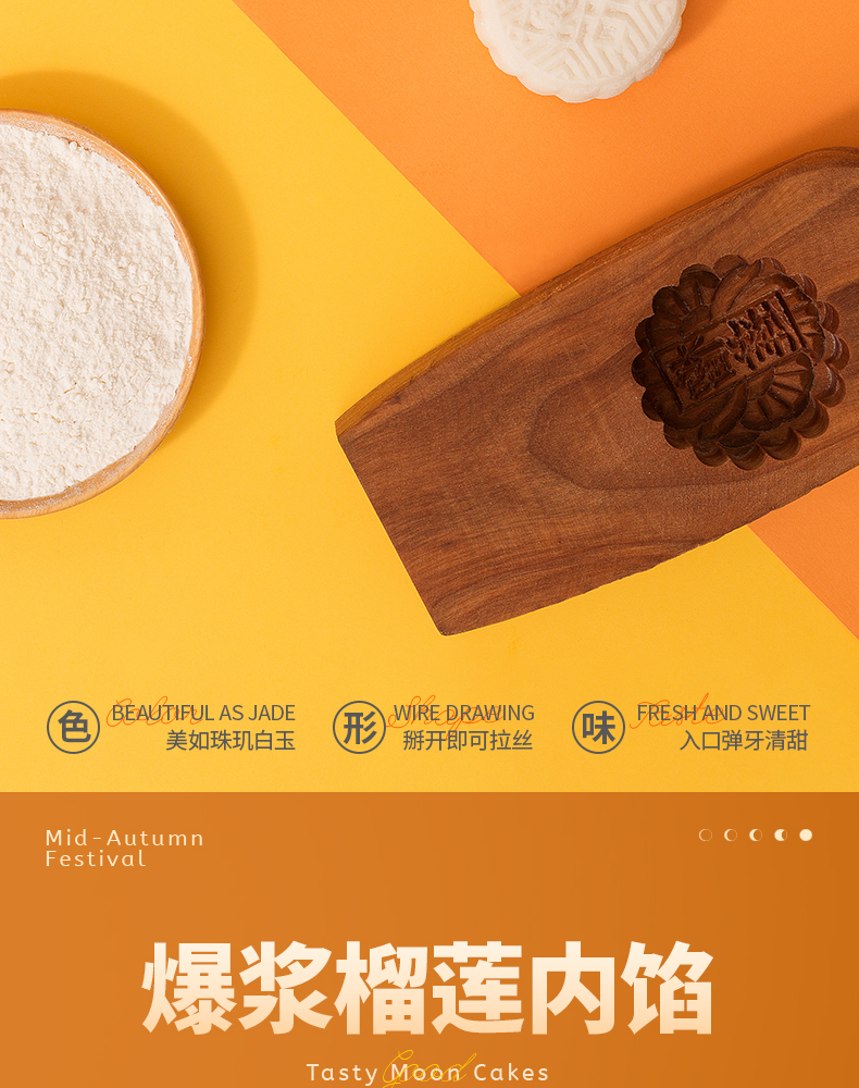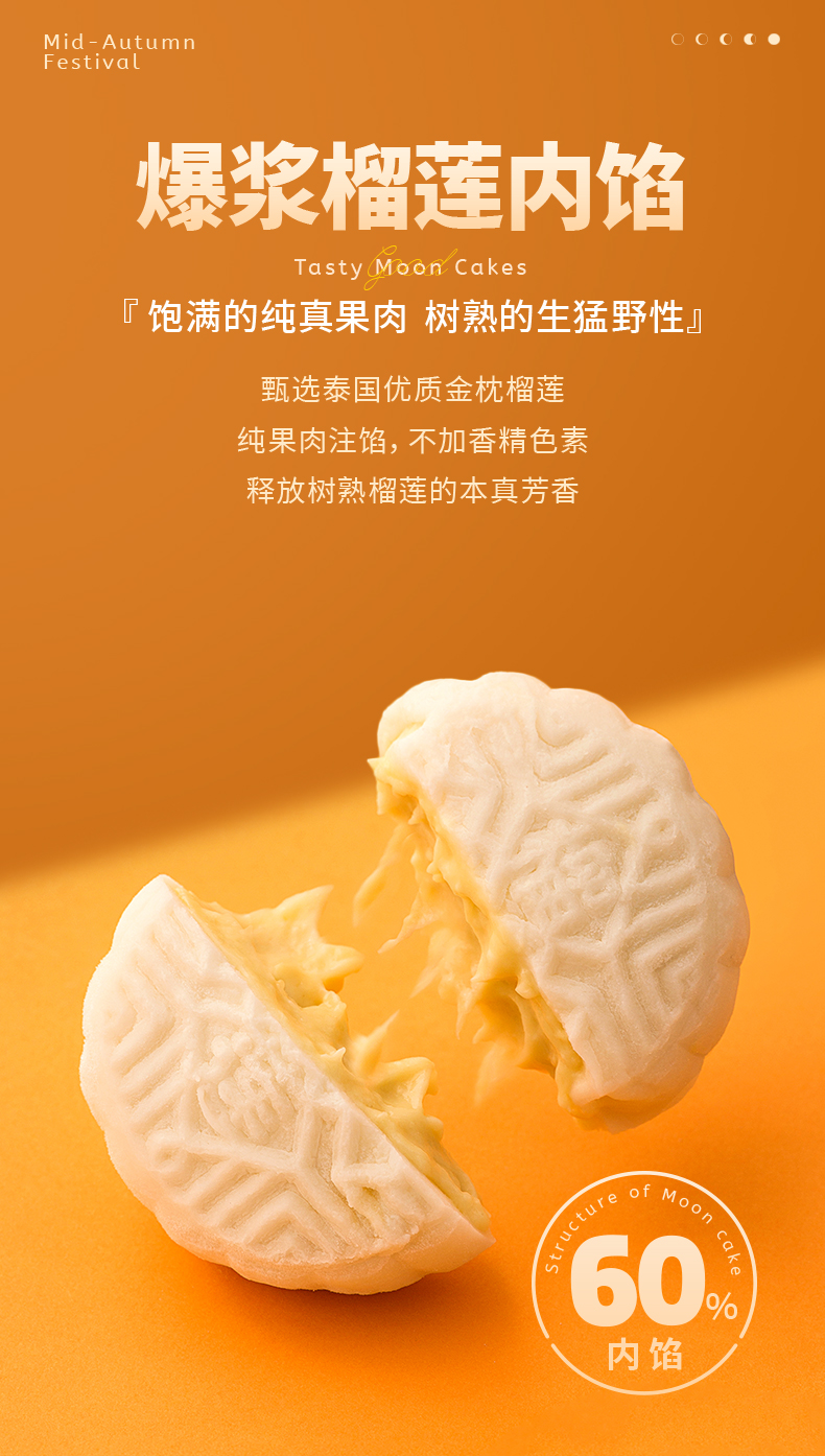 秉承传统工艺的基础上,创新月饼制作方法,冰皮经上千次手工捶打,4mm薄度吹弹可破,轻尝一口就拉丝,特殊冰皮工艺完美融合了泰国金枕头榴莲的浓郁味道,冰糯鲜美,入口爆浆,超美味。