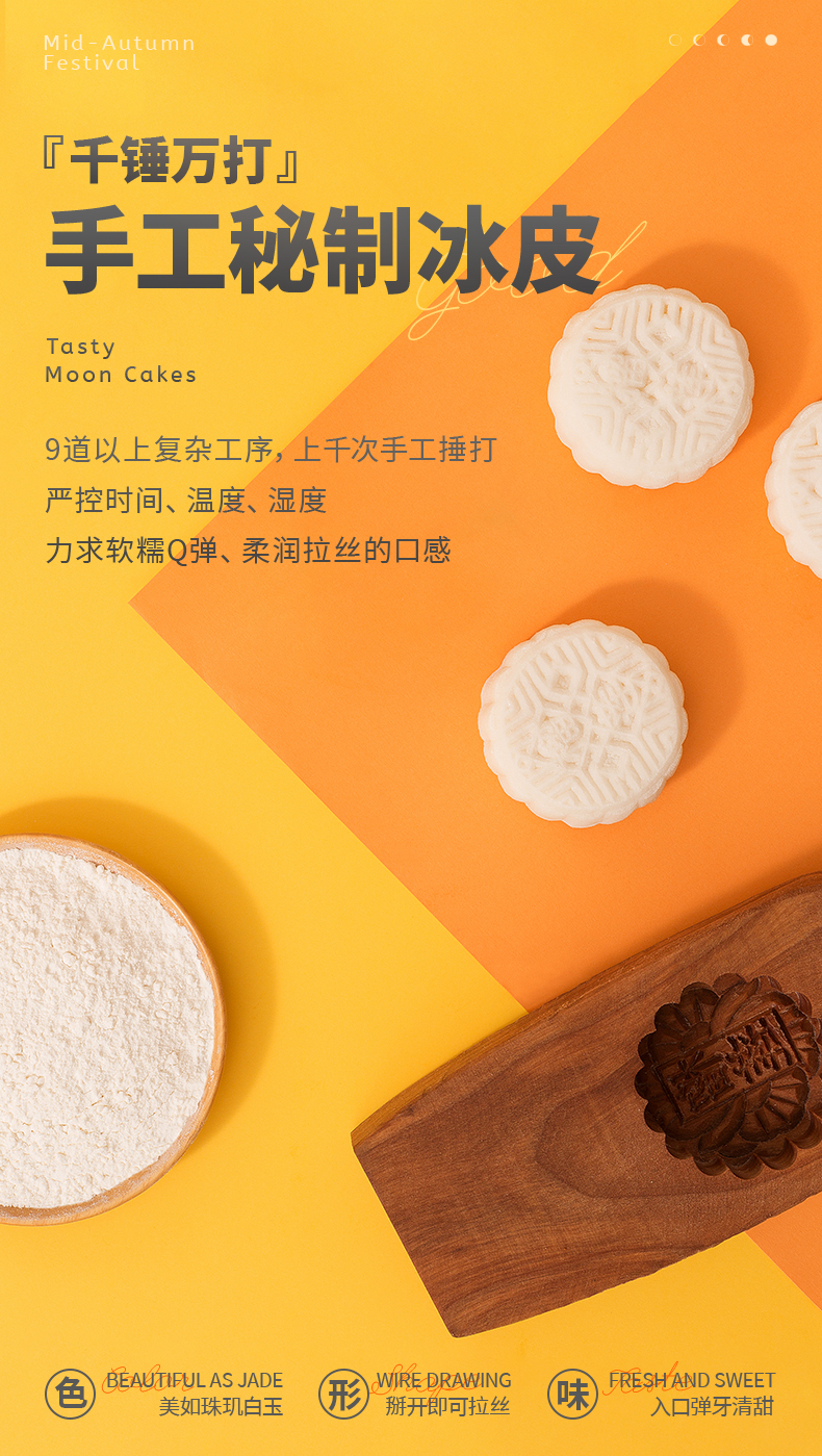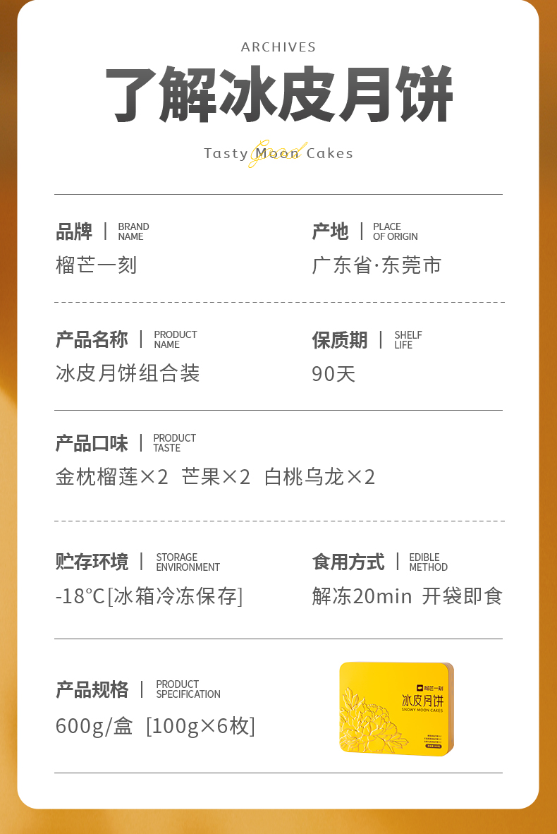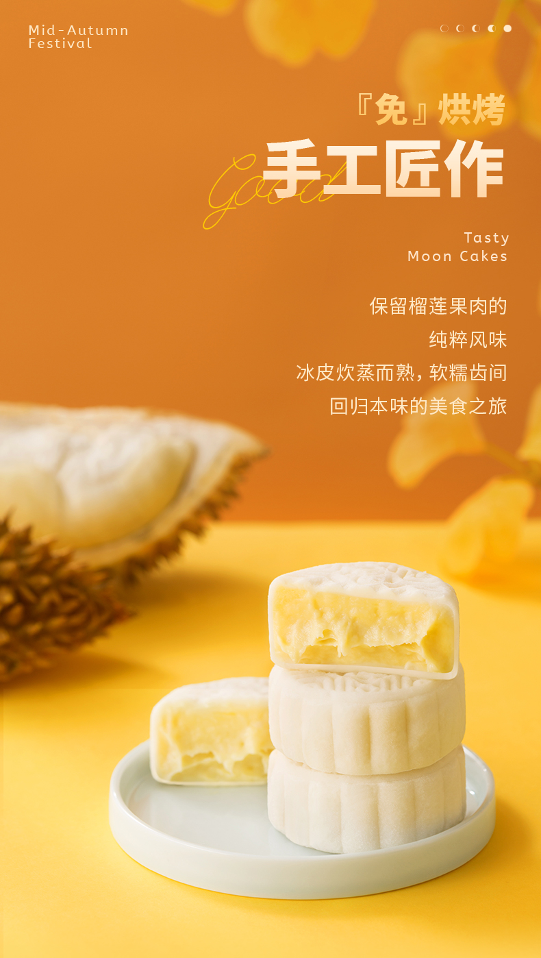 秉承传统工艺的基础上,创新月饼制作方法,冰皮经上千次手工捶打,4mm薄度吹弹可破,轻尝一口就拉丝,特殊冰皮工艺完美融合了泰国金枕头榴莲的浓郁味道,冰糯鲜美,入口爆浆,超美味。