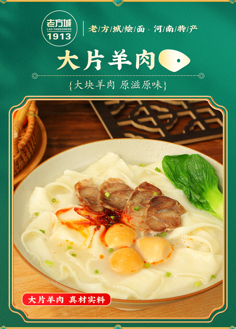 这款河南特产老方城 烩面,全羊骨架6小时精选熬制,劲道Q弹,香浓入口,料包十足,浓郁滋补、丰富配料,还原家乡味道。大片羊肉,真材实料。