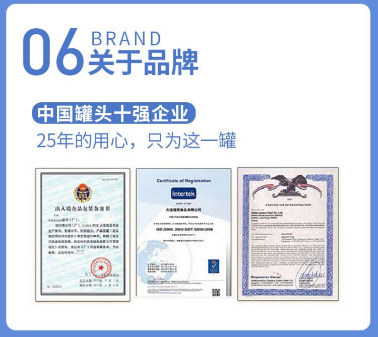 大连林家铺子食品远销欧洲美洲日本等30多个国家,是中国罐头十强企业,产品经过美国FDA认证,英国BRC认证,是可口可乐,沃尔玛,亨氏等著名食品企业的原料供应商,品牌过硬。