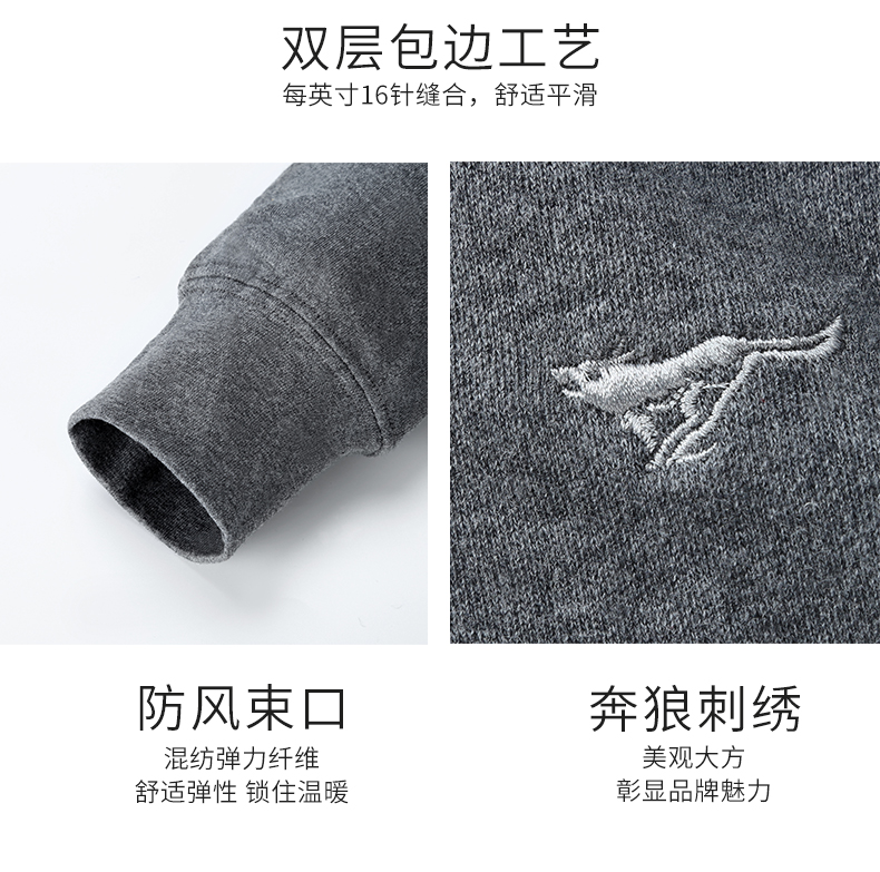细节长:人体工程学设计,经典V领简约有型,胸口奔狼刺绣,美观大方。秋裤弹性宽边腰带,均匀分散压力,舒适贴合不紧绷无勒痕。袖口、脚口是收缩设计,更能有效锁温,贴身不易移位防风不松口。