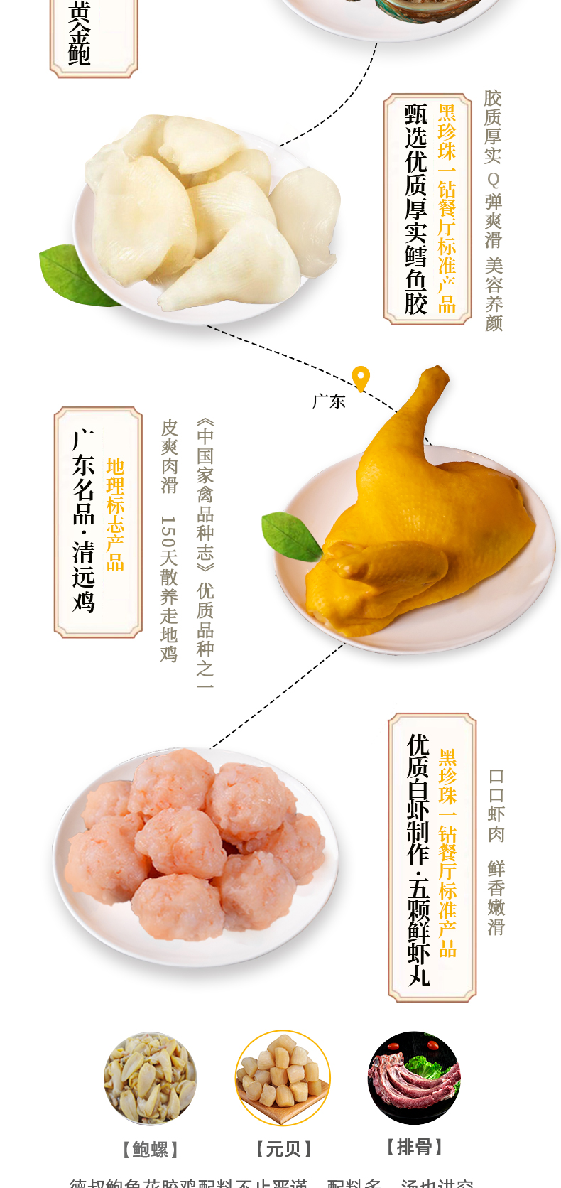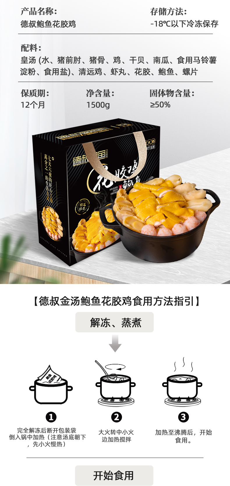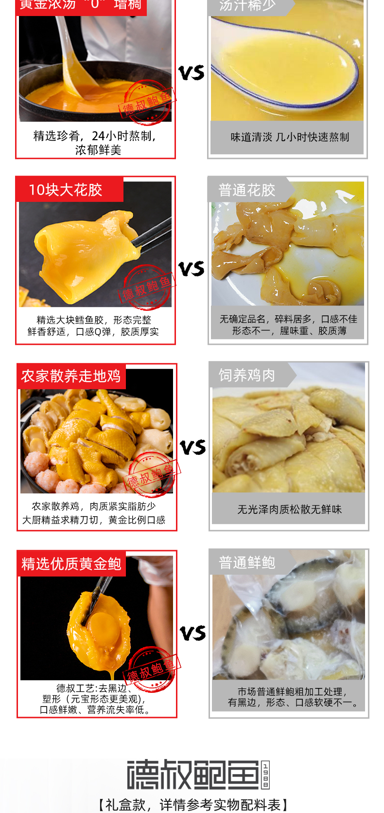 德叔 港式金汤 鲍鱼花胶鸡,正宗港式风味,黑珍珠餐厅选材标准,包含:深海鳕鱼胶胶 10块(100g)、10头黄金鲍鱼 5只、广东清远走地鸡 500g(拒绝冷冻肉)、虾丸 5颗、螺肉片若干。料足且优,性价比更高,金汤鲜美醇厚,12小时慢熬,拒绝防腐剂、增稠剂,精选猪棒骨、干贝等多种真贵食材熬制,滋补美味,简单加热即可食用,非常方便。