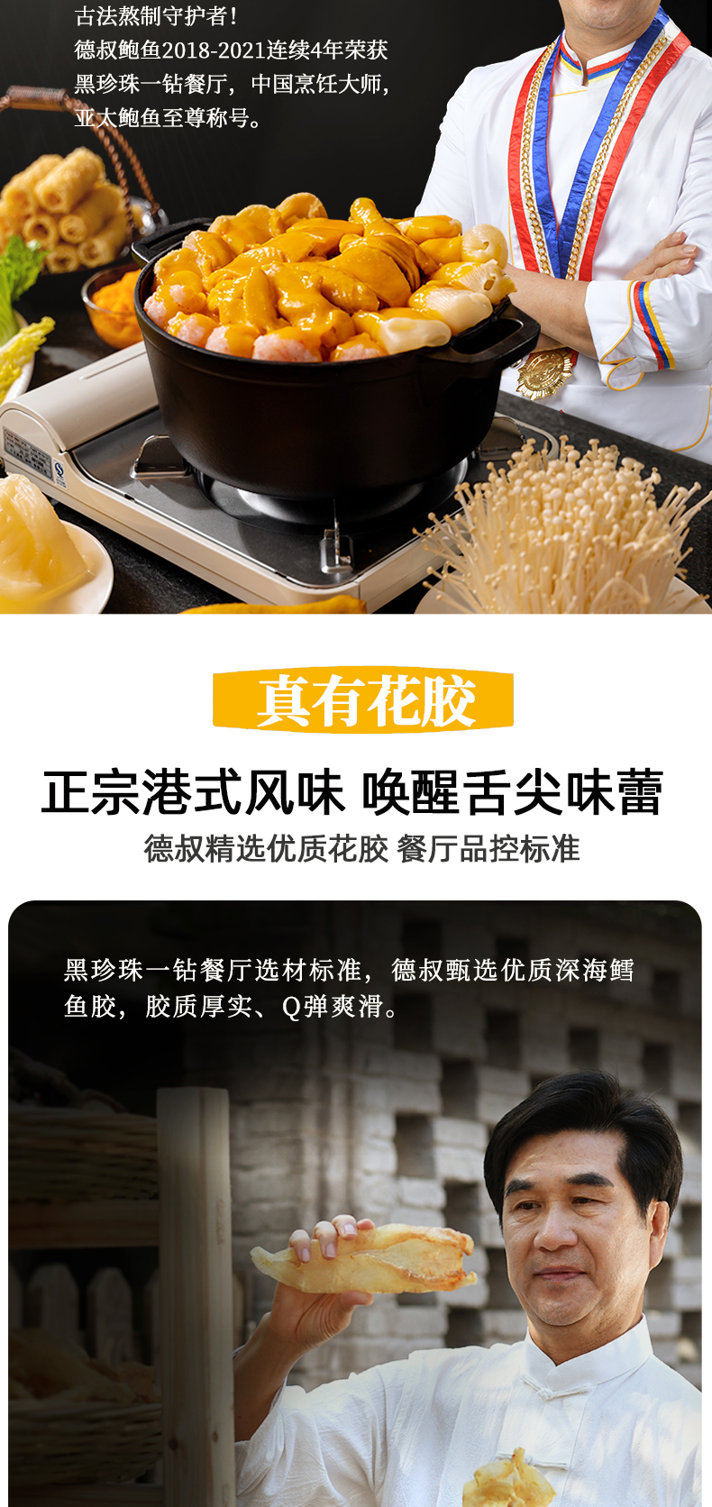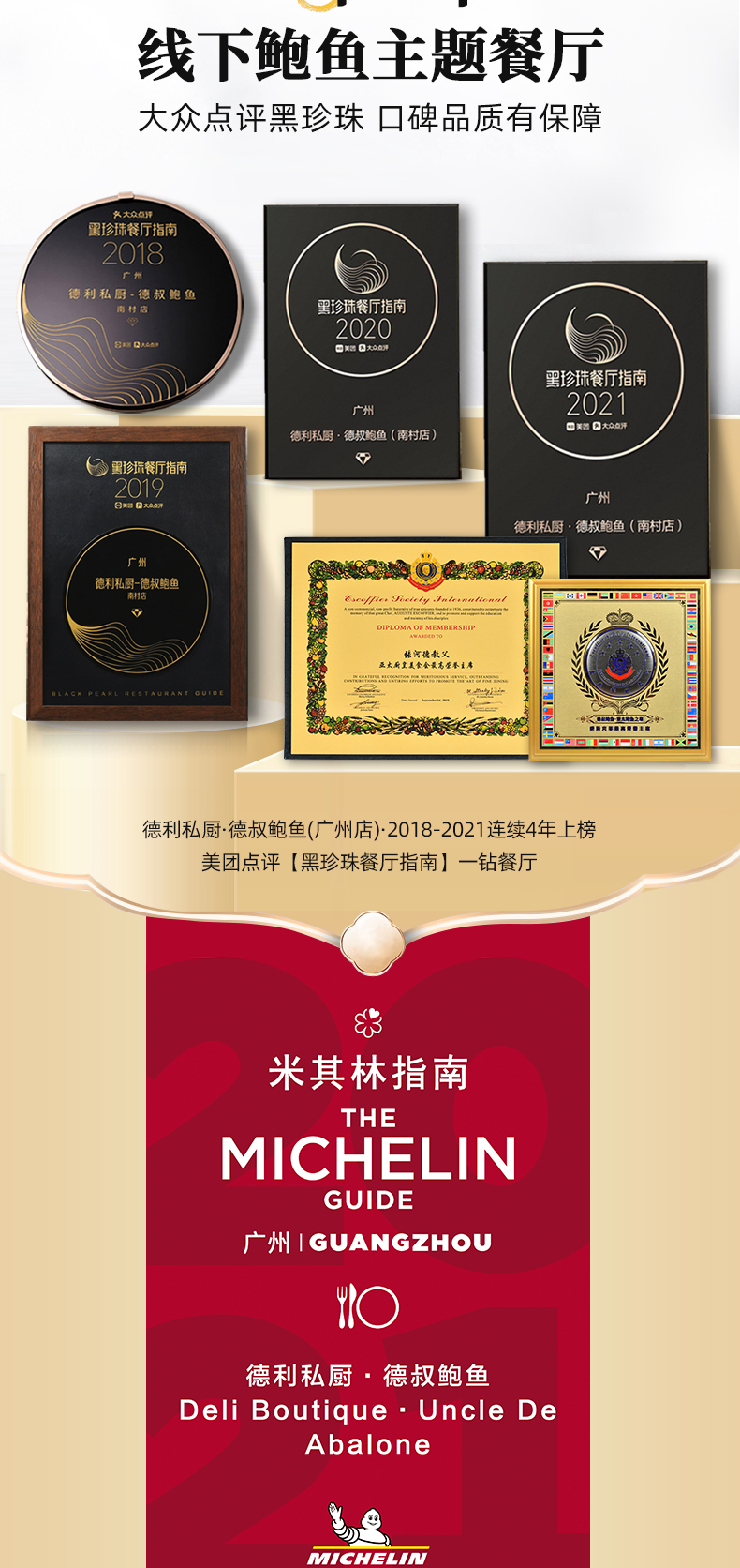 德叔餐厅是大众点评黑珍珠餐厅的一钻餐厅,广州只有21家餐厅上榜,被誉为“国内的米其林指南”。品牌创始人张河德,从1988年开始32年专注鲍鱼匠心制作,荣获“中国烹饪大师”“亚太鲍鱼至尊”称号。