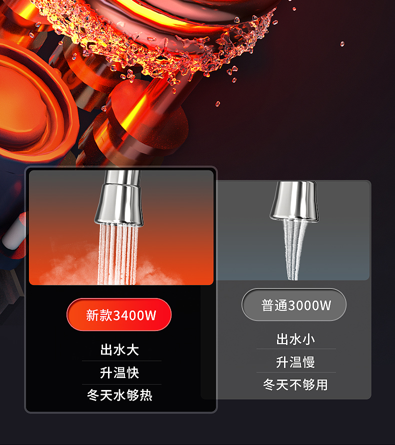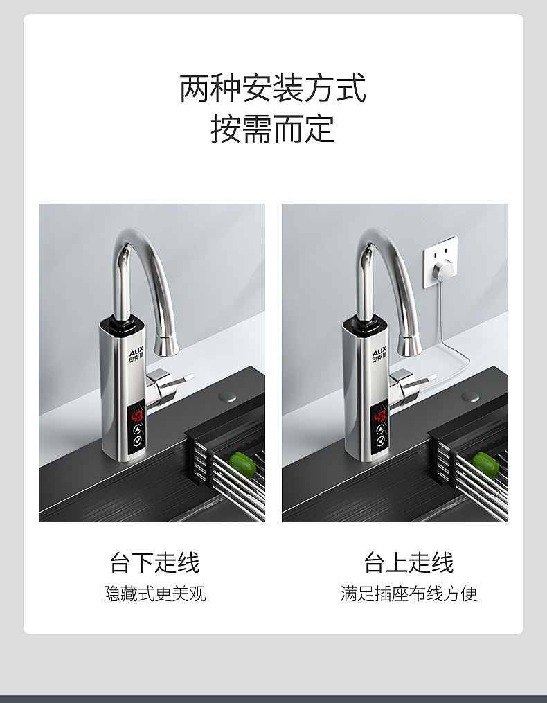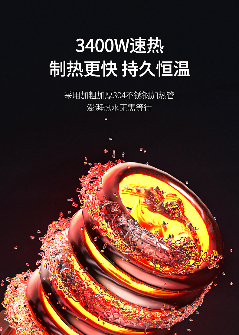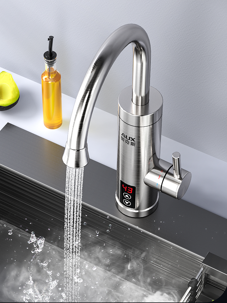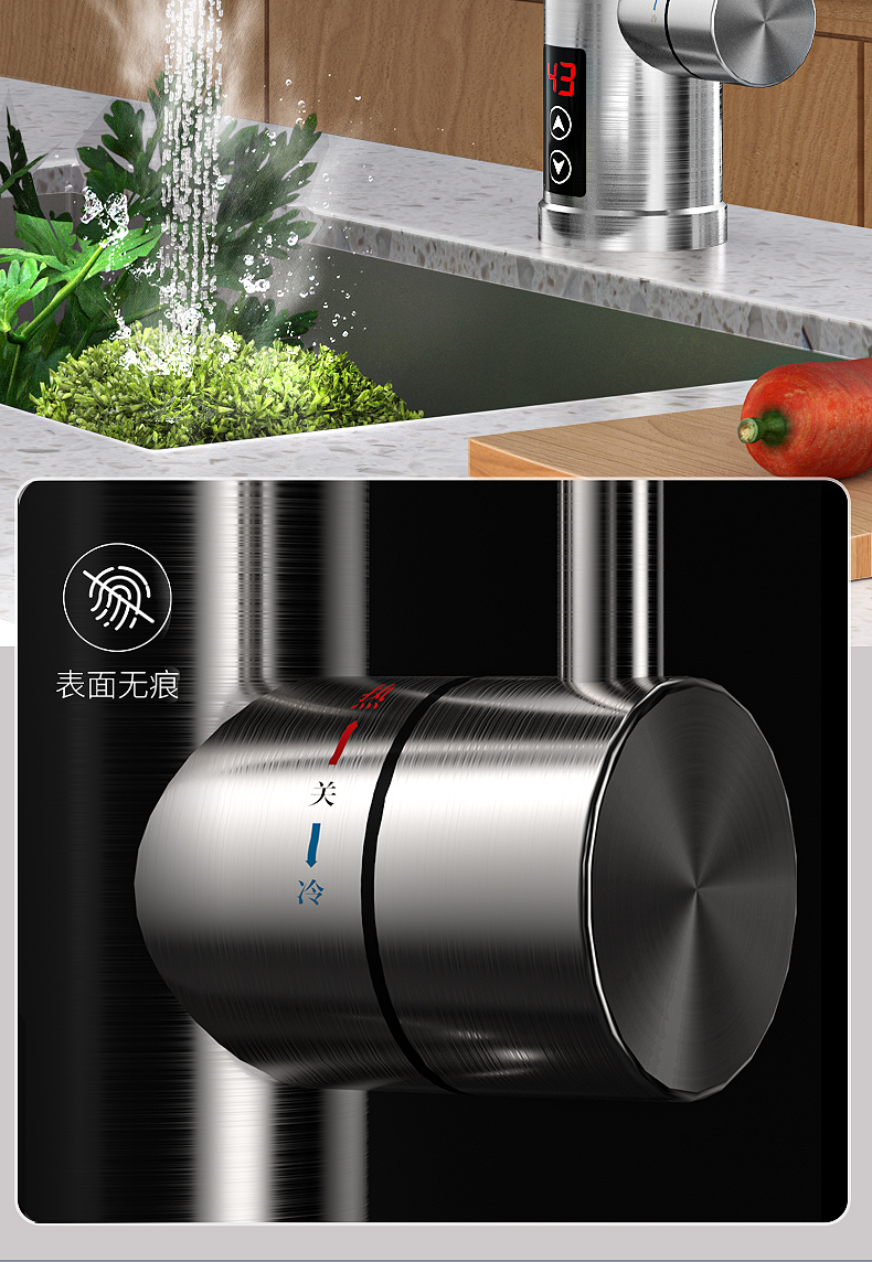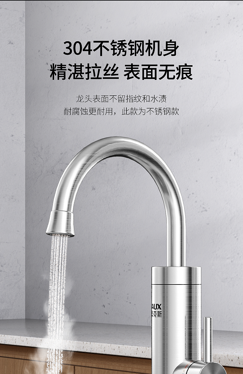 不锈钢加热管,三秒即热,智能数字显示,水流控制温度,冷热双用。360度旋转弯管,多层电镀工艺,色泽光亮,易清洗,耐腐蚀。陶瓷阀芯,水电分离,多种安全防护,全国通用管径。