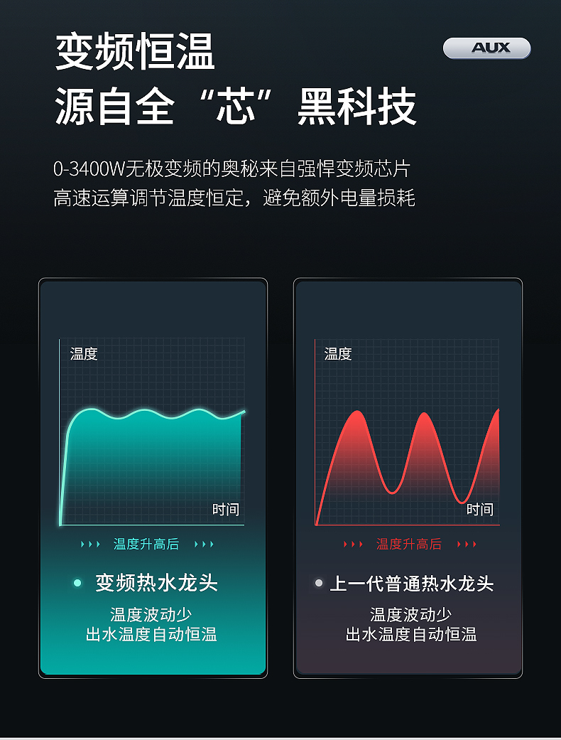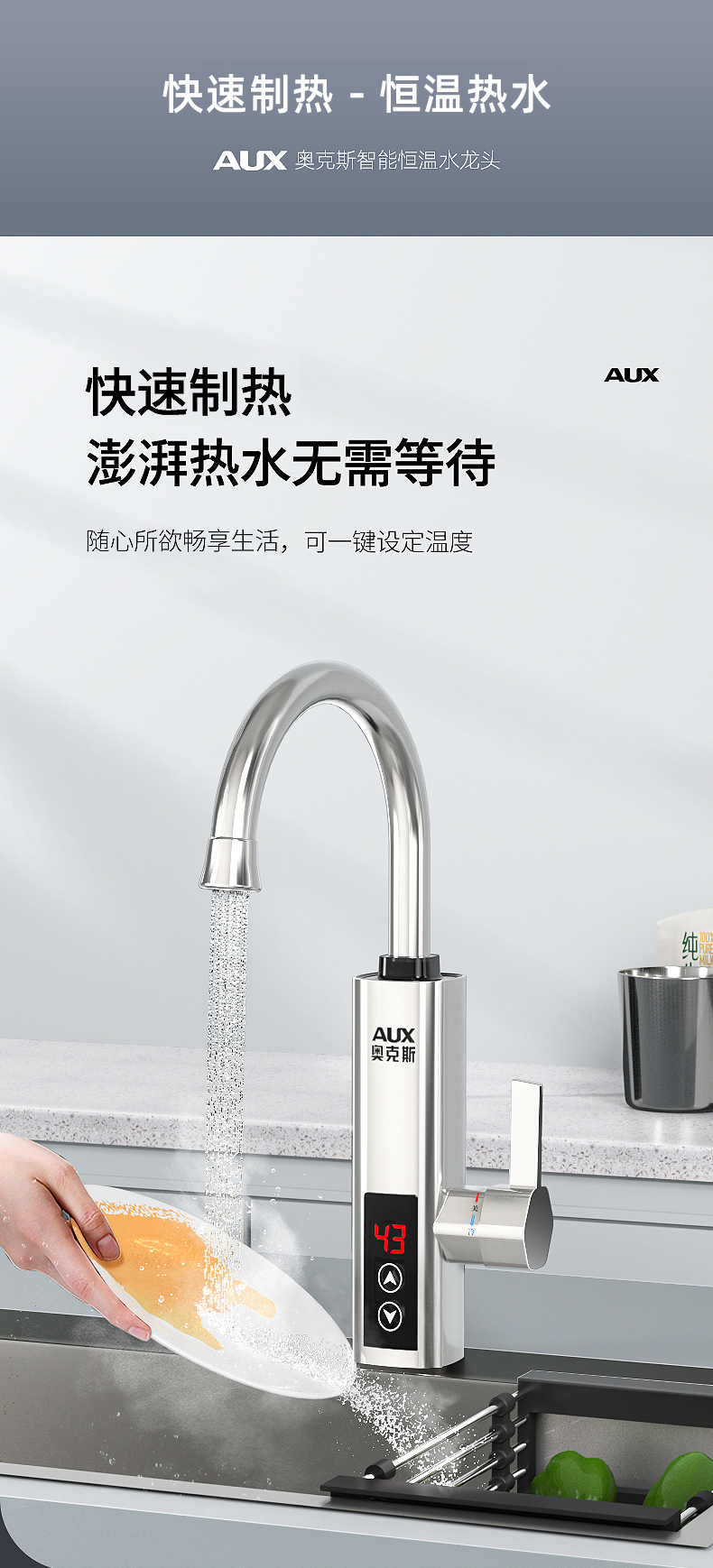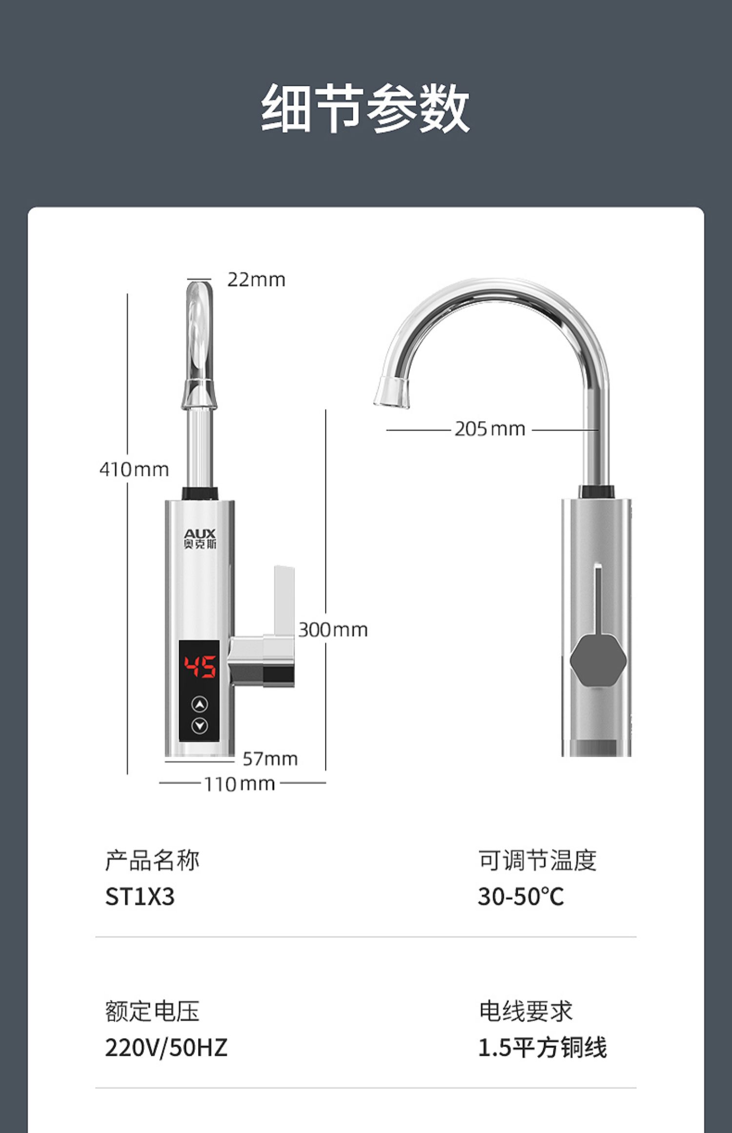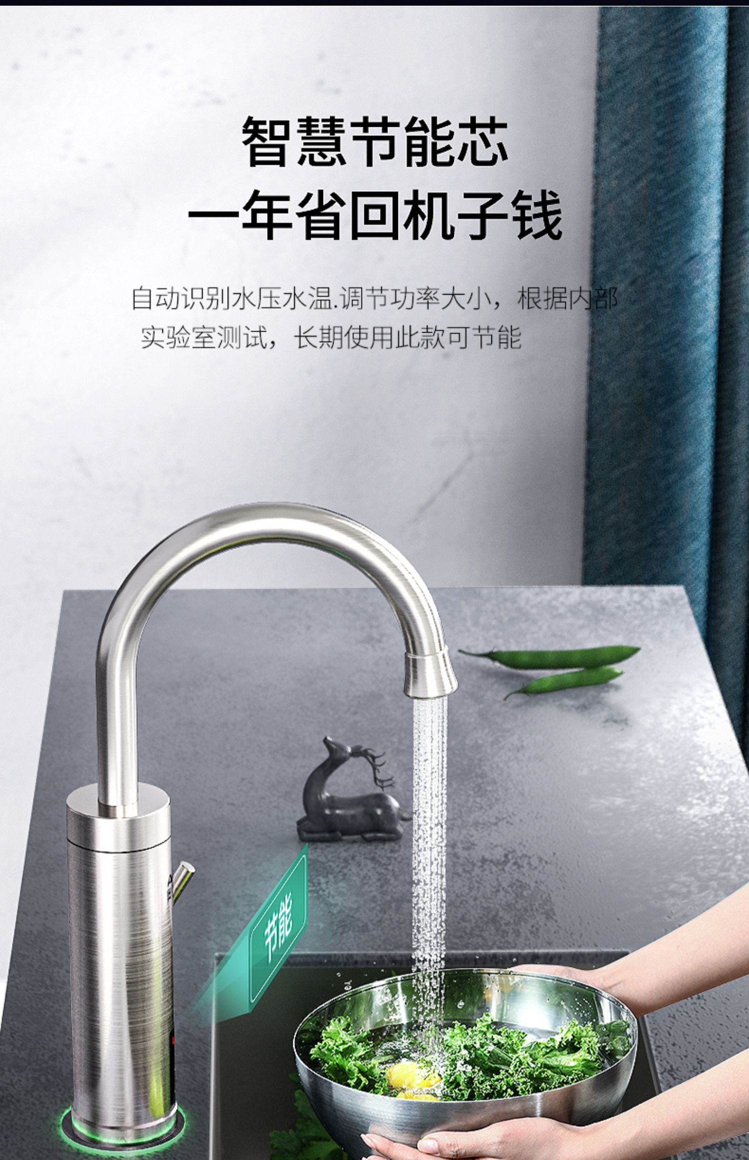 不锈钢加热管,三秒即热,智能数字显示,水流控制温度,冷热双用。360度旋转弯管,多层电镀工艺,色泽光亮,易清洗,耐腐蚀。陶瓷阀芯,水电分离,多种安全防护,全国通用管径。