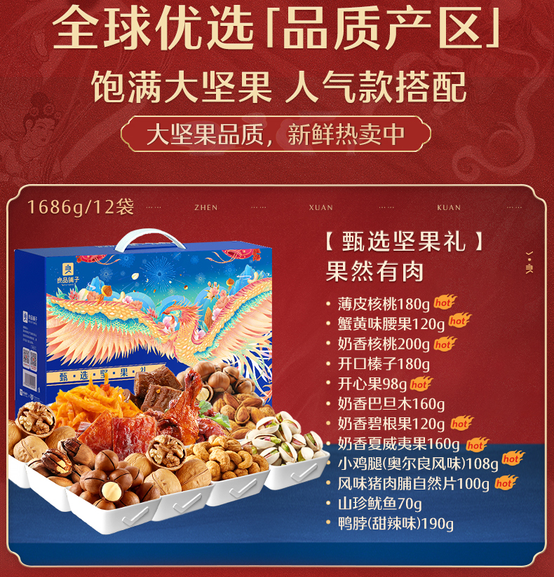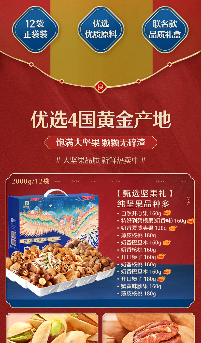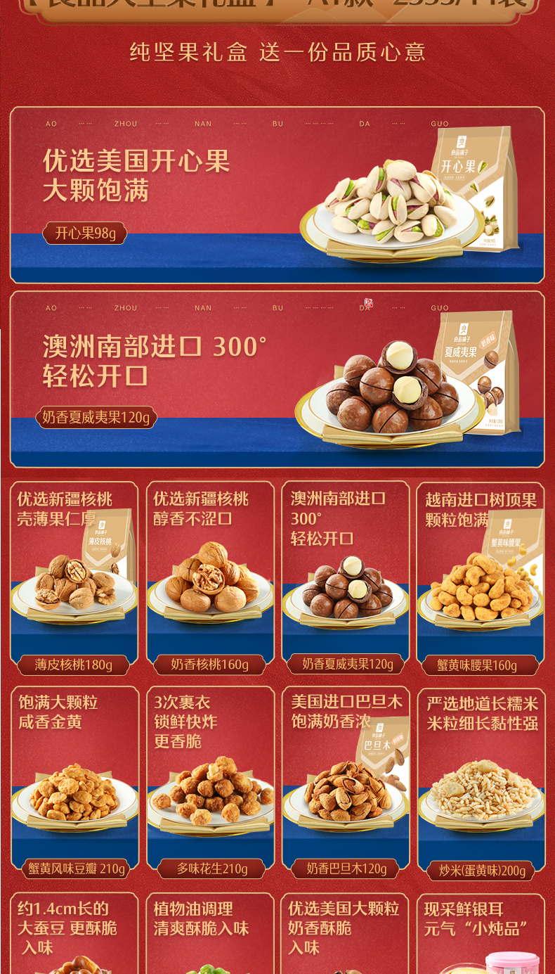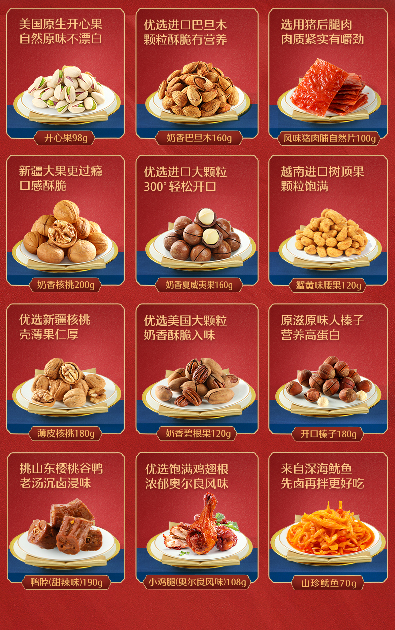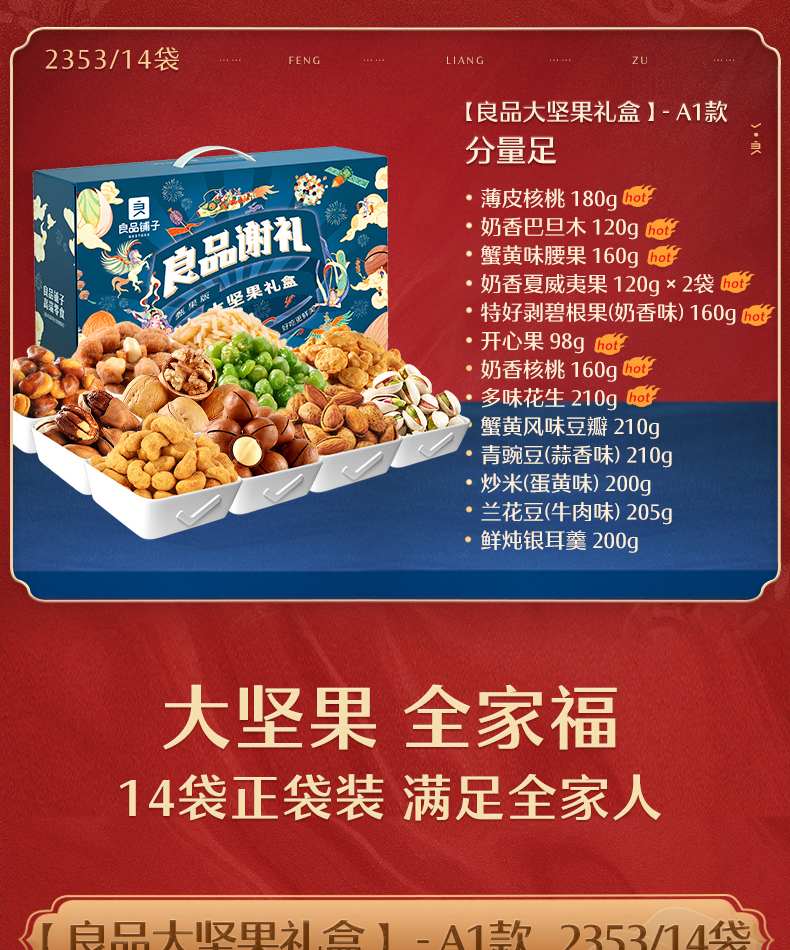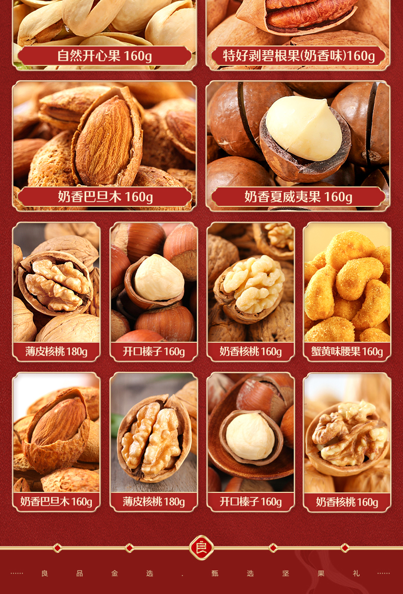 2353g/14袋 礼盒 包含:自然开心果160g、特好剥碧根果(奶香味) 160g、奶香夏威夷果120g、薄皮核桃180g、奶香巴旦木160g、奶香核桃160g、开口榛子160g、奶香核桃160g、奶香巴旦木160g、开口榛子180g、蟹黄味腰果160g、薄皮核桃180g。领券链接点此