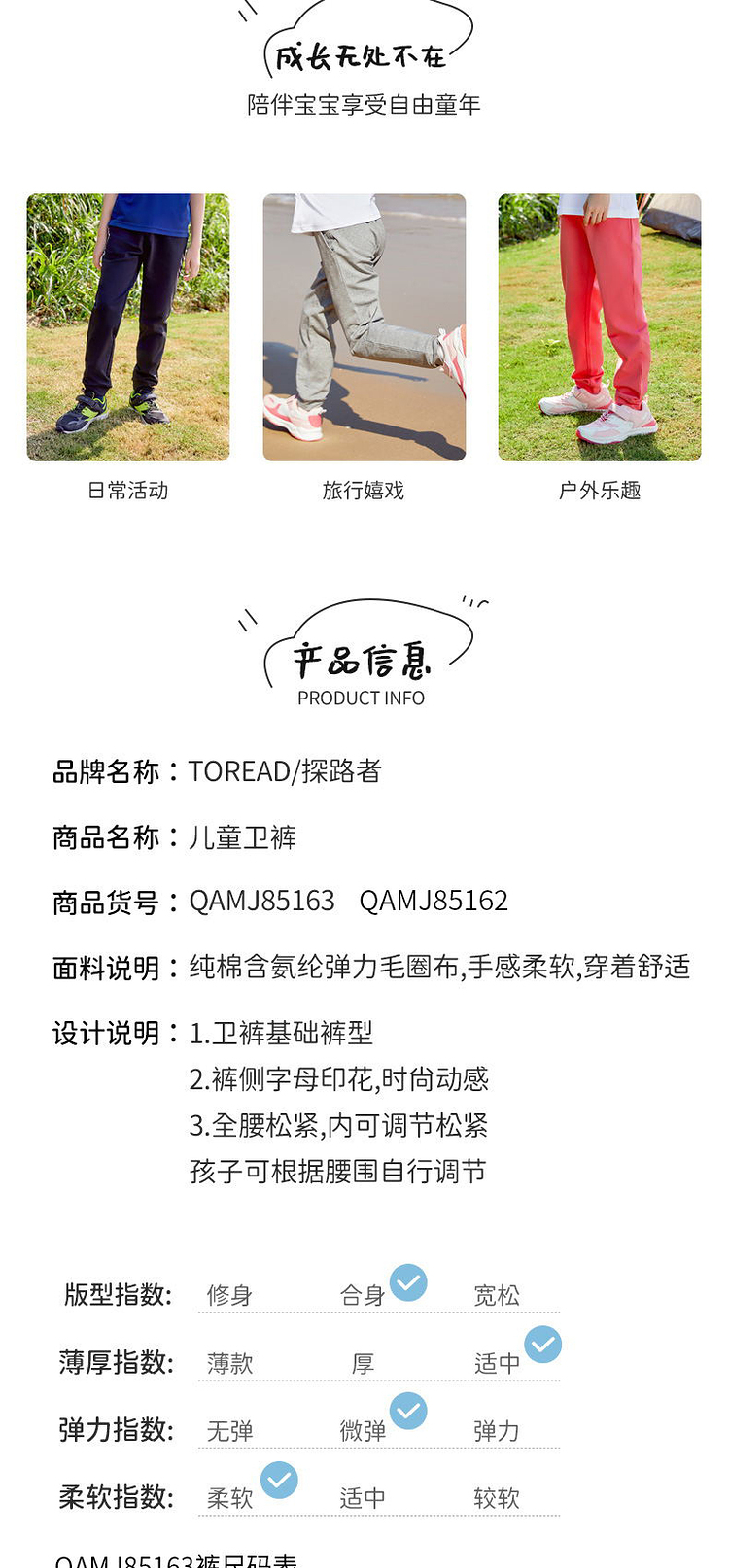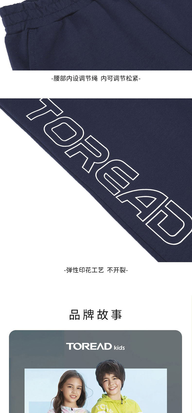 这款Toread Kids 探路者 儿童舒适运动裤, 面料甄选优质长绒棉配4%氨纶增加弹力,细毛圈面料,手感柔软,吸湿透气,上身舒适不紧绷;字母印花Logo,穿着时尚帅气,弹性印花工艺,贴合面料具有高弹性,久洗如新,拒绝开裂。