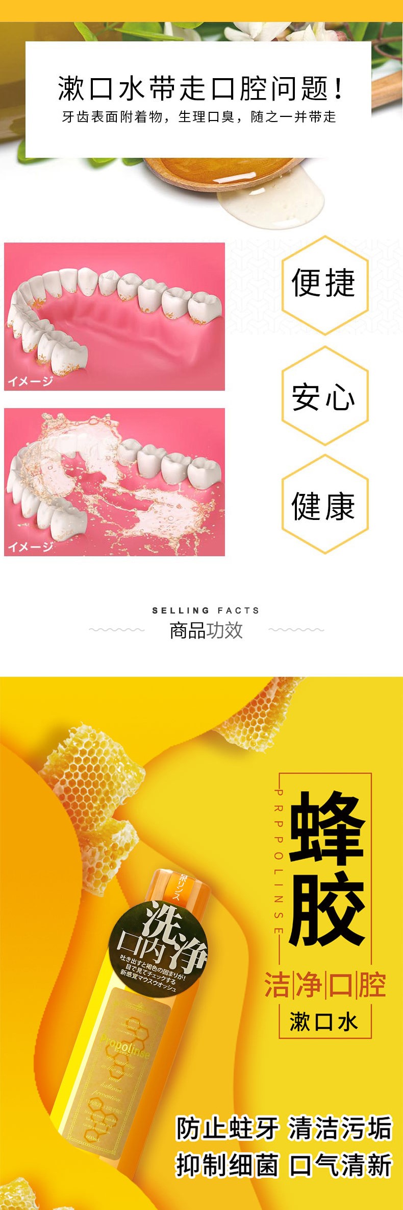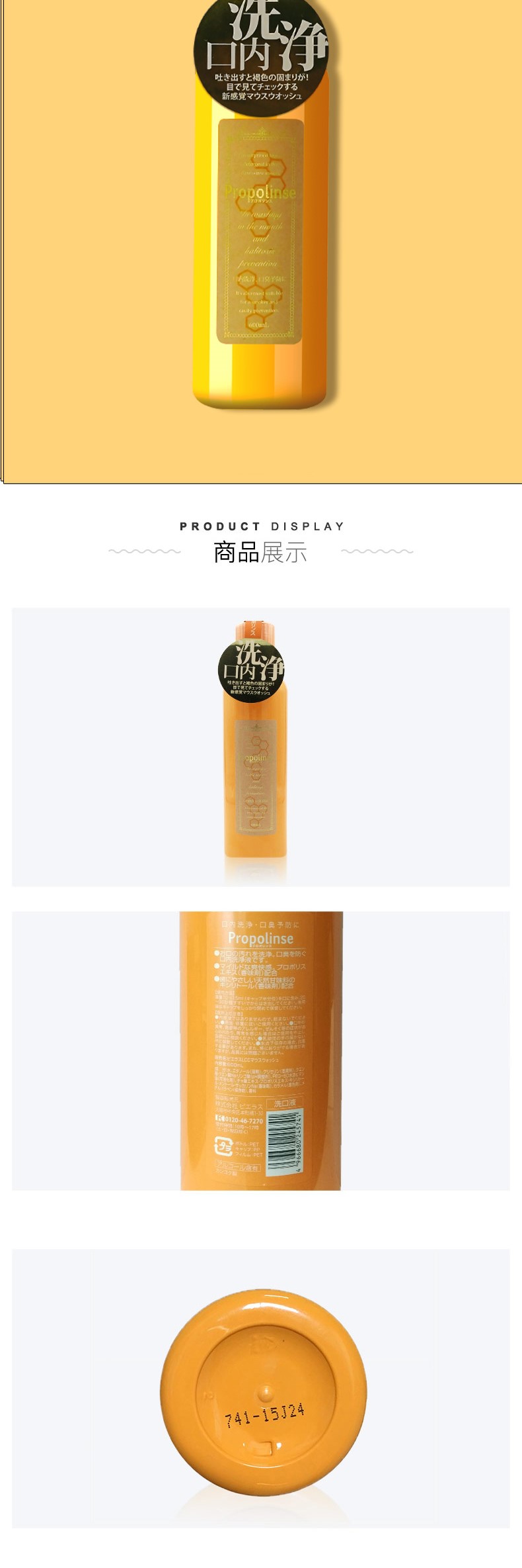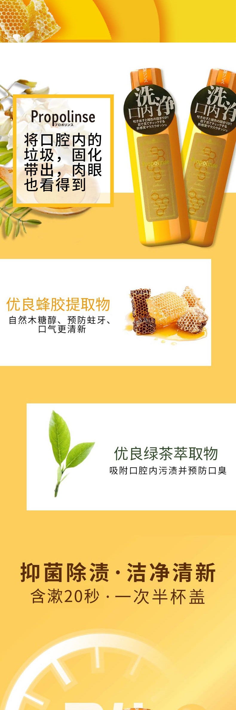 Propolinse蜂胶茶复合漱口水是日本入选Cosme大赏商品,在日亚及国内都十分受欢迎。 内含茶叶萃取物、蜂胶萃取及天然木糖醇,具有杀菌作用并可有效清洁口腔内杂质,去除口臭和异味,保持一天的清新口气。蜂胶也有消炎的作用,能对预防口腔疾病有一定的好处。使用方法:每次10-15ml的量(约半瓶盖的量),20-30秒后吐出即可。
