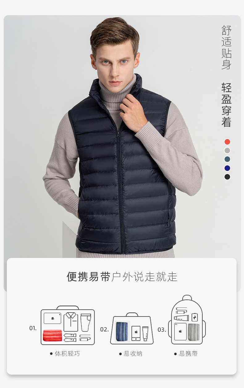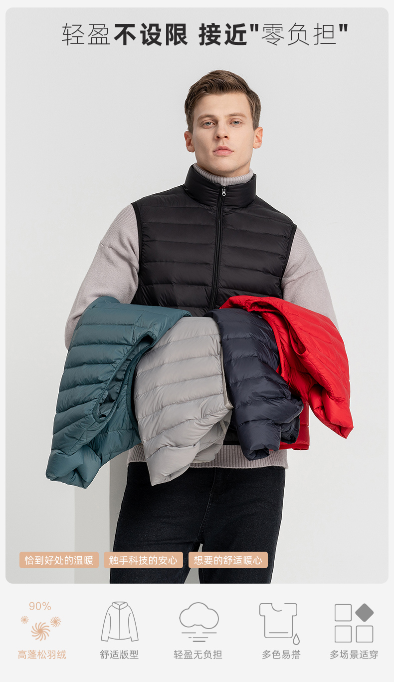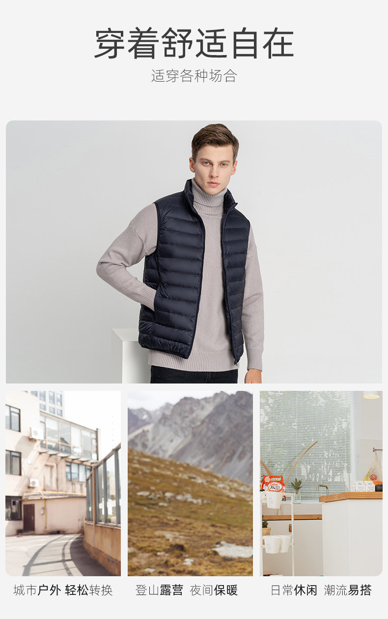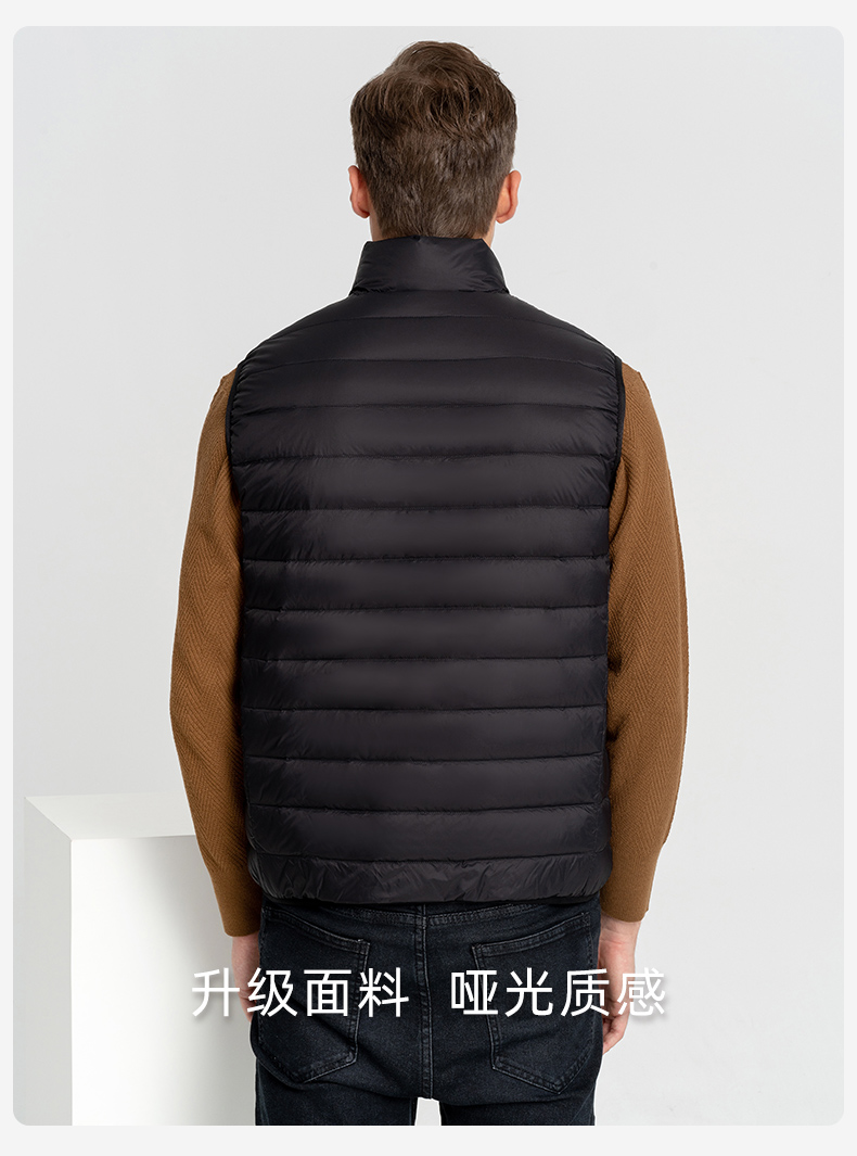 这款羽绒马甲,高密微防水面料,不惧细雨、小雪、雾气、内充17cm+大绒朵白鸭绒,90%含绒量,历经12道消毒工艺,上身轻盈保暖不臃肿,时尚小立领设计,锁温保暖非常适合入秋转凉穿着,可搭配毛衣、卫衣、衬衣等都好看。