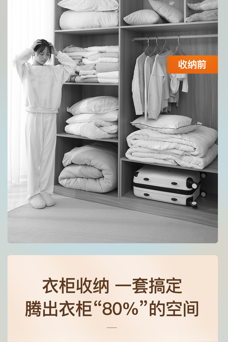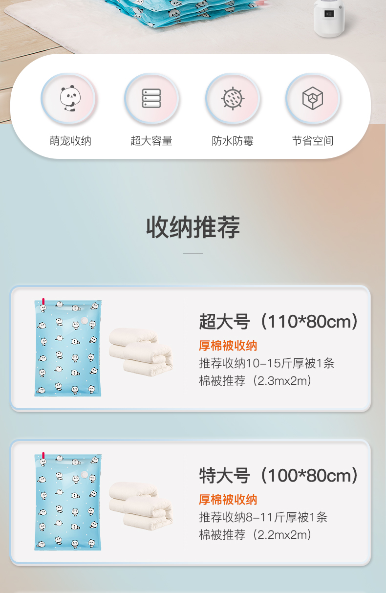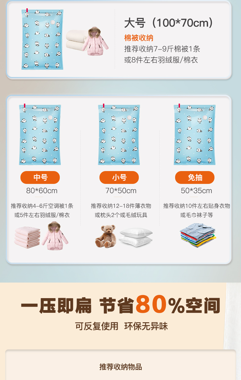 天猫贝易纳旗舰店29.9元,可领10元优惠券,实付19.9元到手,第一款这个价格。包含:大号100*70cm*2、中小号70*50cm*3、手卷50*35cm*3、手泵*1。此外还有多种套餐可选,略有差价。专业家居收纳整理,打造高品质生活。优质的PAPE材质健康环保,防潮防霉,防菌防尘,轻松解决各种收纳问题。