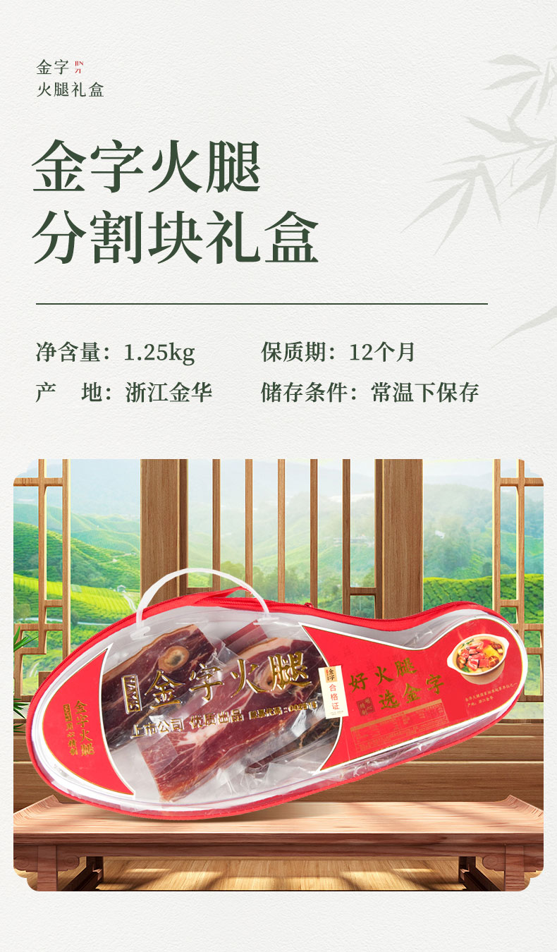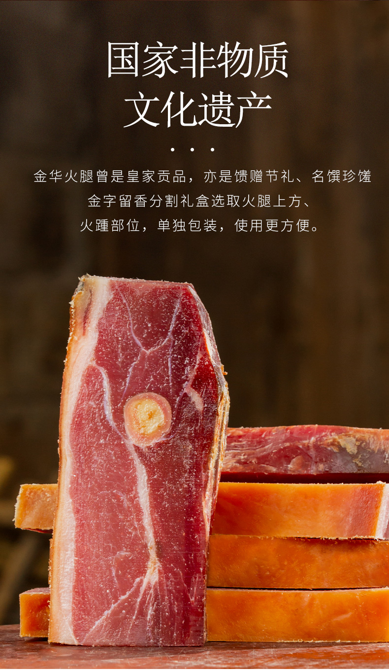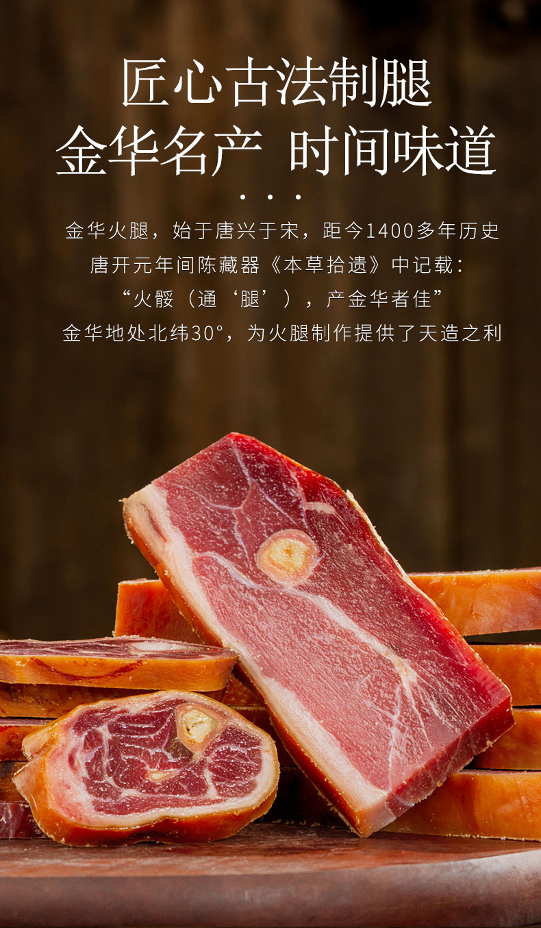 《舌尖上的中国》推荐金华金字火腿,经过精细分割,每块真空包装锁鲜,使用时温水洗净,可切丝、片、丁等,蒸炖皆宜。精美礼品袋装,自用送礼两相宜。