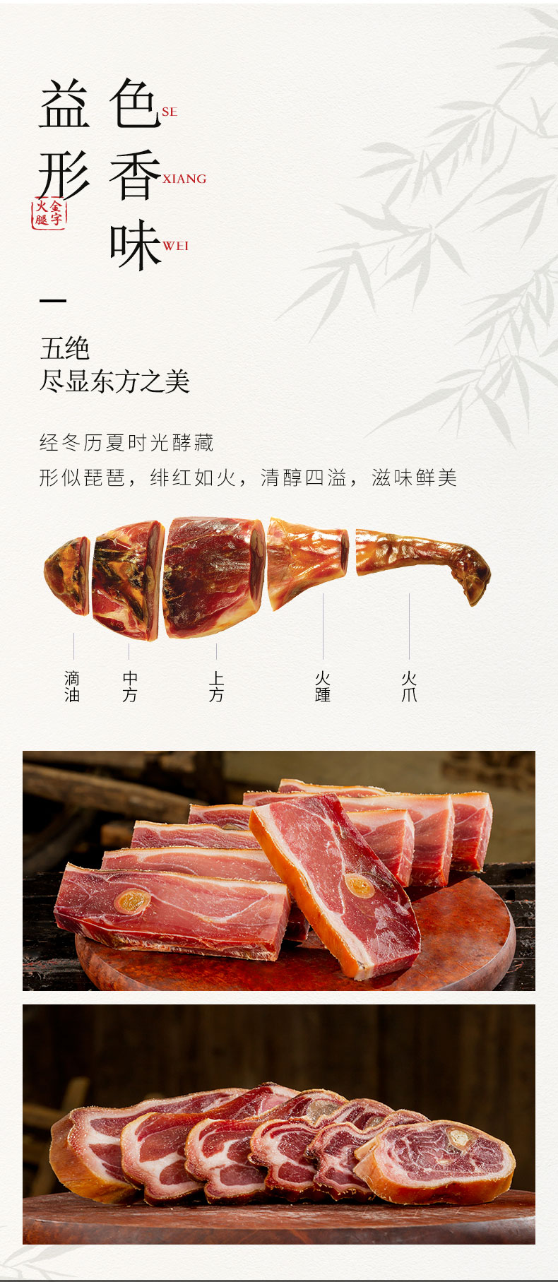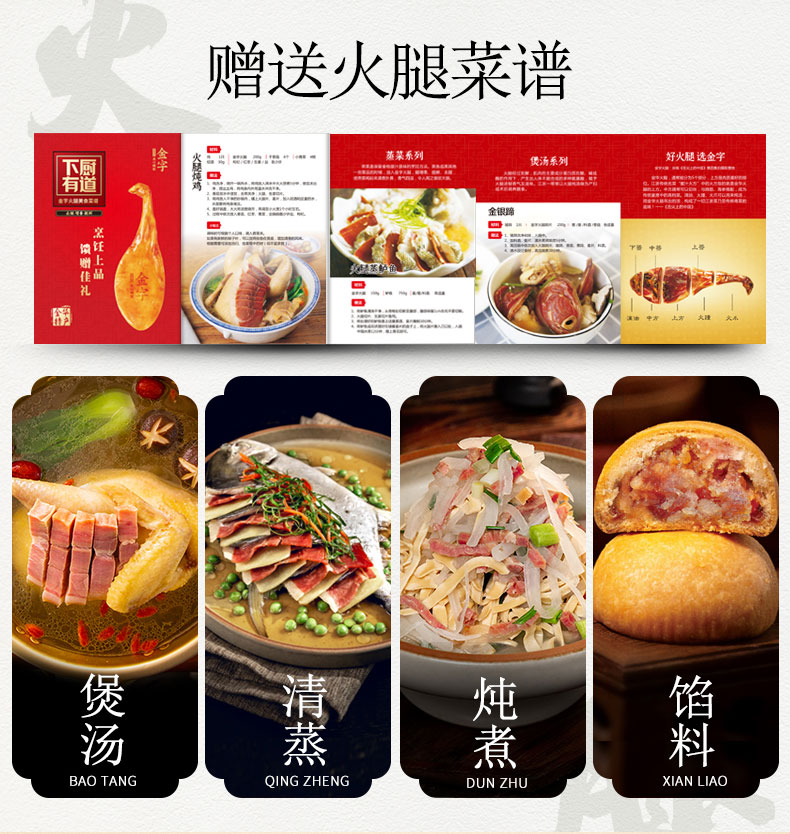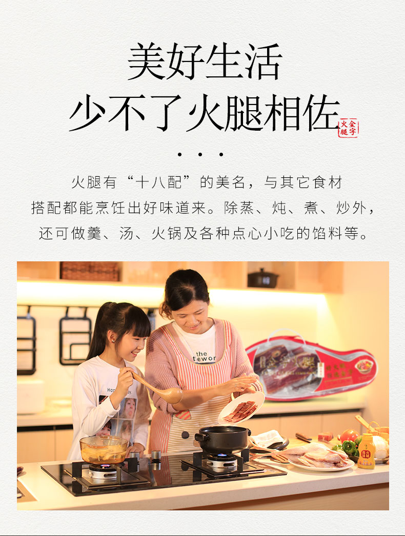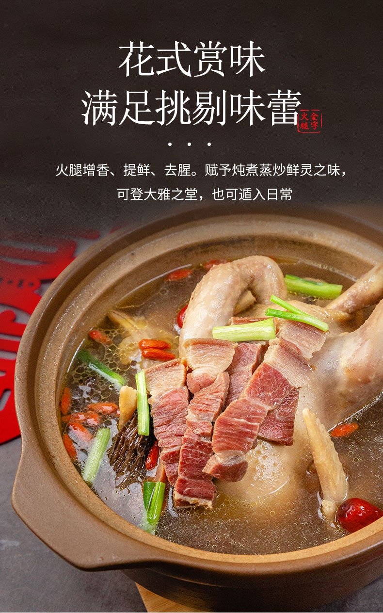 《舌尖上的中国》推荐金华金字火腿,经过精细分割,每块真空包装锁鲜,使用时温水洗净,可切丝、片、丁等,蒸炖皆宜。精美礼品袋装,自用送礼两相宜。