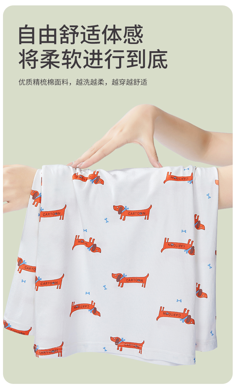 100%新疆长绒棉面料,经过精梳处理,去除杂质和短纤维,相比普通棉面料更柔顺亲肤,吸湿透气性好,不易闷热捂汗,先进环保印染技术,A类无荧光,面料自带微弹力,居家穿着健康舒适。