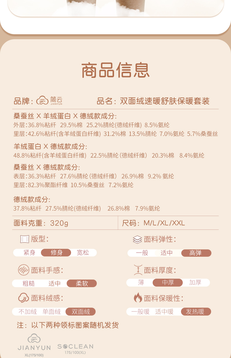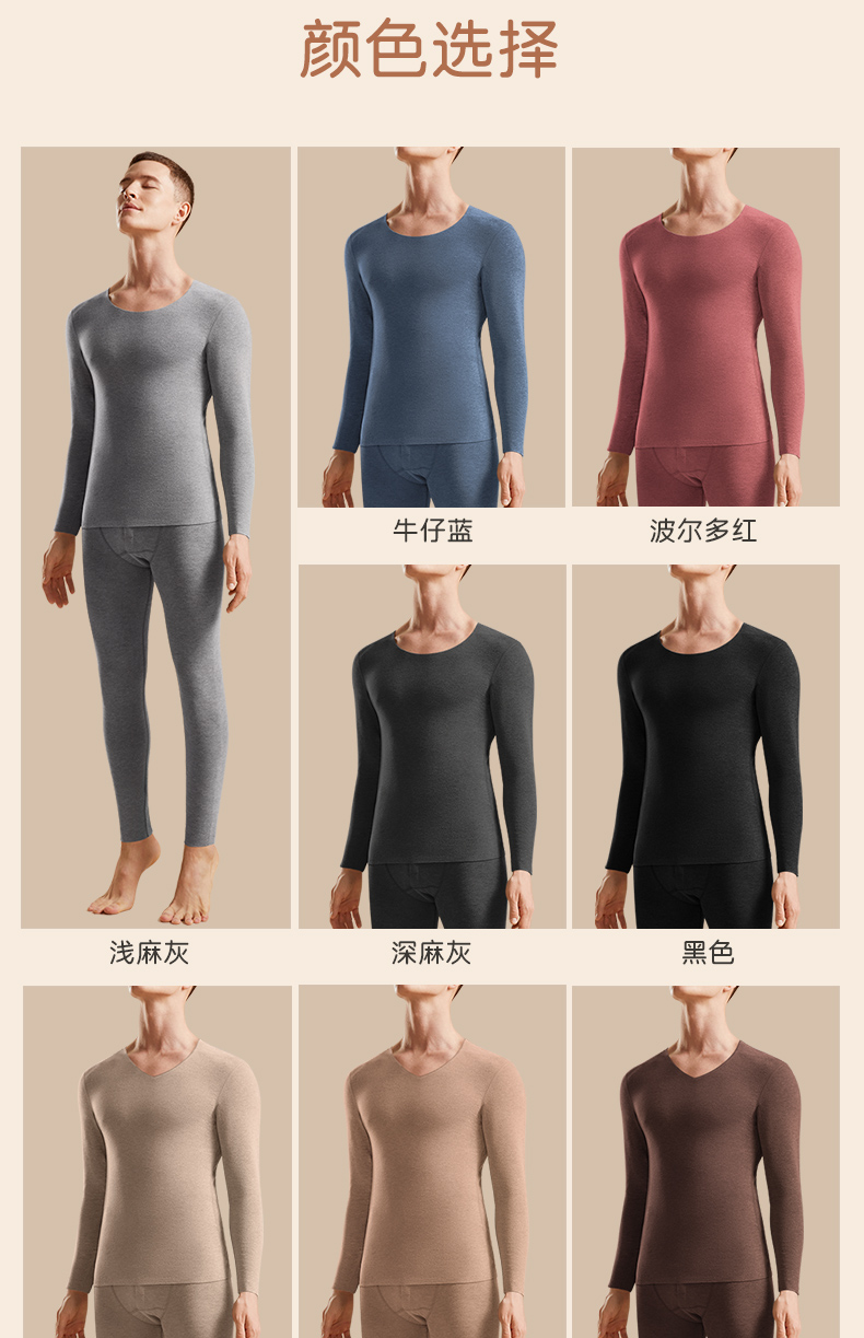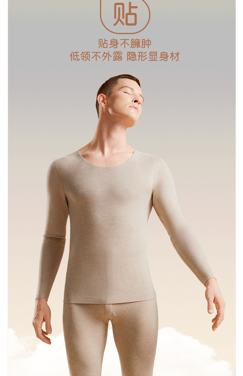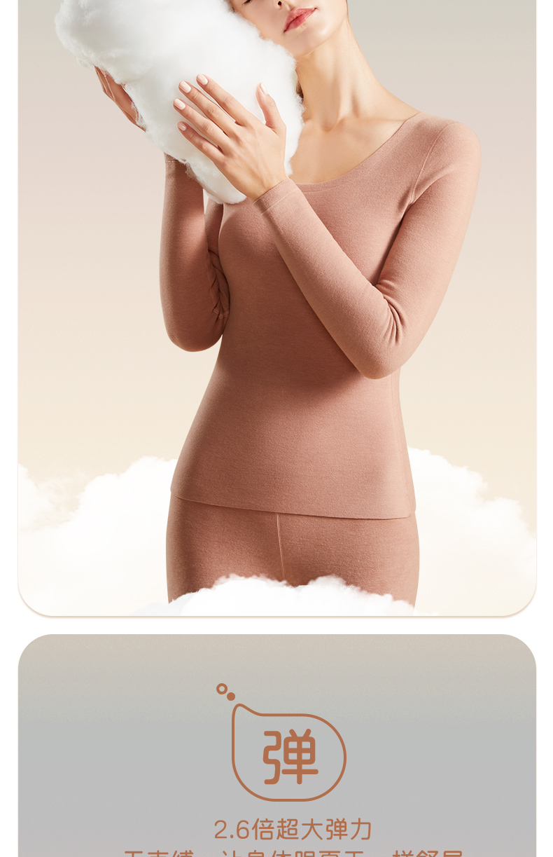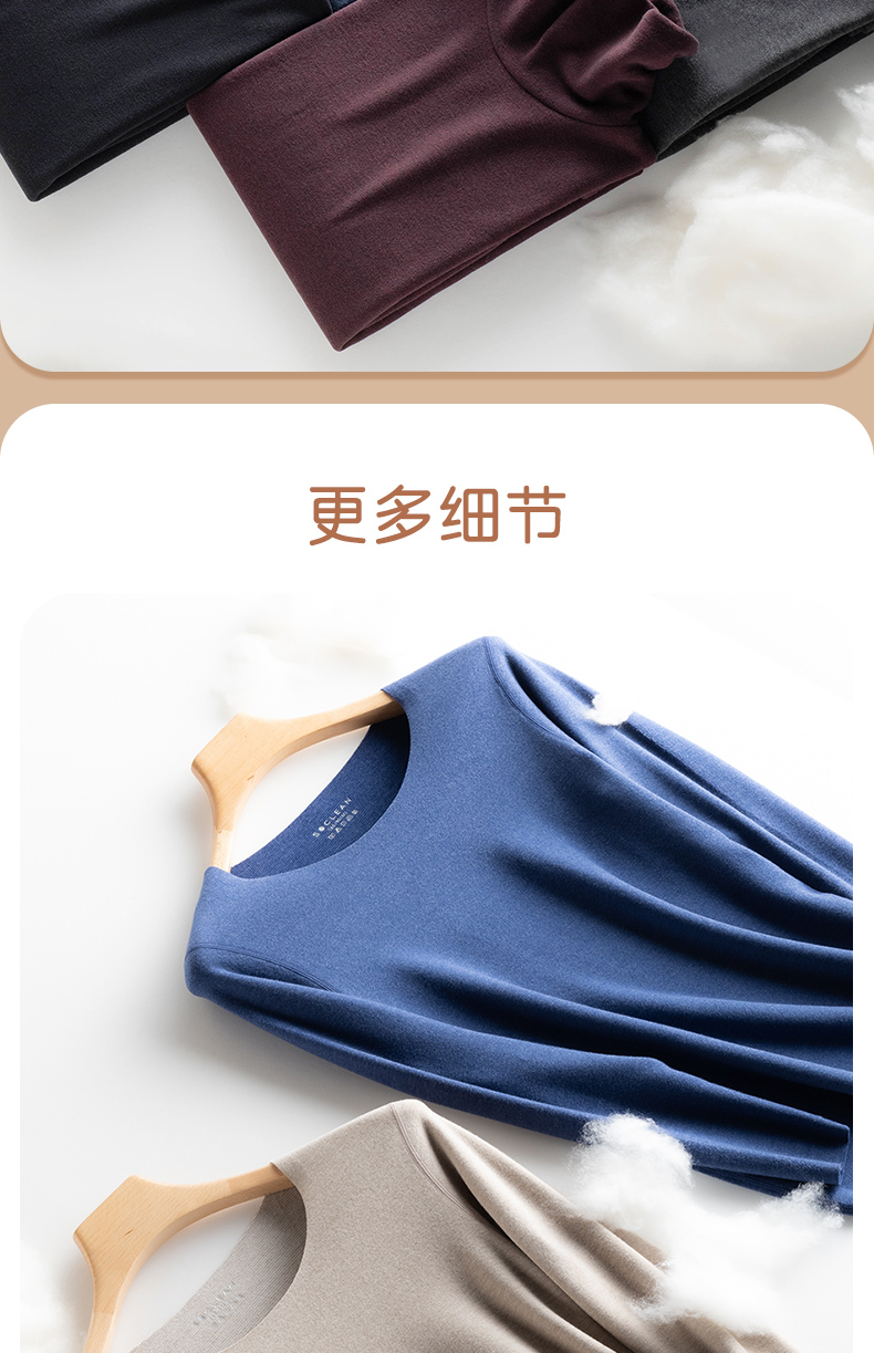 这款保暖内衣,面料采用粘纤37.8%、腈纶27.5%、棉26.8%、氨纶7.9%四种纤维混纺,面料有着比棉更柔软的触感,且吸湿性好,穿着透气舒适,不易起皱,双面磨绒处理贴身穿着保暖更舒适;