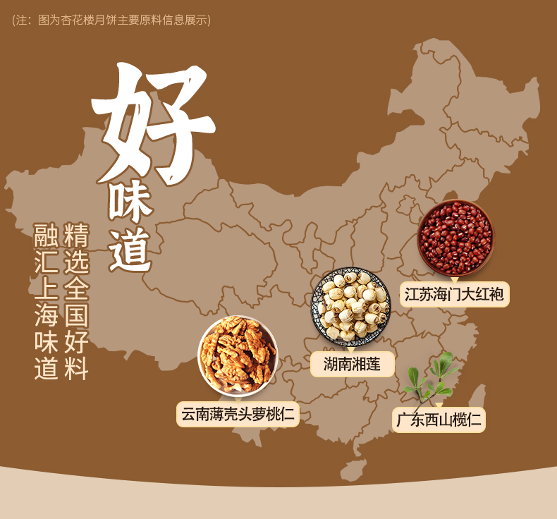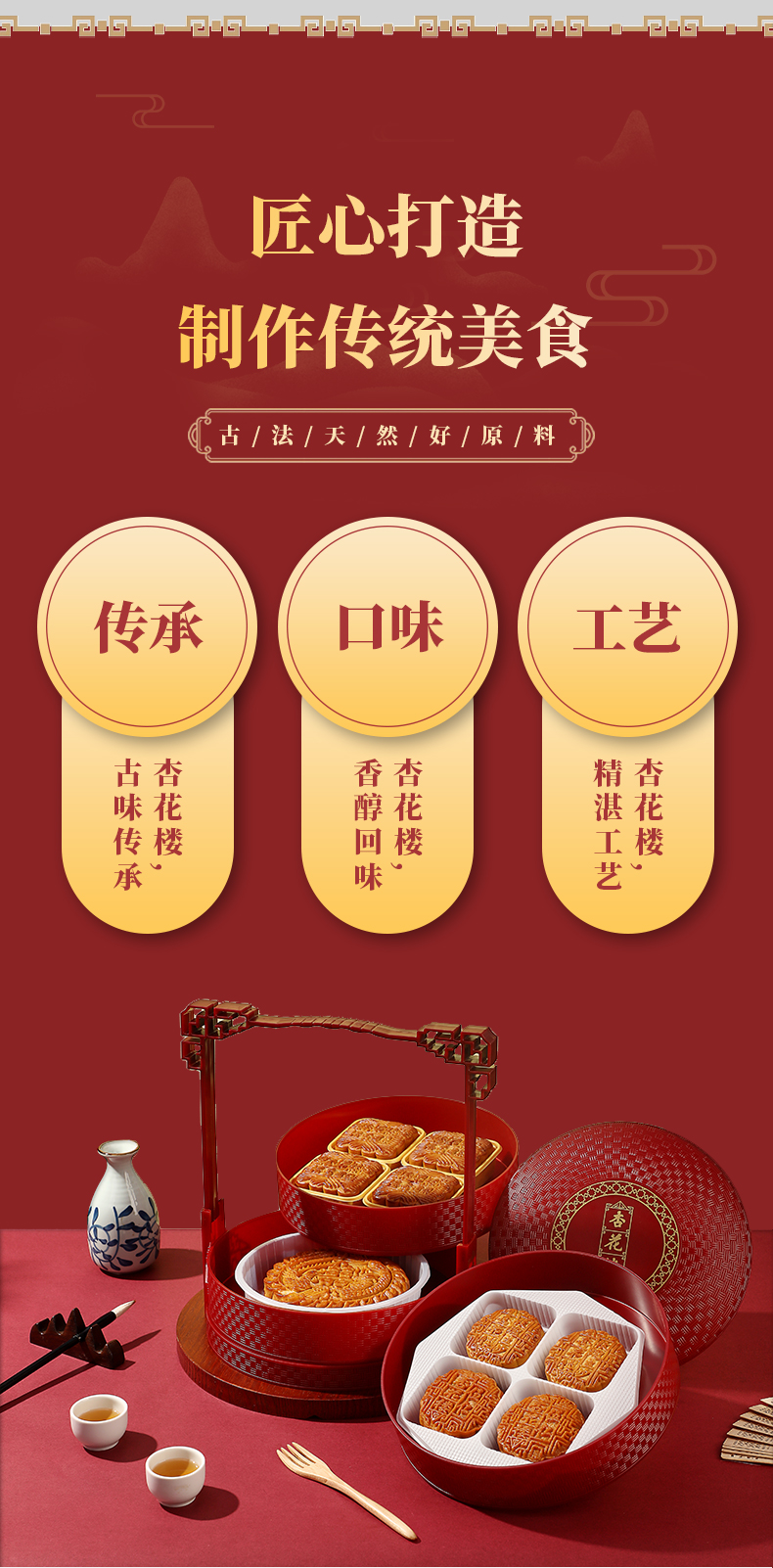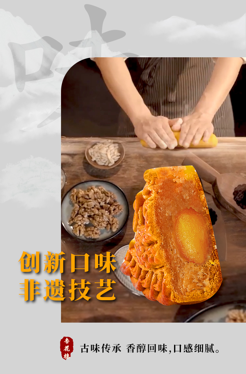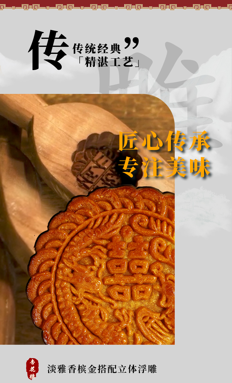 其传统的豆沙、莲芸、椰蓉、五仁已成为“四大金刚”。杏花楼最有名的豆沙必用海门的特级大红袍,莲芸一律用湖南通心湘莲,椰蓉来自海南的特级椰丝,五仁中的榄仁来自广东西山,杏仁来自新疆北山,核桃则用云南头箩核桃,其用料十分考究。精细的制作工艺,经过几代人近百年的积累,杏花楼月饼的独特配方已成为经典品牌资产。