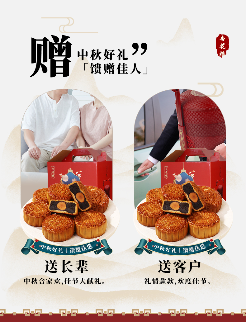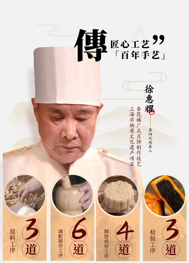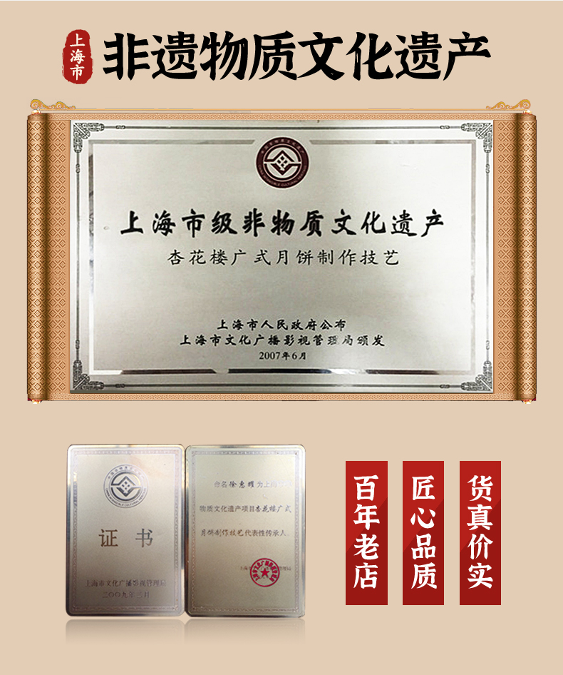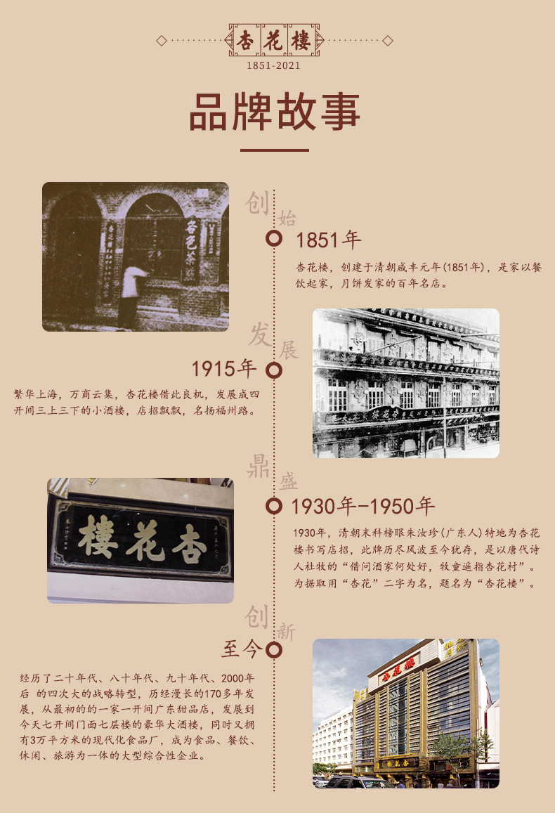 上海老字号「杏花楼」创建于清代咸丰元年(公元1851年),广东人“胜仔”开的甜品店,到如今颇具规模,享誉申城的粤菜名家。每年中秋,杏花楼月饼均占去上海月饼市场总销量的半壁江山,并出口到美国、日本、澳大利亚等国家。