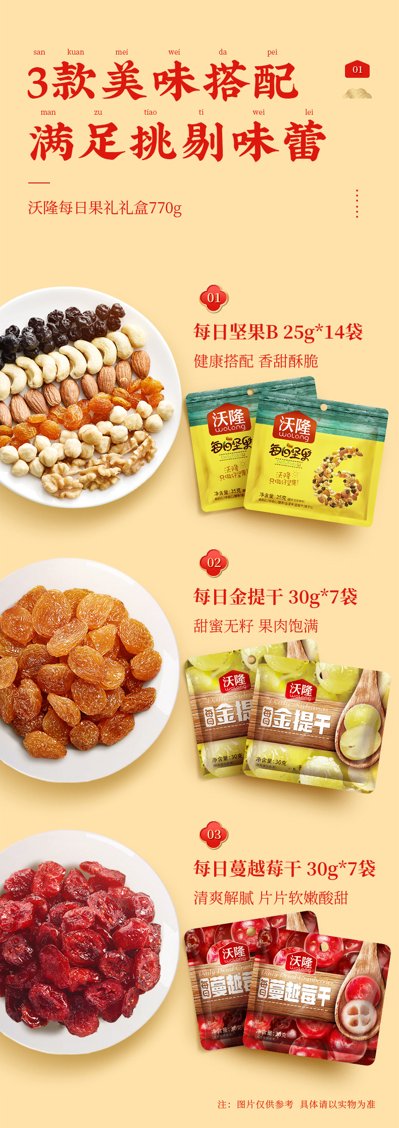 这款礼盒美味三拼:包含每日混合坚果果仁B25g*14袋(扁桃仁26%、核桃仁20%、腰果仁18%、金提干14%、榛子仁10%、蓝莓干12%)、金提干30g*7袋、蔓越莓干30g*7袋。味道自然纯正,大颗果粒,饱满看得见,新鲜无添加,健康好滋味!
