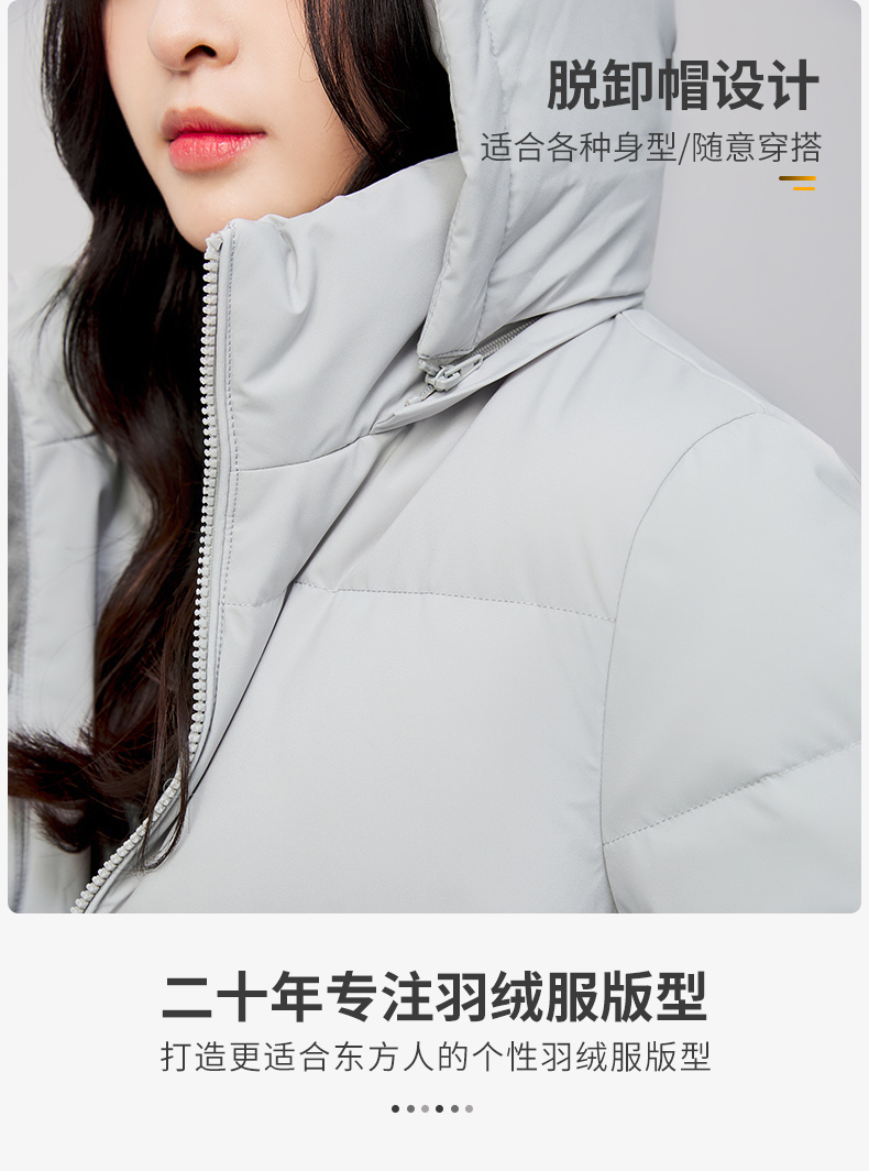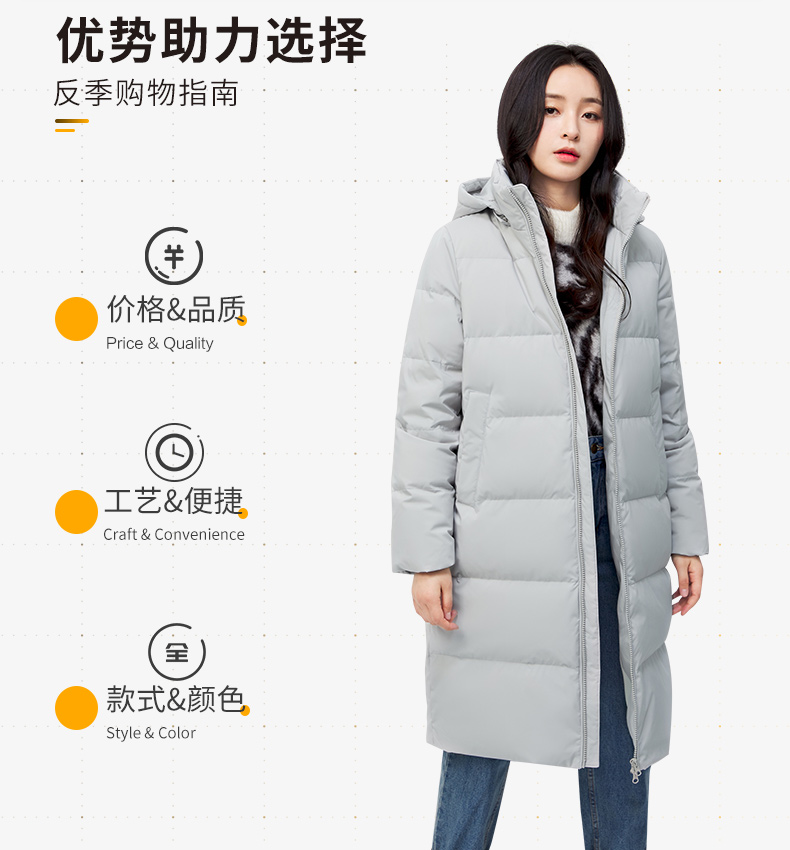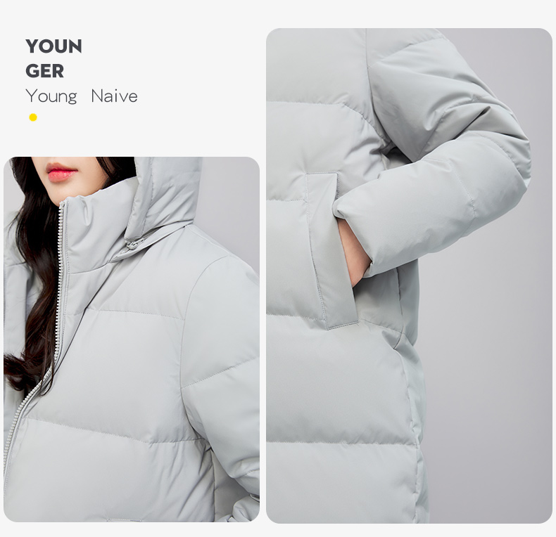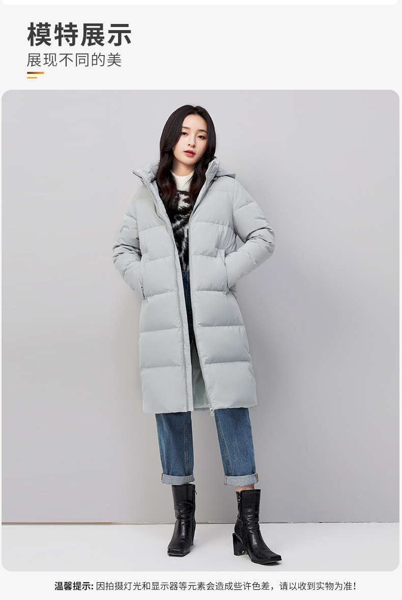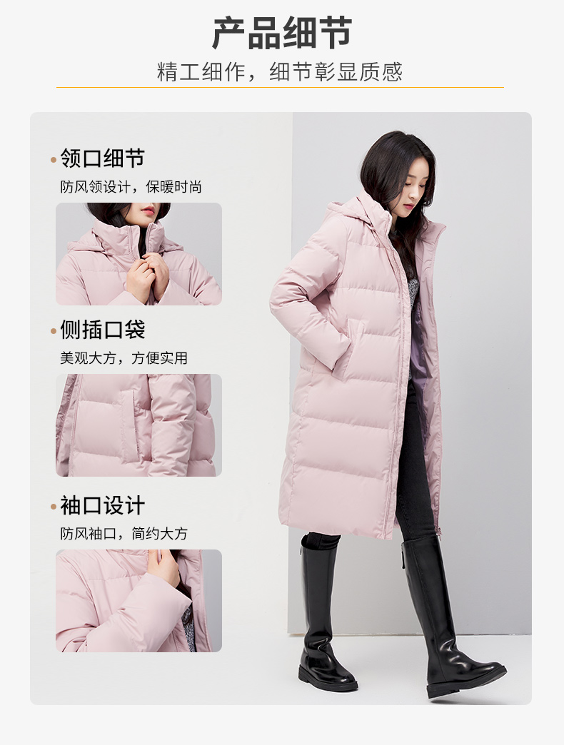这款女士羽绒服 中长款式H版型,包容随性不挑身材,弱化了羽绒服厚重感,上身显瘦,适合各种身材MM穿着,甄选15cm+高蓬白鸭绒,90%含绒量,蓬松保暖,智能分格充绒,四层锁绒工艺杜绝钻绒烦恼。