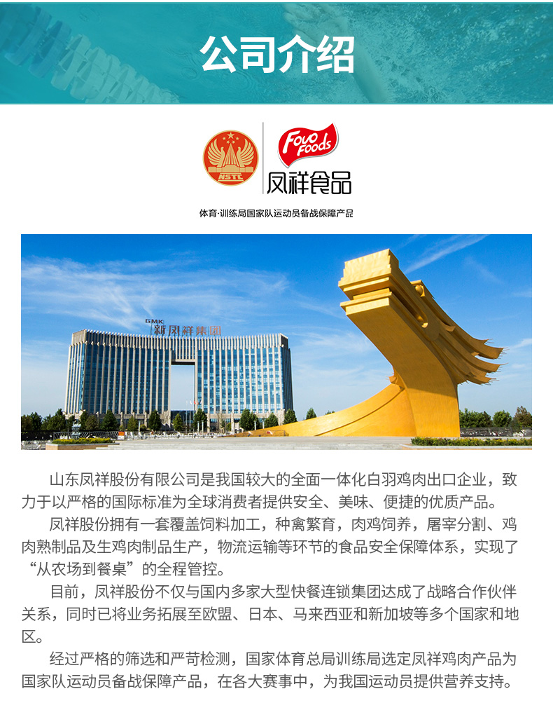 凤祥食品是肉鸡行业中产业链完整、规模较大的生产加工出口企业之一,是肯德基、麦当劳等连锁集团的战略供应商去年5月16日,凤翔的鸡肉制品还成为了国家队运动员的备战保障产品。产品远销欧盟、日本、韩国、马来西亚等20个国家和地区,通过BRC全球食品安全标准验证、IFS国际食品标准认证。