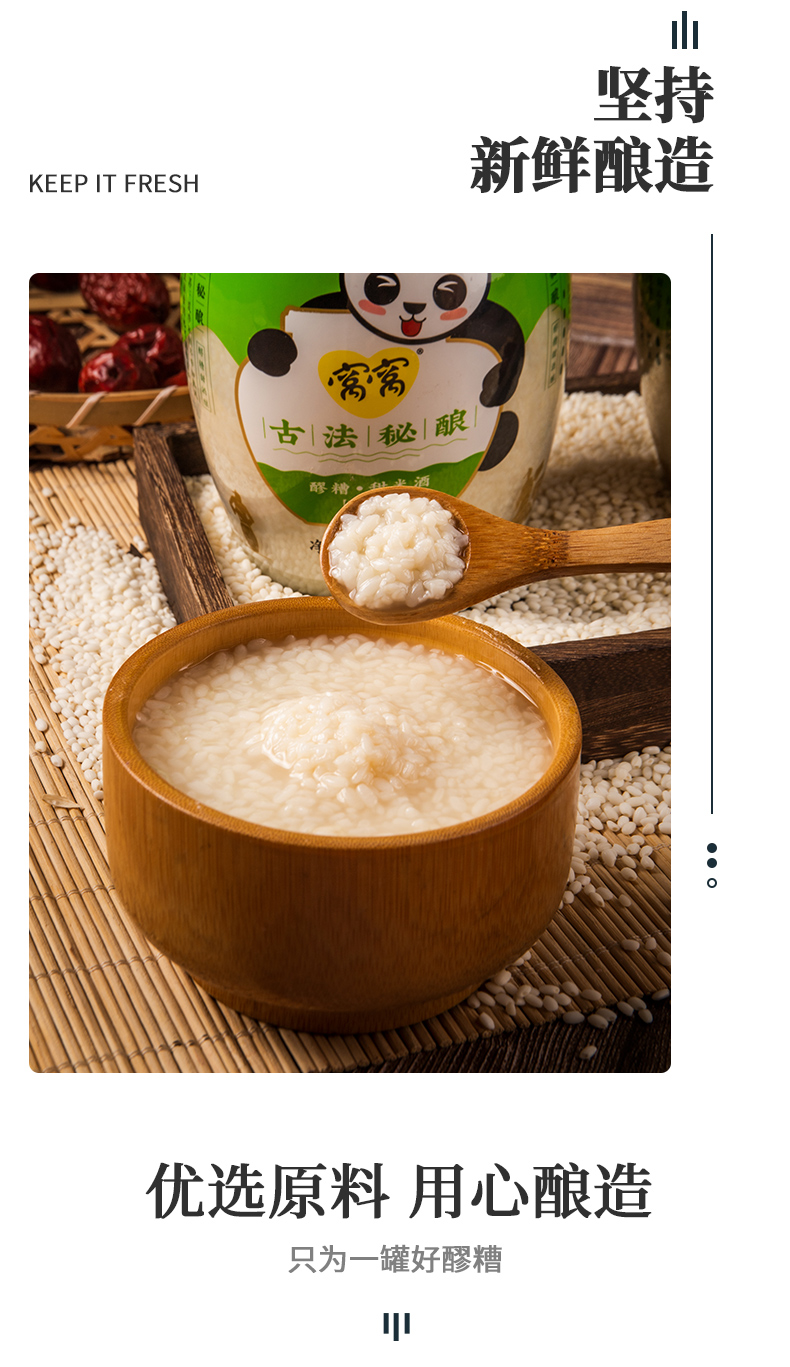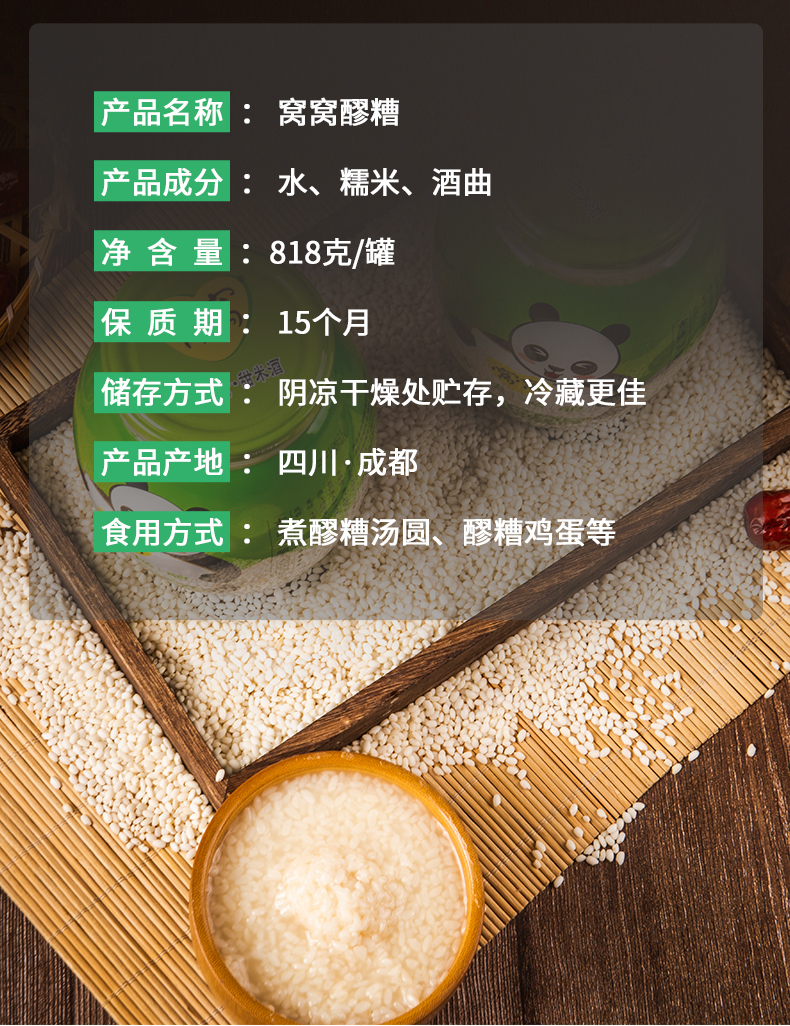 这款窝窝 醪糟糯米酒,产地四川成都,甄选优质东北大米整团发酵而成,一次性瓶装,不经过二次封装,保留了原汁原味,没有其他任何添加,也没有防腐剂。