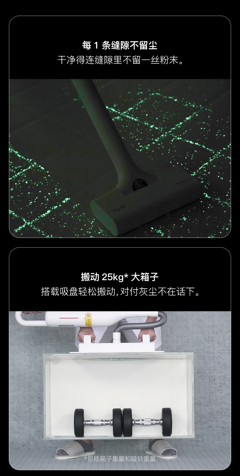 内置性能强悍的迷你电机,带动涡轮风叶瞬速带来高达8500Pa的风压,真空度可达8500Pa,相比上一代吸力提升约50%;实验搭配吸盘测试可轻松提起50斤箱子,配有二合一扁吸头、地刷、内置2200mAh锂电池,满电后能提供30分钟续航,无线使用更灵动,车载、电脑、充电宝可直接为其充电,非常方便。