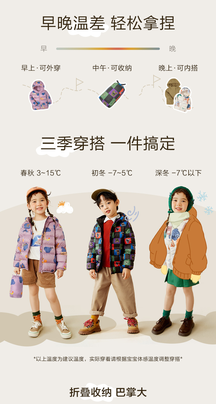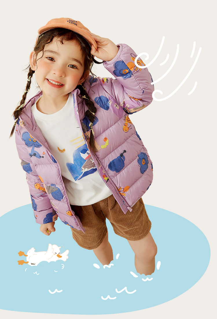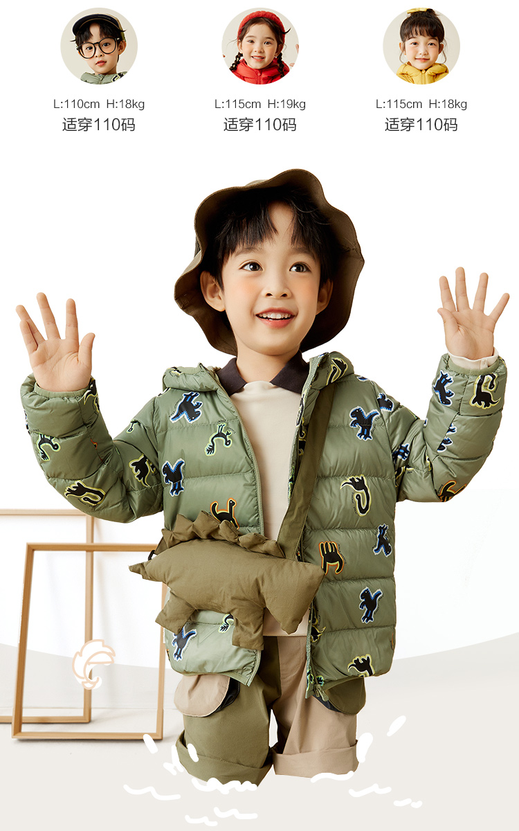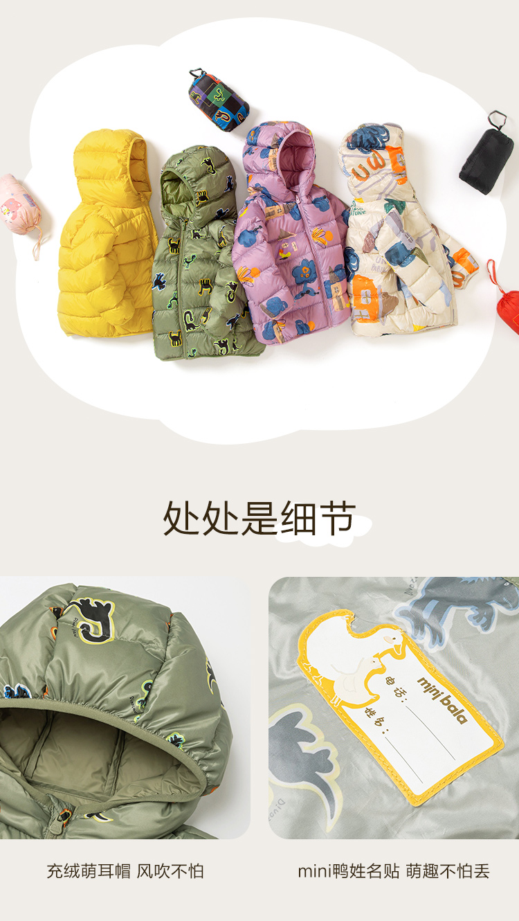 这款儿童轻薄羽绒服,防水防油污面料,色泽鲜亮,透气性好,新国标90白鸭绒,绒子含量85%,羽绒蓬松,舒适保暖,6重锁绒技术、20+道净味工序,呵护健康,无异味不跑绒,时尚卡通印花设计,充满萌趣,小朋友喜欢。内置收纳袋,轻松收纳方便携带。