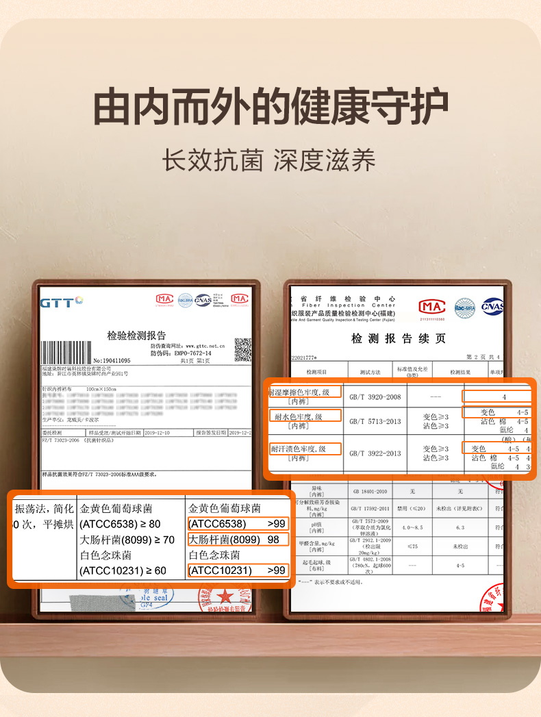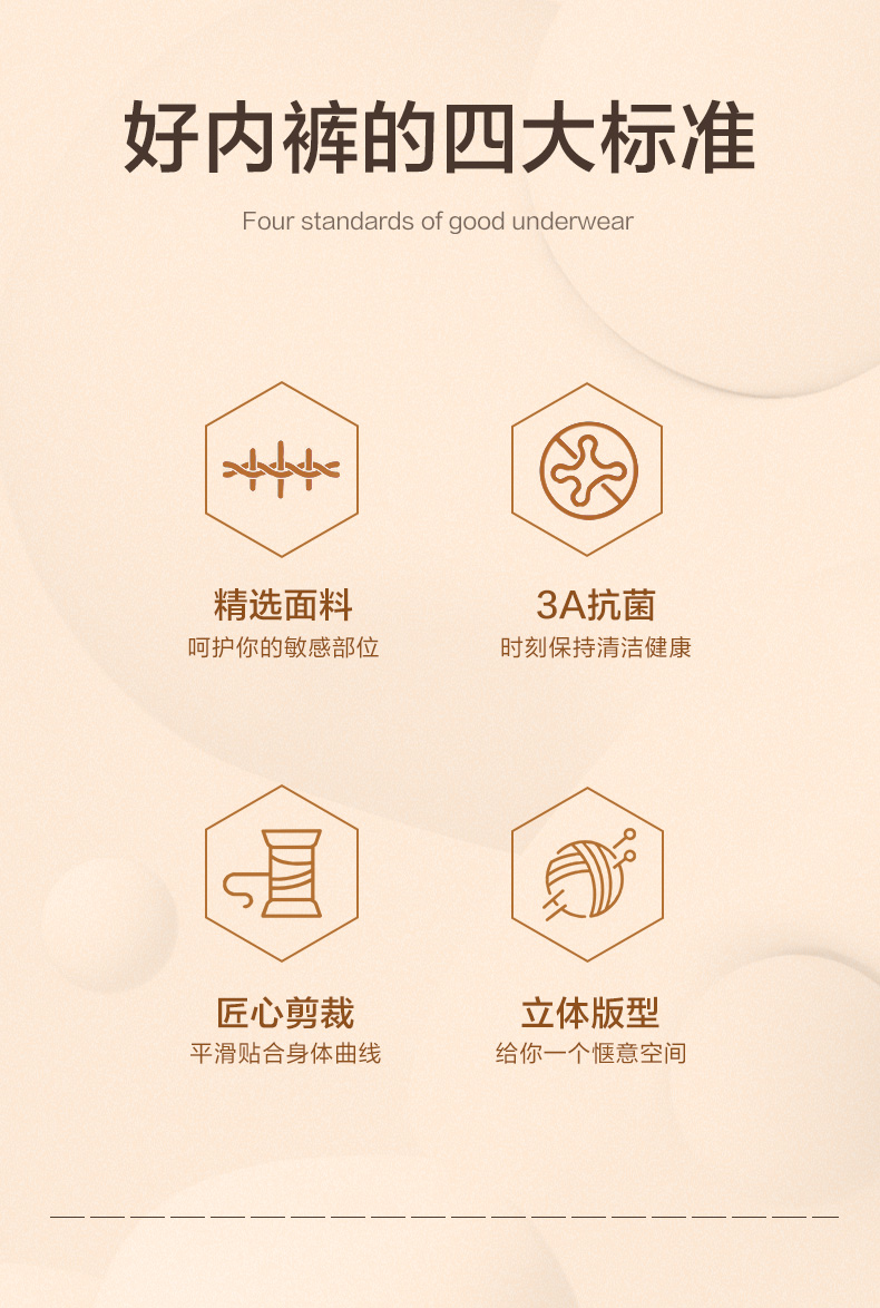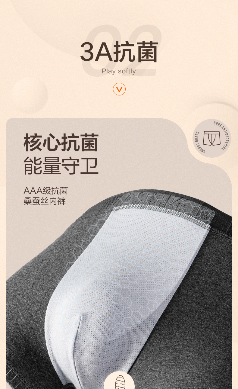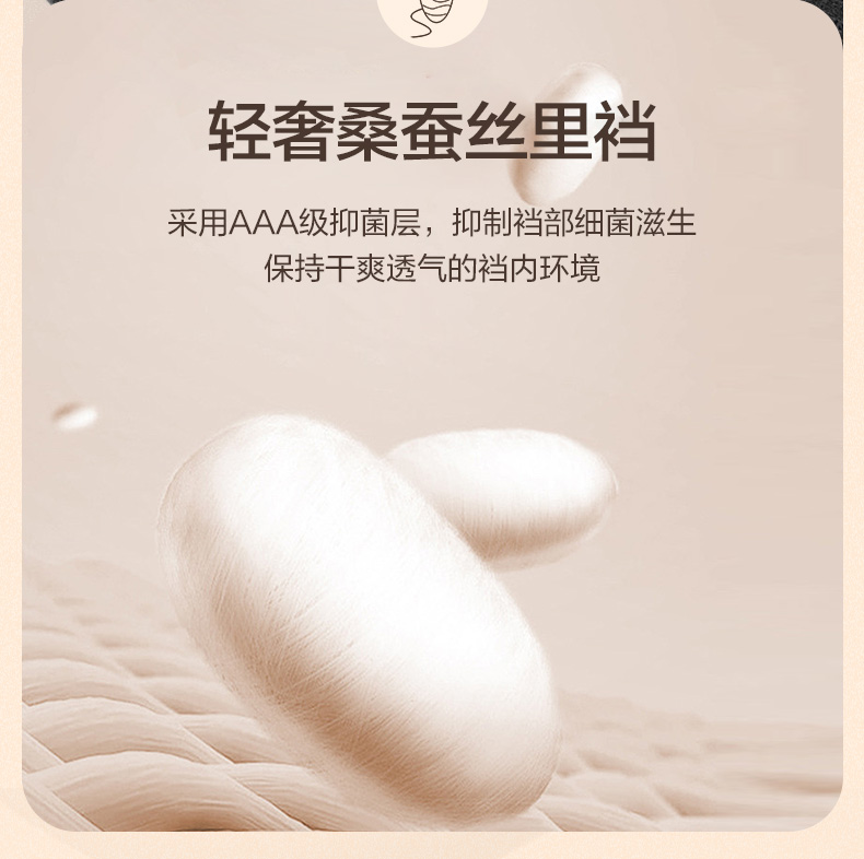 内档采用82%粘纤+10.3%桑蚕丝+3.5%聚酯+4.2%氨纶混纺,在融入石墨烯抗菌技术、亲肤透气,导湿速干,亲肤呵护重要部位,长时间保持干爽舒适,