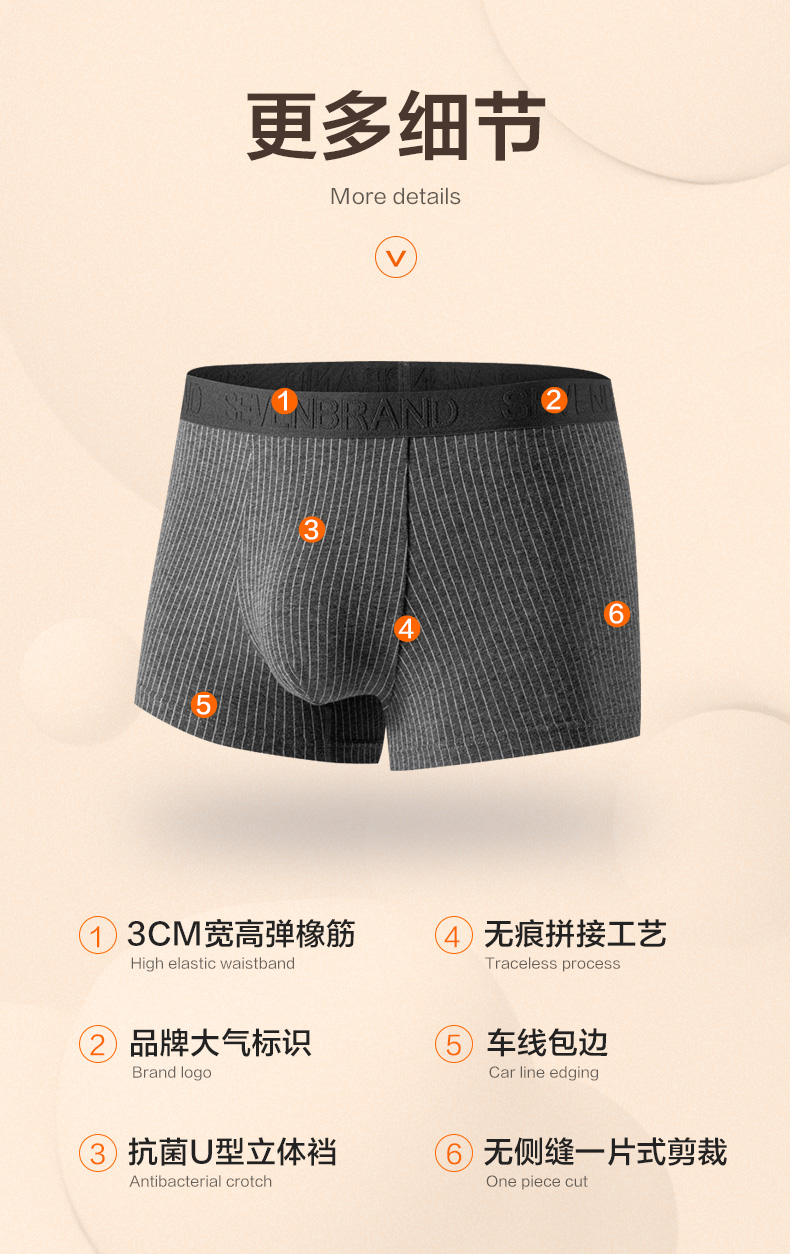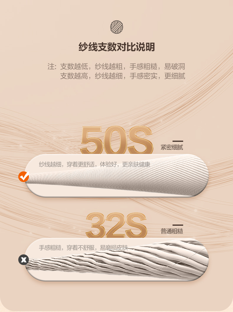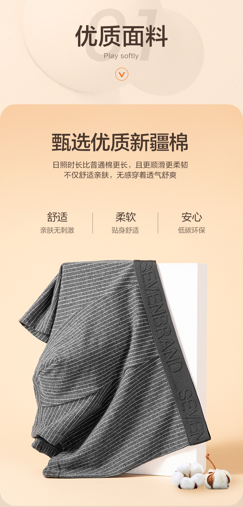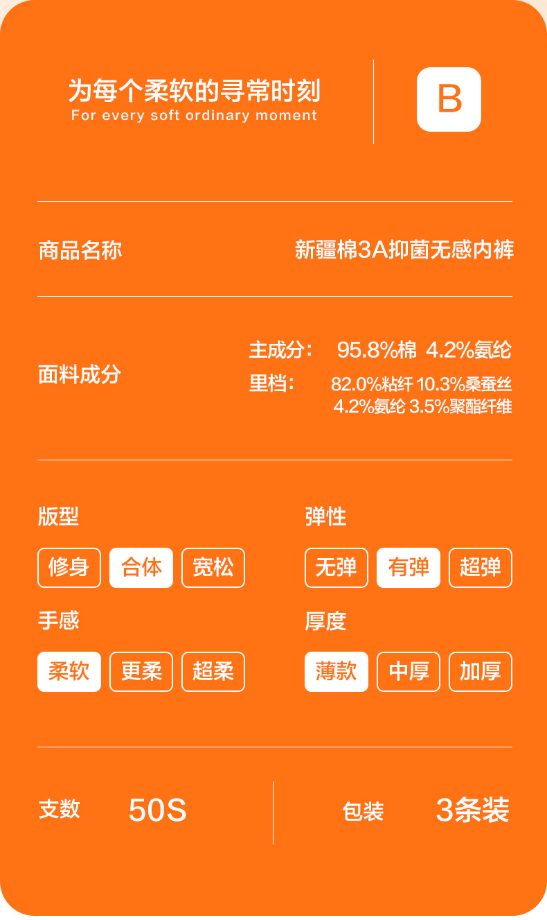 这款男士 内裤,采用95.8%新疆长绒棉+4.2%氨纶混纺,并采用50支高支工艺织成,相比普通棉,手感柔软细腻,吸湿性和透气性良好,不易起球褶皱,穿着亲肤舒适。