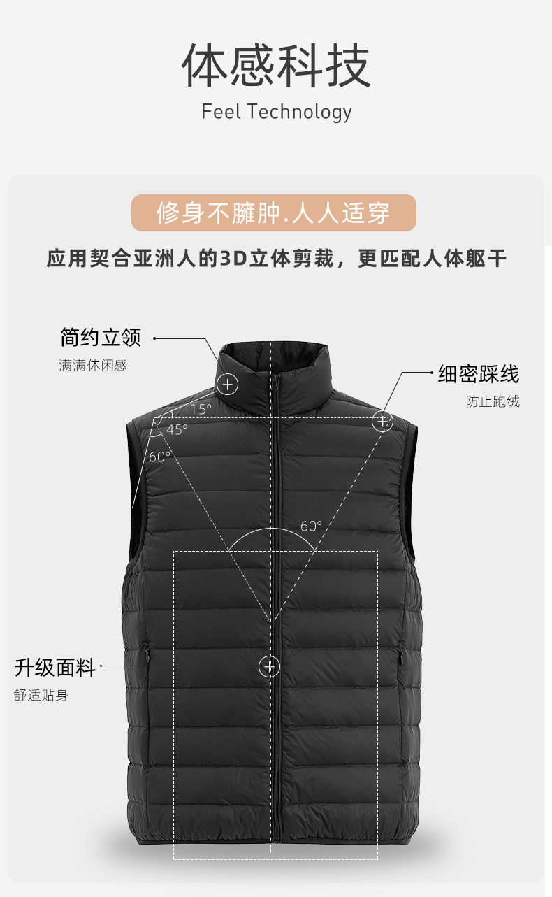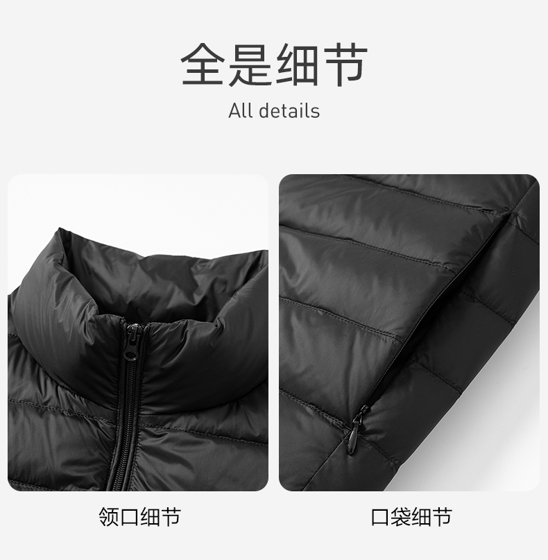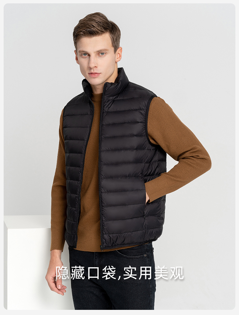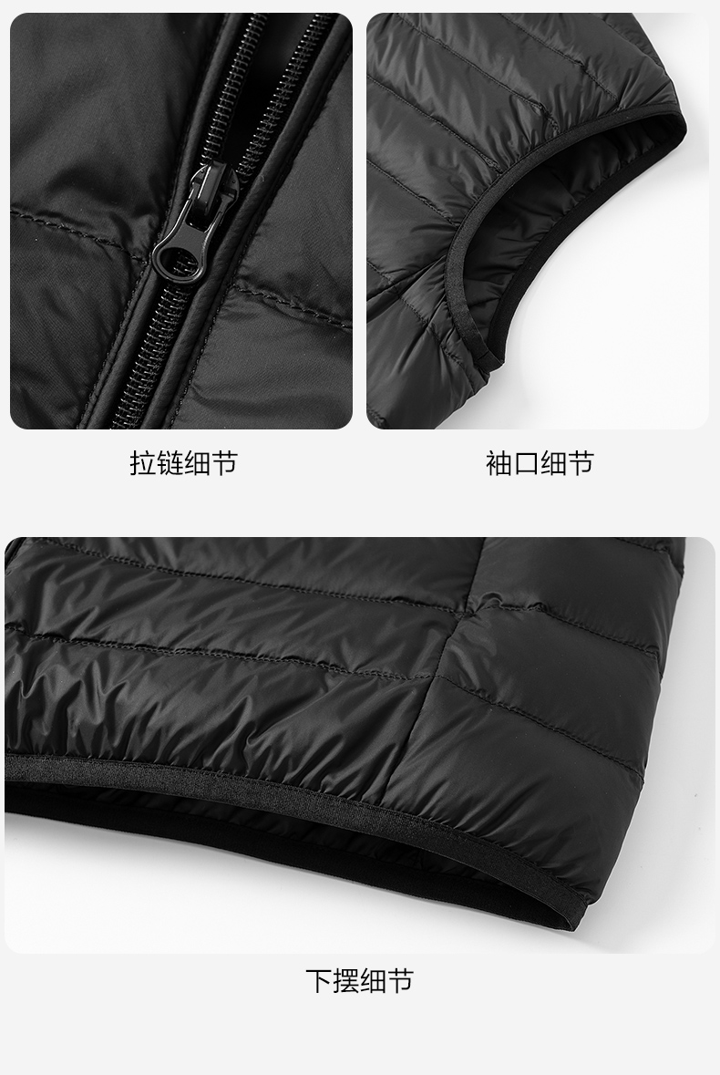 这款羽绒马甲,高密微防水面料,不惧细雨、小雪、雾气、内充17cm+大绒朵白鸭绒,90%含绒量,历经12道消毒工艺,上身轻盈保暖不臃肿,时尚小立领设计,袖口下摆弹力收口,贴合舒适,锁温保暖非常适合入秋转凉穿着,可搭配毛衣、卫衣、衬衣等都好看。