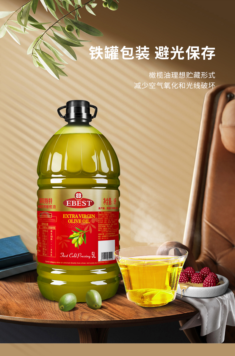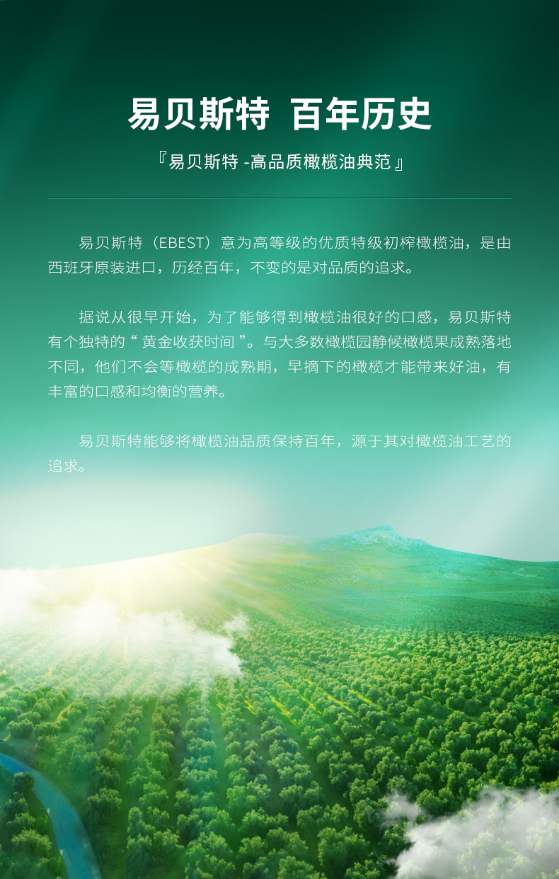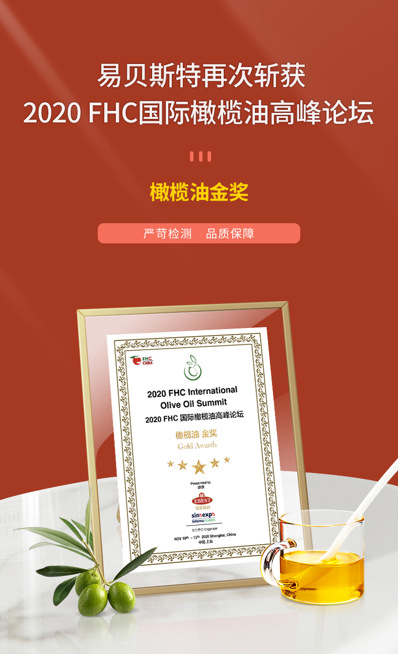 西班牙大使馆推荐品牌,易贝斯特源自西班牙百年工厂F.Faiges,SL.橄榄油集团,拥有万余公顷橄榄私家庄园,传承了近百年生产工艺。轻油烟,口感清淡不油腻,营养均衡,满足家庭所需,适用于全年龄段。
