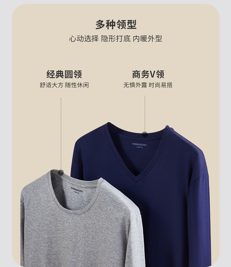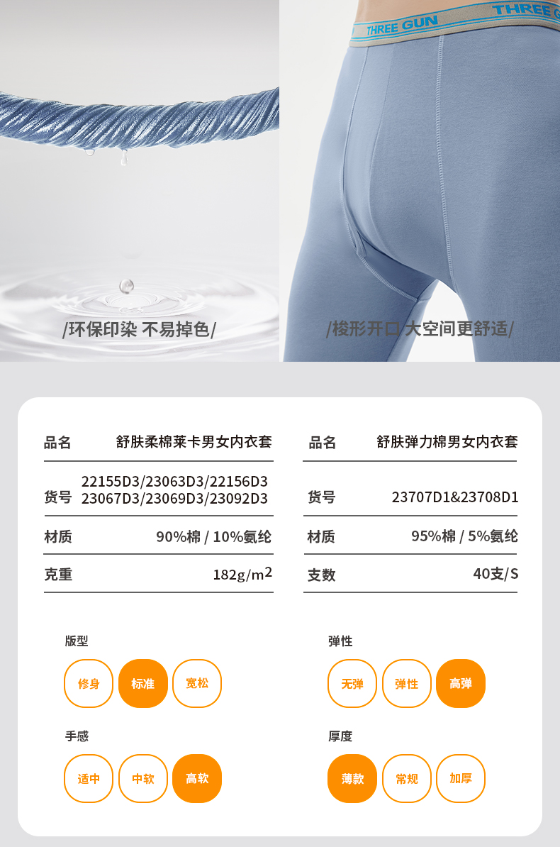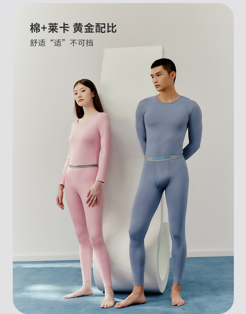 这款三枪 男女秋衣秋裤套装,选用90%棉+10%弹力莱卡混纺制成, 拥有棉质品的特性,但是弹力更好,上身更舒适不束身。