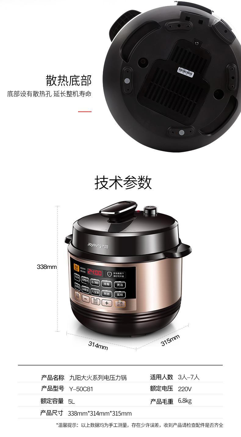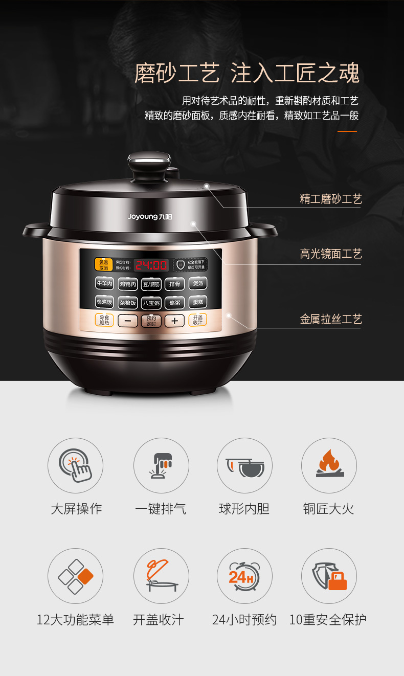 九阳的这款电压力锅,优雅黑和香槟金搭配,带有金属拉丝工艺,更加具有美感,很时尚。触屏大按键面板,有12大常用菜单,标准饭、煮粥、煲汤、排骨、鸡鸭肉、牛羊肉、豆蹄筋、八宝粥、蛋糕;