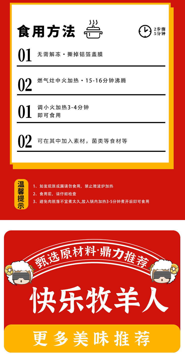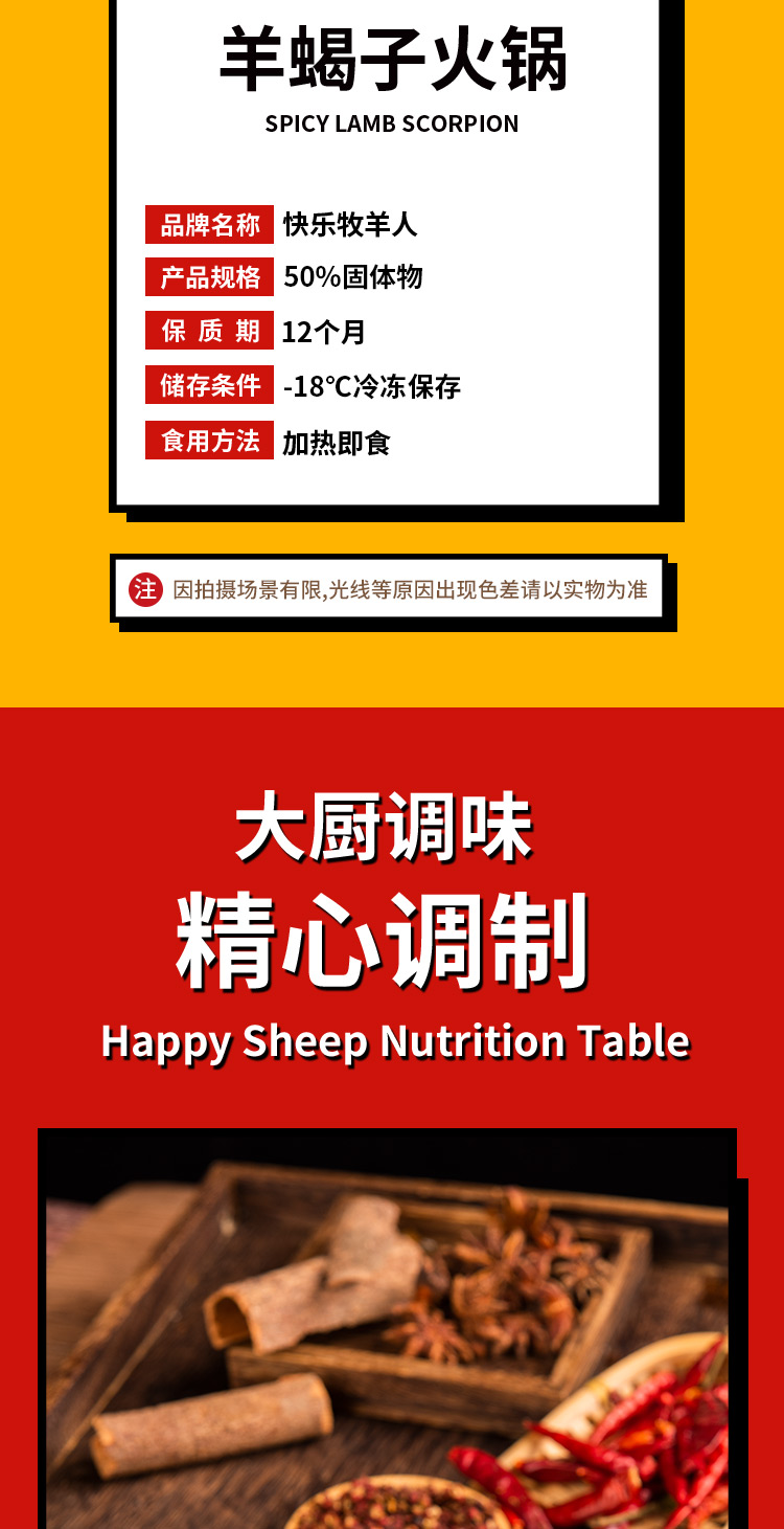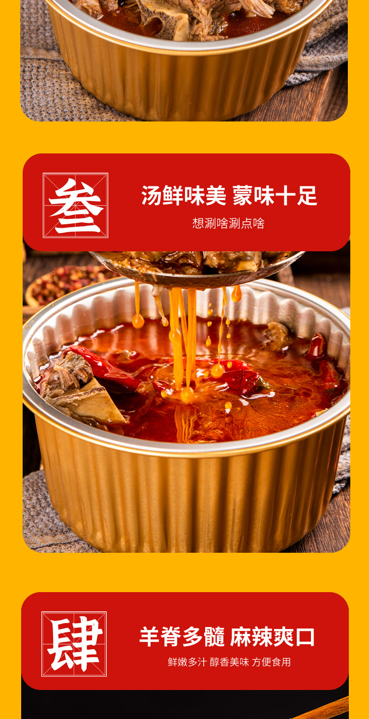 【快乐牧羊人】甄选食材,加热即食,大厨调制,甄选新鲜羊蝎子,50%固形物,味道香醇,看着食欲满满就想吃,速享美食,只需几分钟,每一口都品得到那熟悉的烟火气。