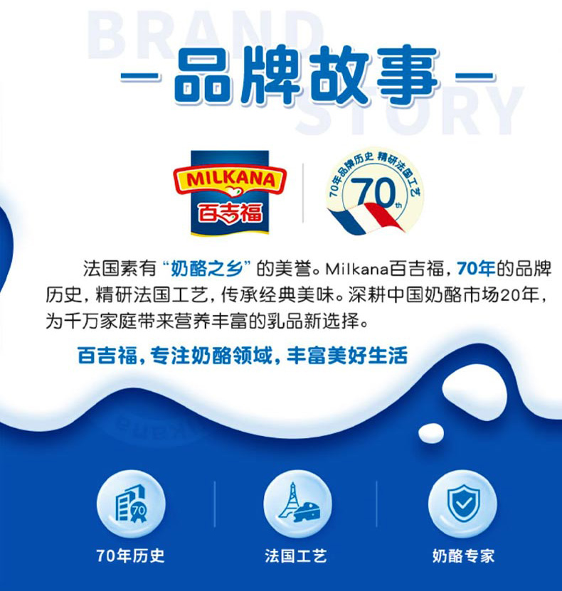 Milkana百吉福是法国Savencia集团旗下知名的奶酪品牌,拥有六十年的奶酪制作历史和世界知名的各种奶酪生产工艺。全世界有100多家具有标准的生产机构,提供品类繁多、营养丰富、味道鲜美的奶酪产品。2011年的销售额超过39.8亿欧元,在欧洲及世界的奶酪供应占大量份额。