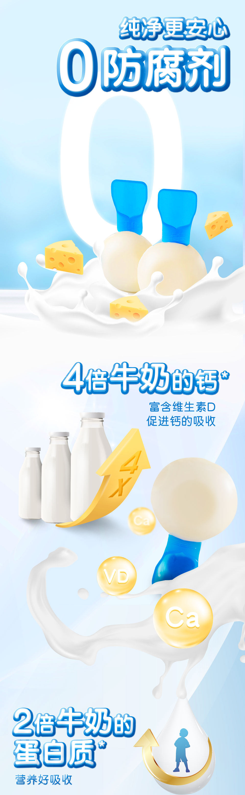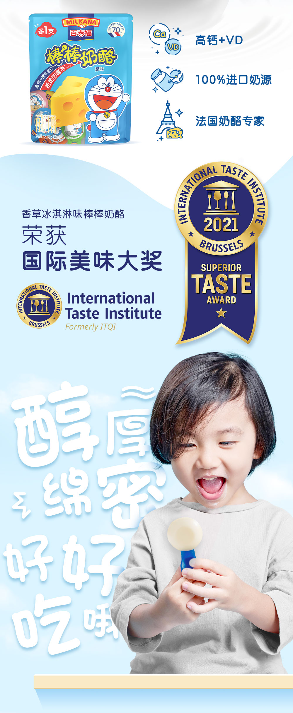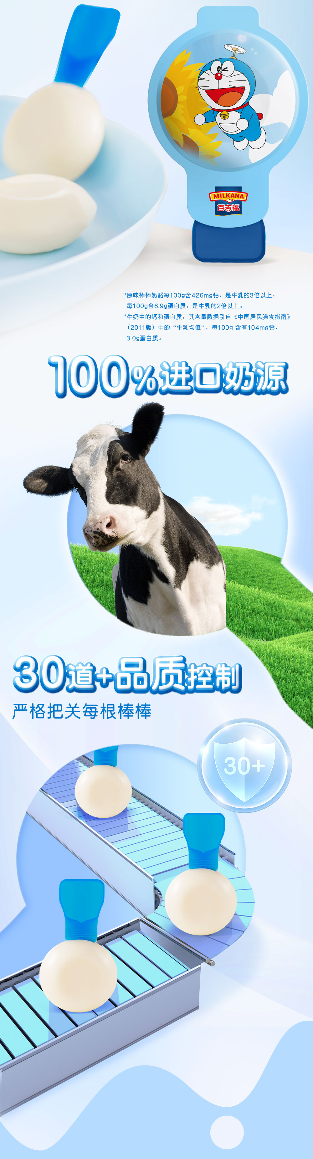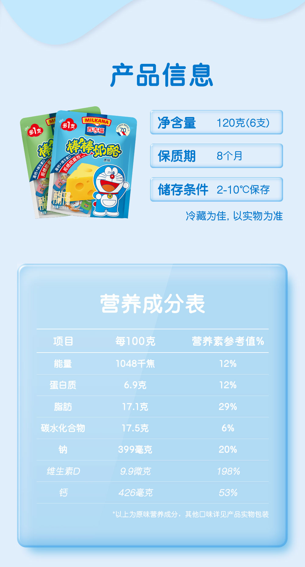 精选进口奶源,每100g含340mg钙含量,约是牛乳的3倍,蛋白质含量6.8g,约是普通牛奶的2倍,奶香浓郁,入口细腻香甜,营养又美味,孩子超喜欢。采用欧洲进口原装内膜封装保鲜,奶酪棒与外壳分开封装使用更安心。