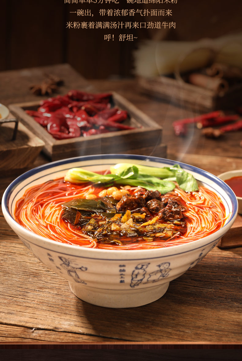 这款李子柒 红油牛肉绵阳米粉,绵阳特色风味,精选直径约0.7毫米米粉,软糯的米粉,裹着色泽红亮,醇厚鲜香的汤汁,还添加了劲道的牛肉颗粒,可煮可泡5分钟即享地道的绵阳米粉。