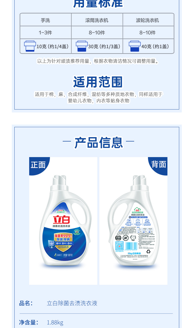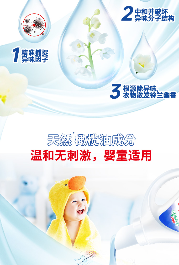 立白除菌去渍洗衣液,德国巴斯夫研发灭活除菌成分,除菌率99.9%,天然更洁净,还添加了天然椰子精华、天然柠檬酸、进口铃兰花香因子,天然洁净因子,高效去污除螨,去除异味持久留香。