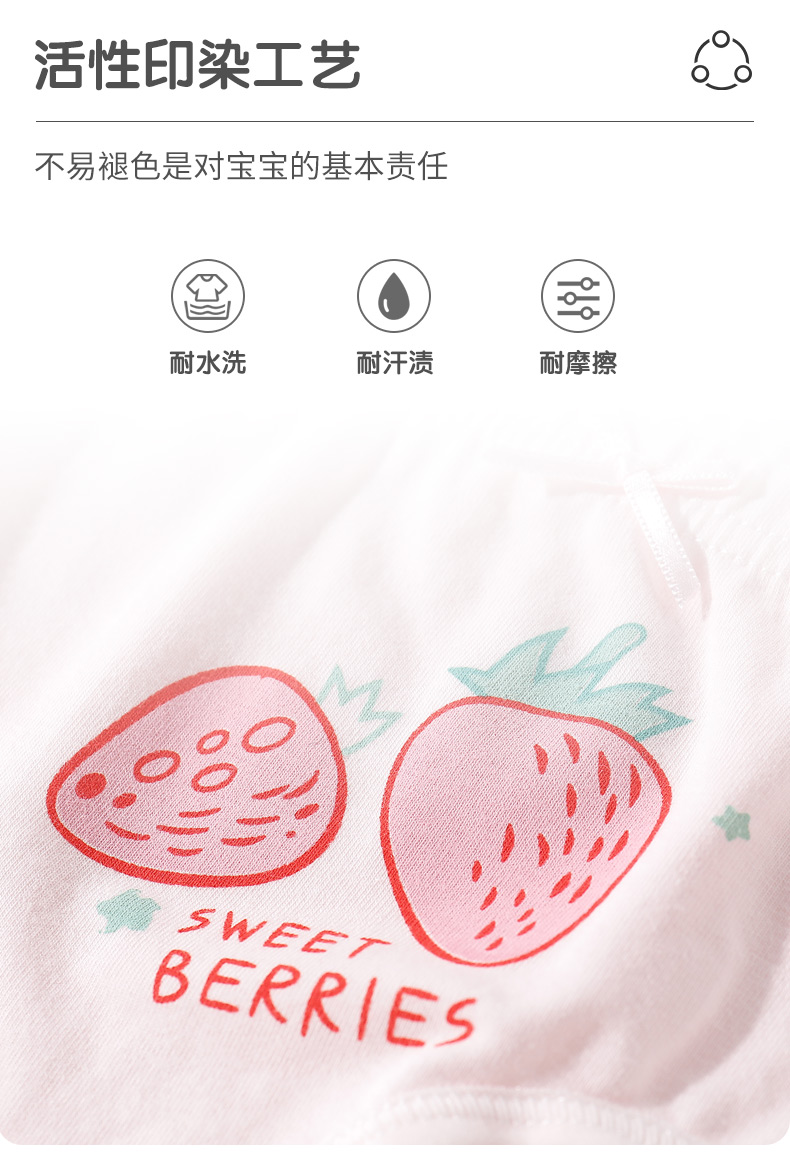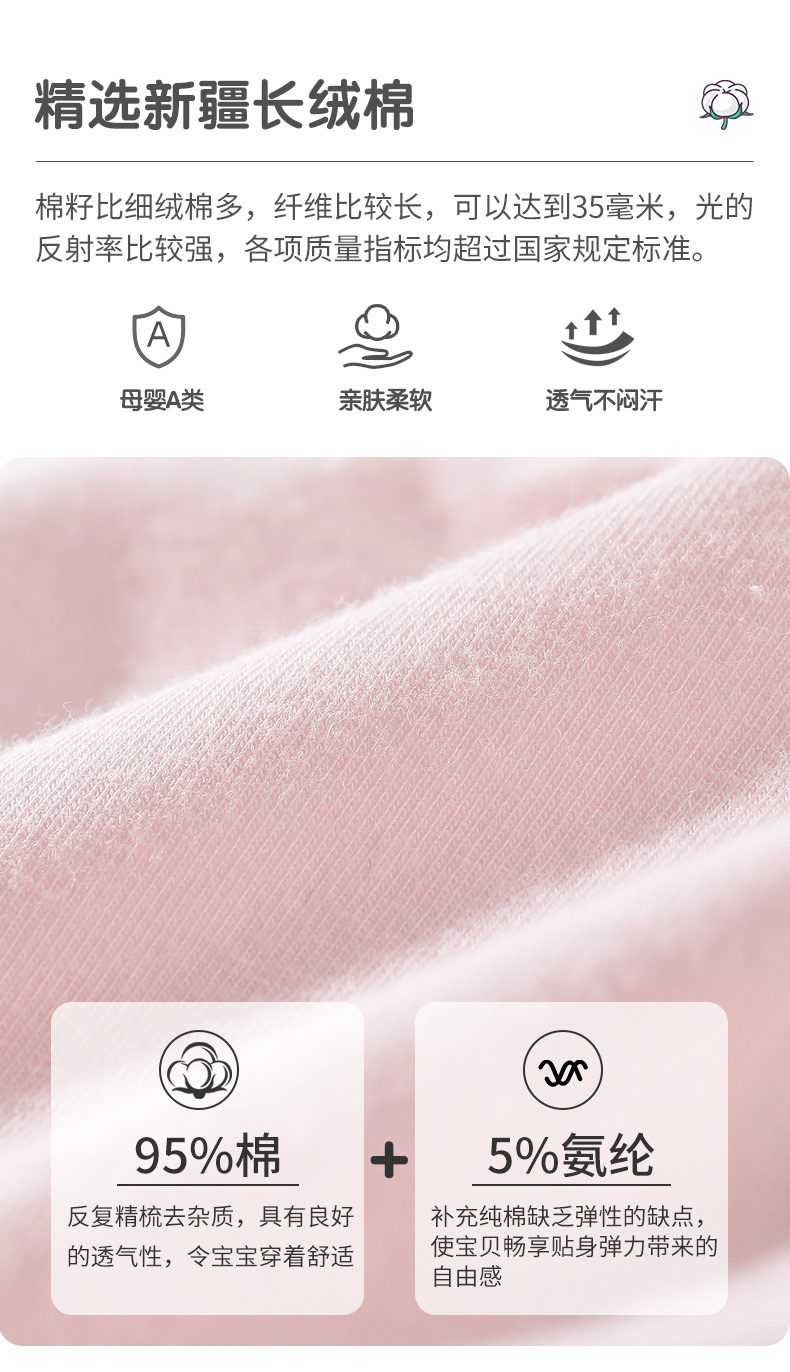 十年潜心研制儿童内衣品牌,A类标准,精选甄选 新疆长绒棉,精梳处理去除短纤维和杂质,相比普通棉面料,更加柔软顺滑,不易起球不易掉色,上身舒适度更好,面料还添加5.9%氨纶增加弹力,3D剪裁贴合舒适度会更好!活性印染,不刺激宝宝娇嫩肌肤,图案很洋气,很讨小朋友喜欢。