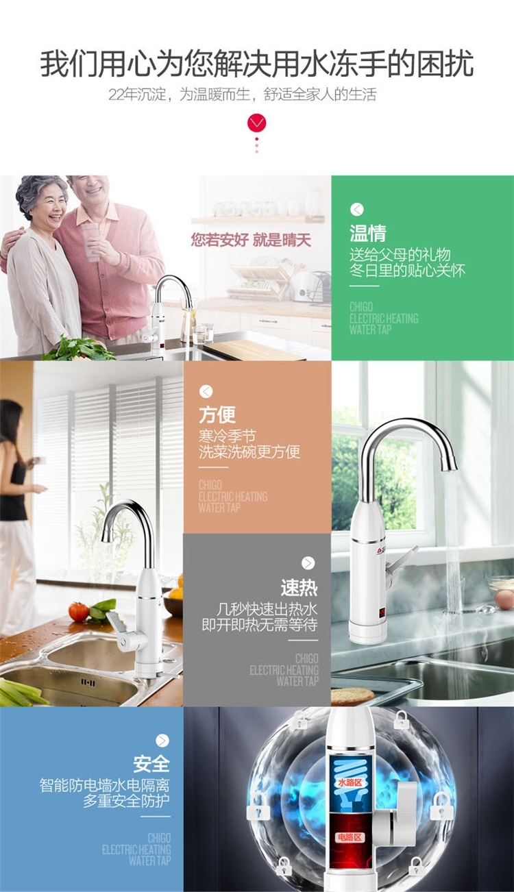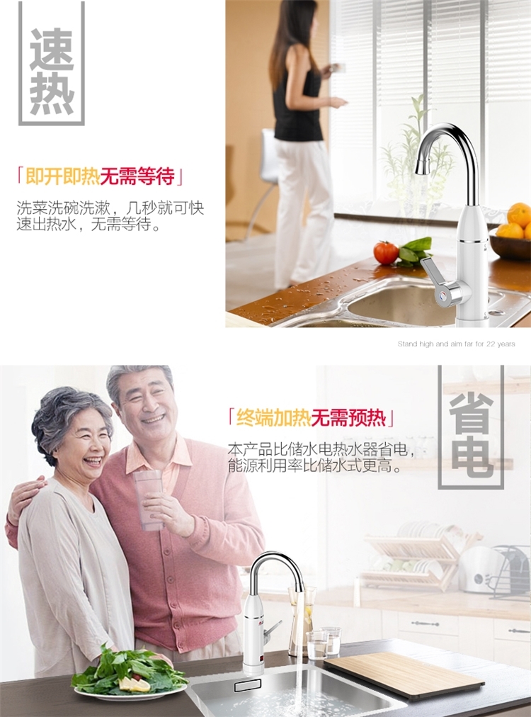 电热水龙头是专为无法正常供热的厨房/洗手间设计的,是厨房洗菜、洗碗、清洁,卫生间洗手、洗脸、洗头、洗衣等热水方便使用的最佳选择。它解决了家庭生活及公众场所对热水的日常需求,使你的家庭365天24小时方便的使用到热水。