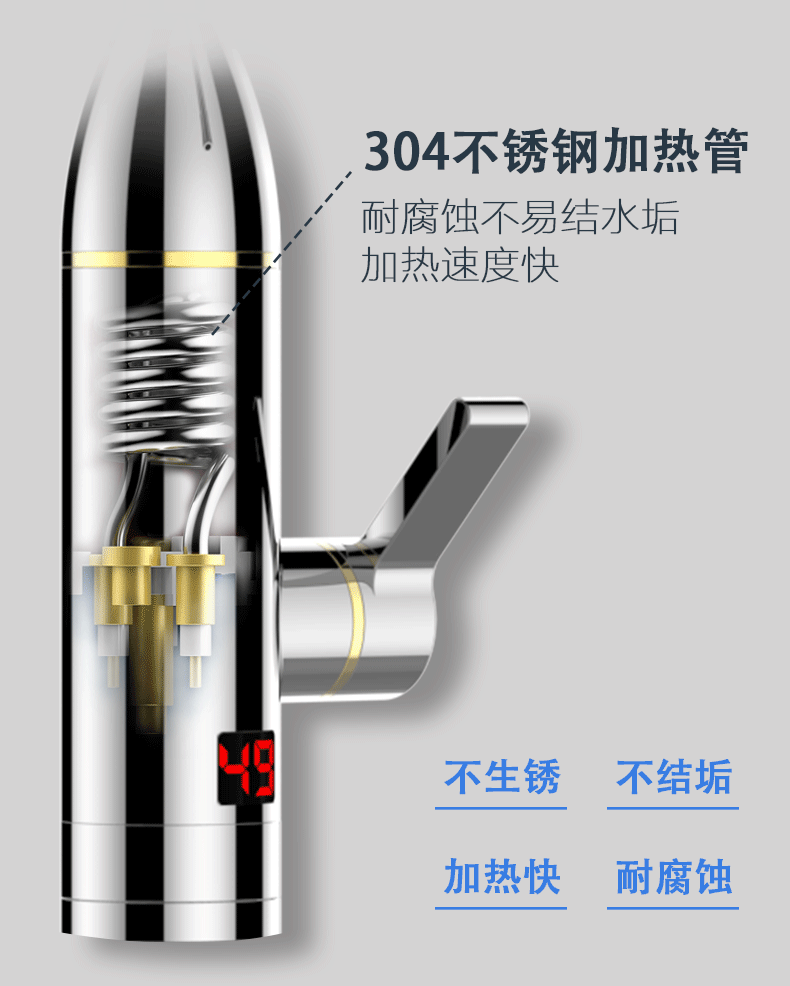 不锈钢加热管,三秒即热,智能数字显示,水流控制温度,冷热双用。360度旋转弯管,多层电镀工艺,色泽光亮,易清洗,耐腐蚀。陶瓷阀芯,水电分离,多种安全防护,全国通用管径。