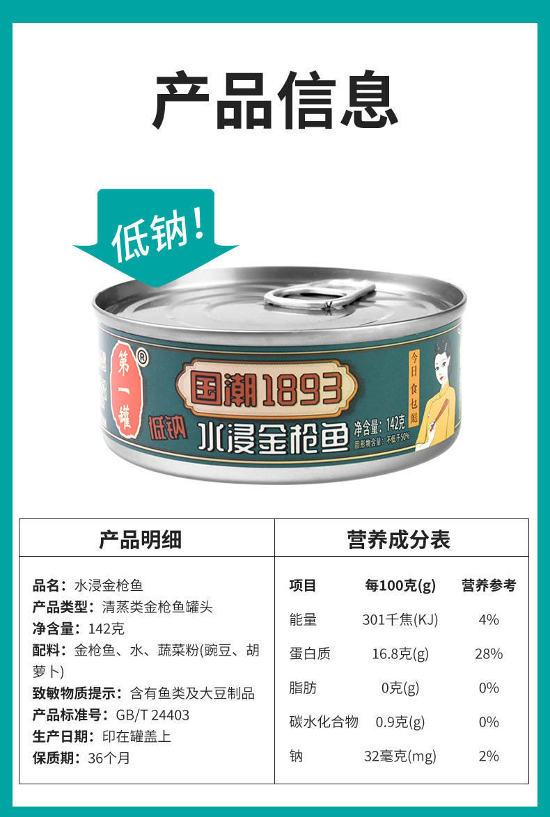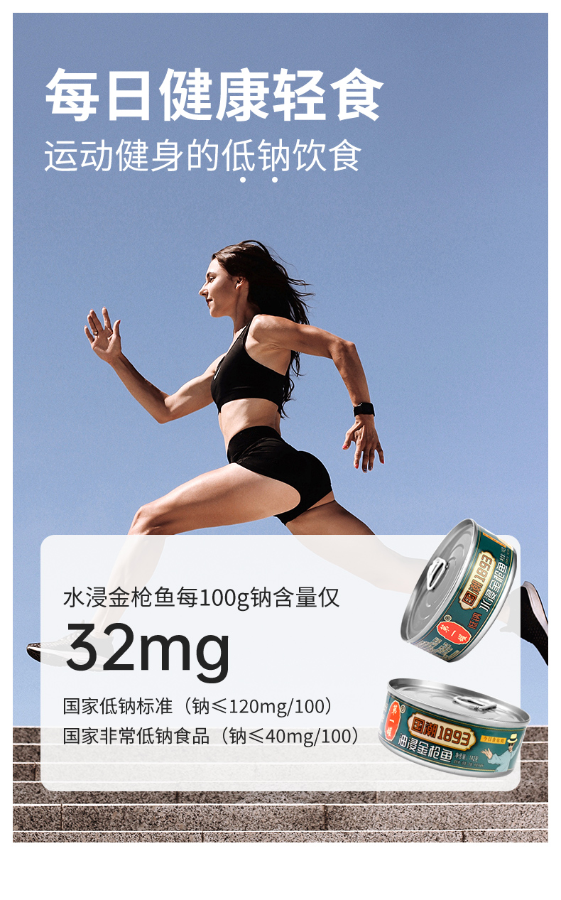 这款 水浸金枪鱼罐头,精选深海金枪鱼背部中段白肉,不掺杂边角碎料,不使用肉泥,不用红肉金枪鱼,高温杀菌无防腐剂,低钠款,每100g钠含量仅32mg,低于国家低钠标准(钠≤40mg),非常适合运动健身的低钠饮食~