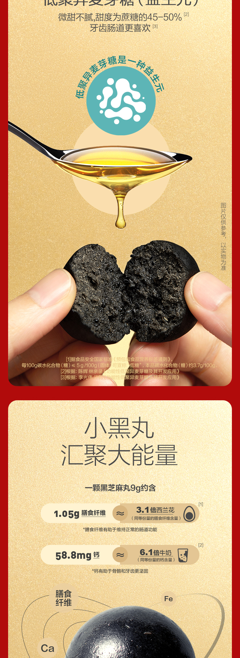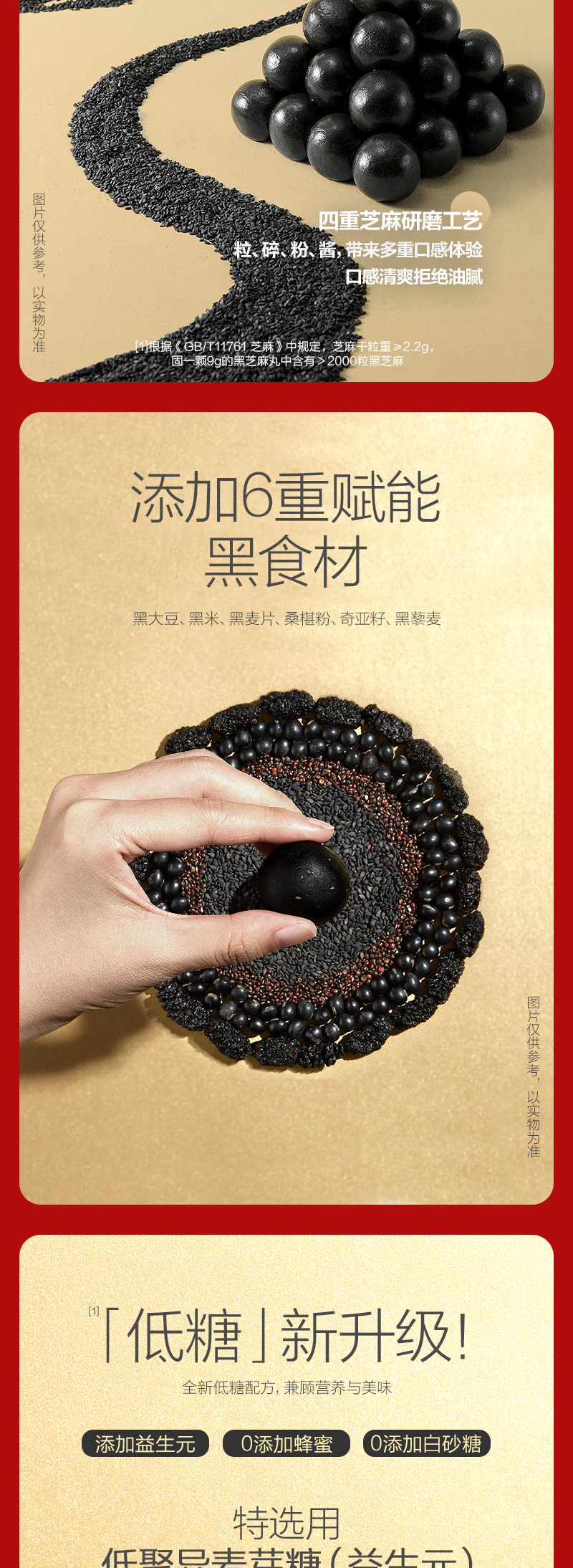 这款五谷磨房 黑芝麻丸,精选鄱阳湖黄金产地一级单壳黑芝麻、还有黑豆、黑藜麦、奇亚籽、黑米、黑藜麦等新鲜原材料,经过五筛三去石、两淘一冲洗步骤,严格筛选,特殊四目工艺成品黑芝麻丸口感有嚼劲、绵软充实,柔润细腻,没有添加白砂糖、麦芽糖、甜味剂,只选用了低聚异麦芽糖,保证纯正健康。