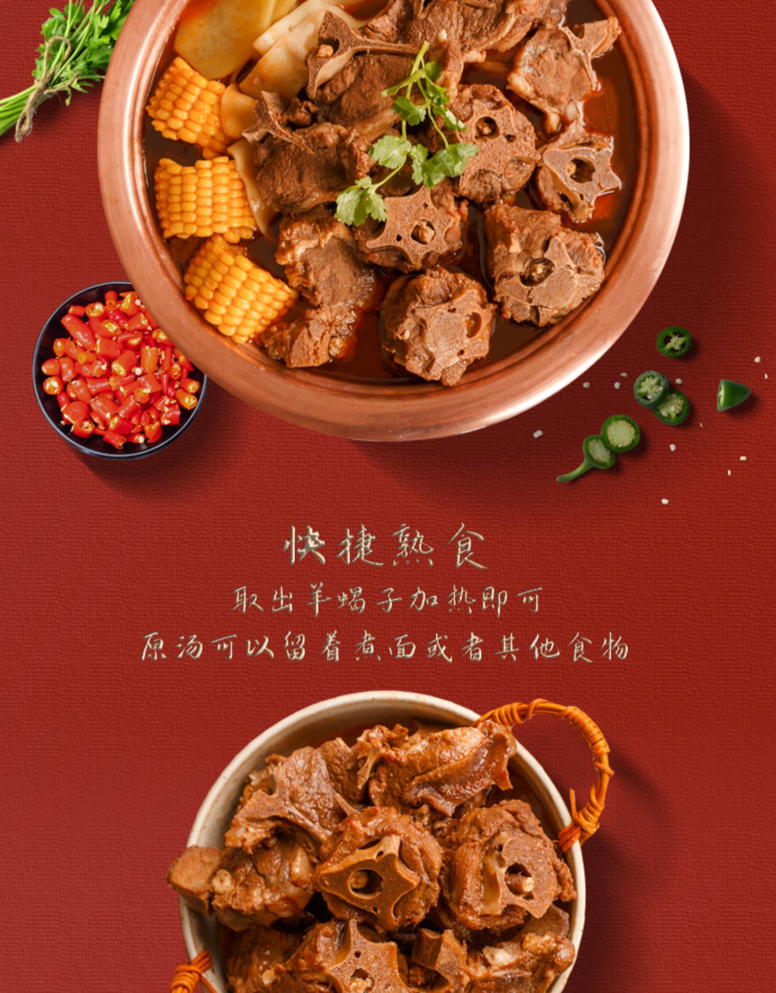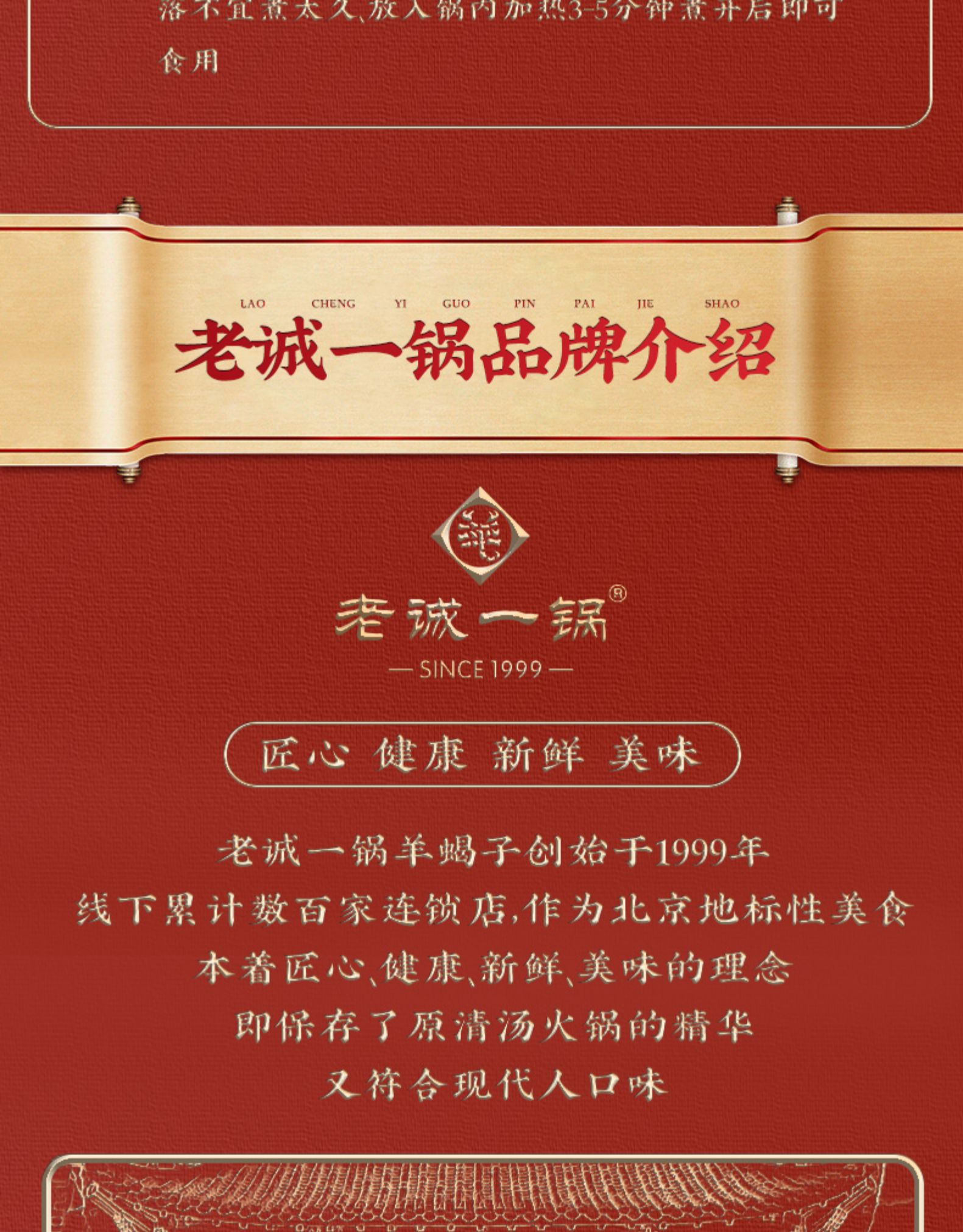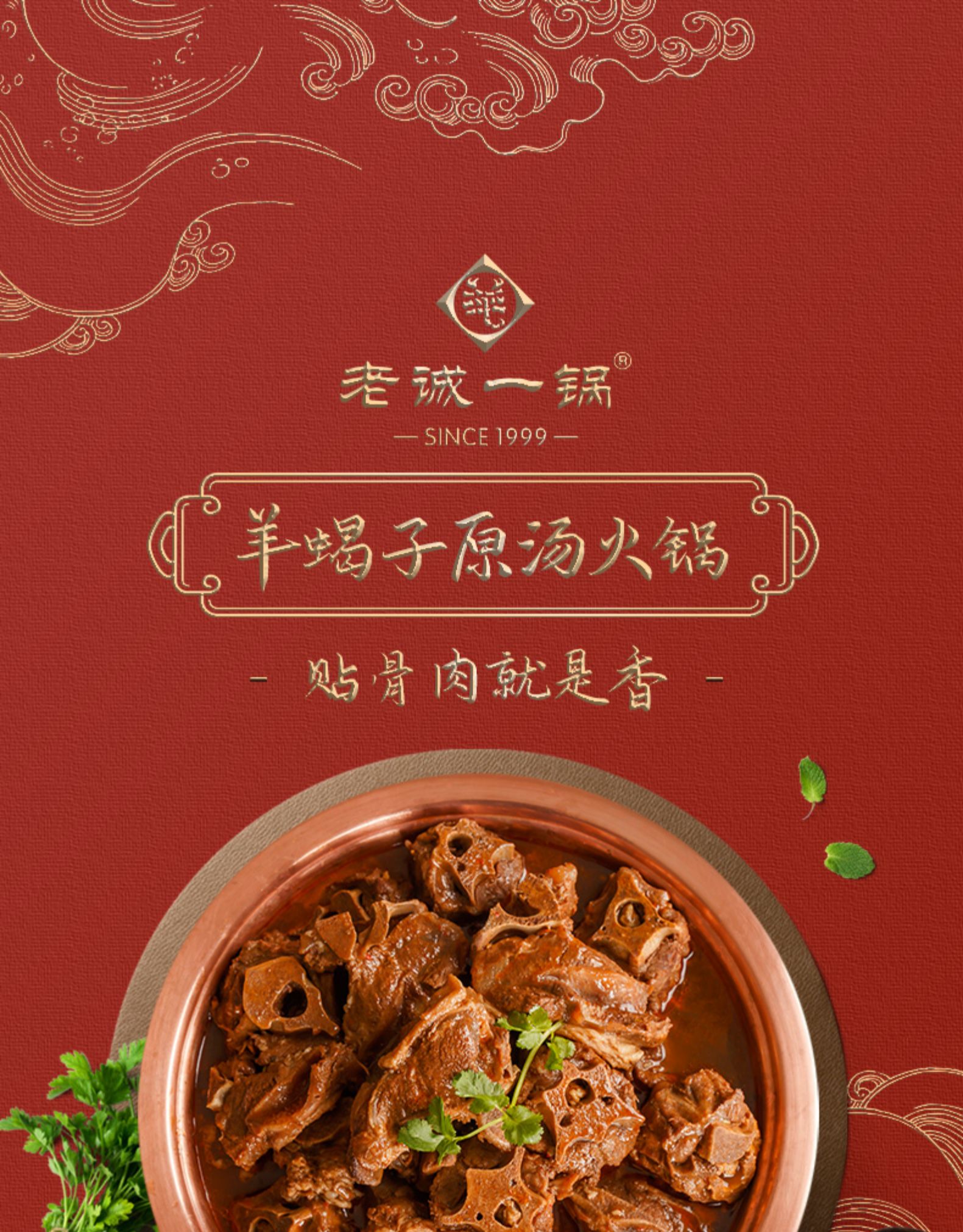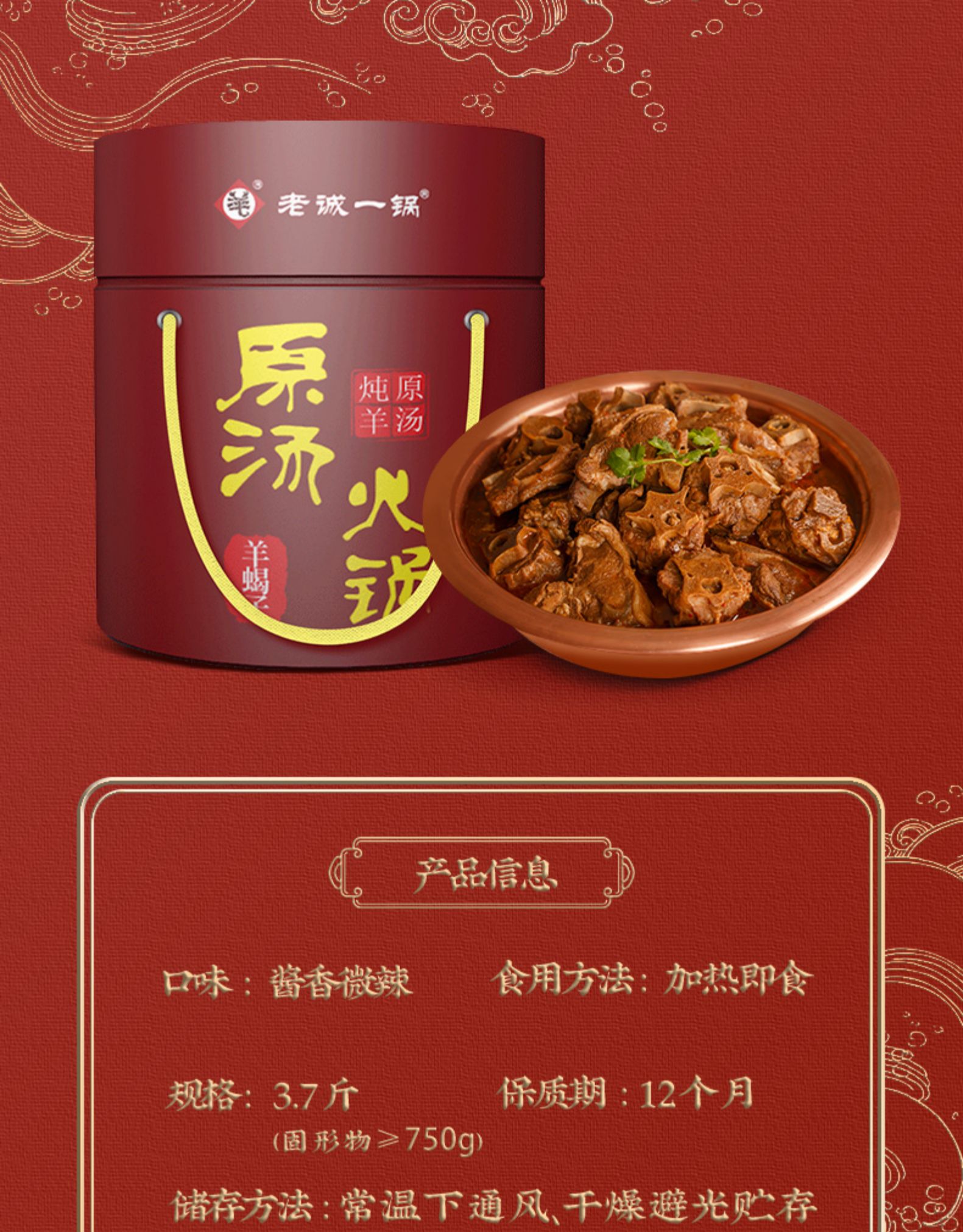 这款老诚一锅酱香微辣羊蝎子火锅,来自于180天的内蒙古羔羊,使用物理切割,骨少肉多,经过排酸、蒸煮、卤制、121℃高温杀菌封装,口感香嫩,肉质鲜而不膻,肉鲜嫩骨髓多,搭配汤料,加热即食。