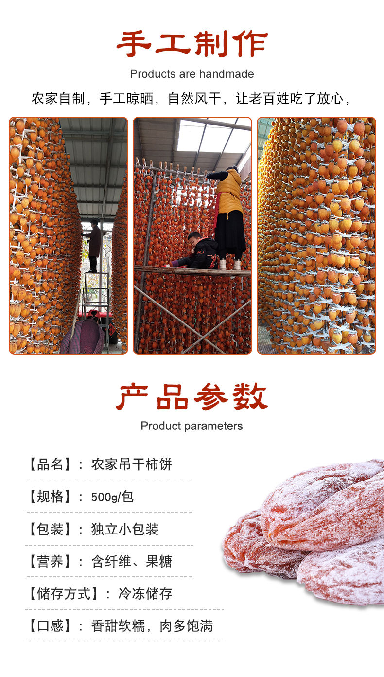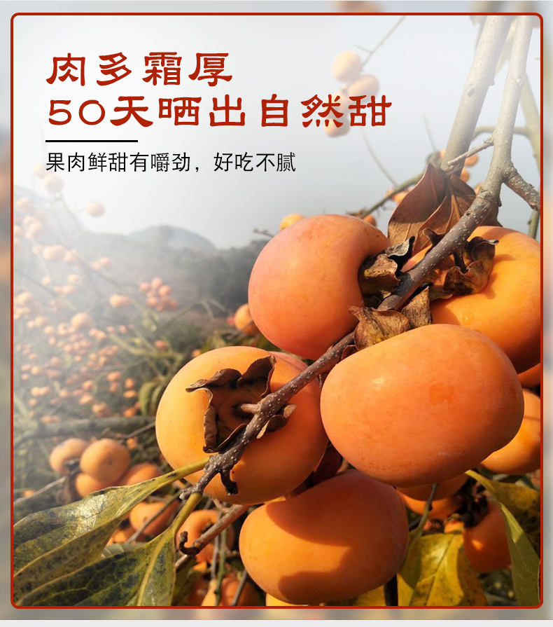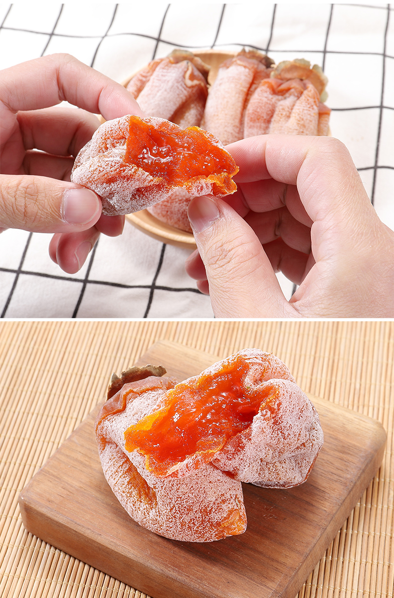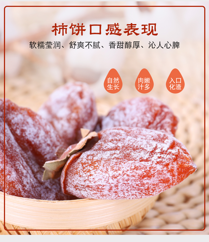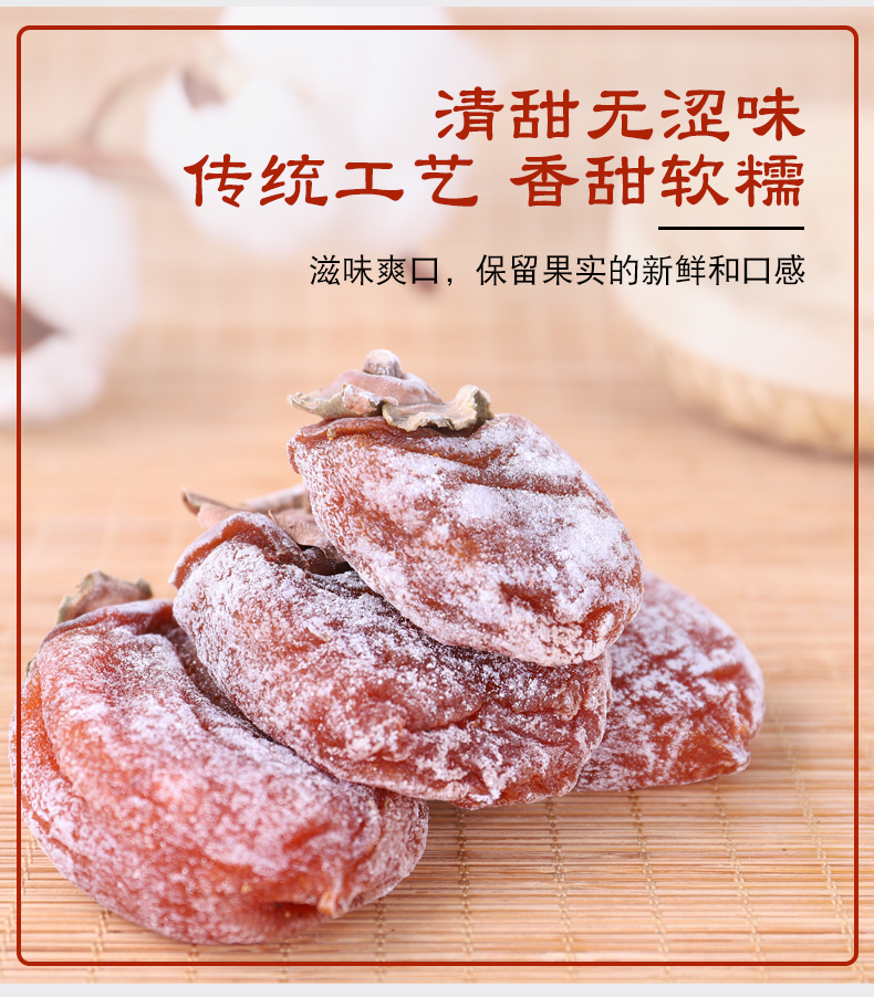 自然风干晾晒出白霜,肉质致密,纤维少汁液多,吃起来软糯香甜,不涩不腻,老少皆宜。