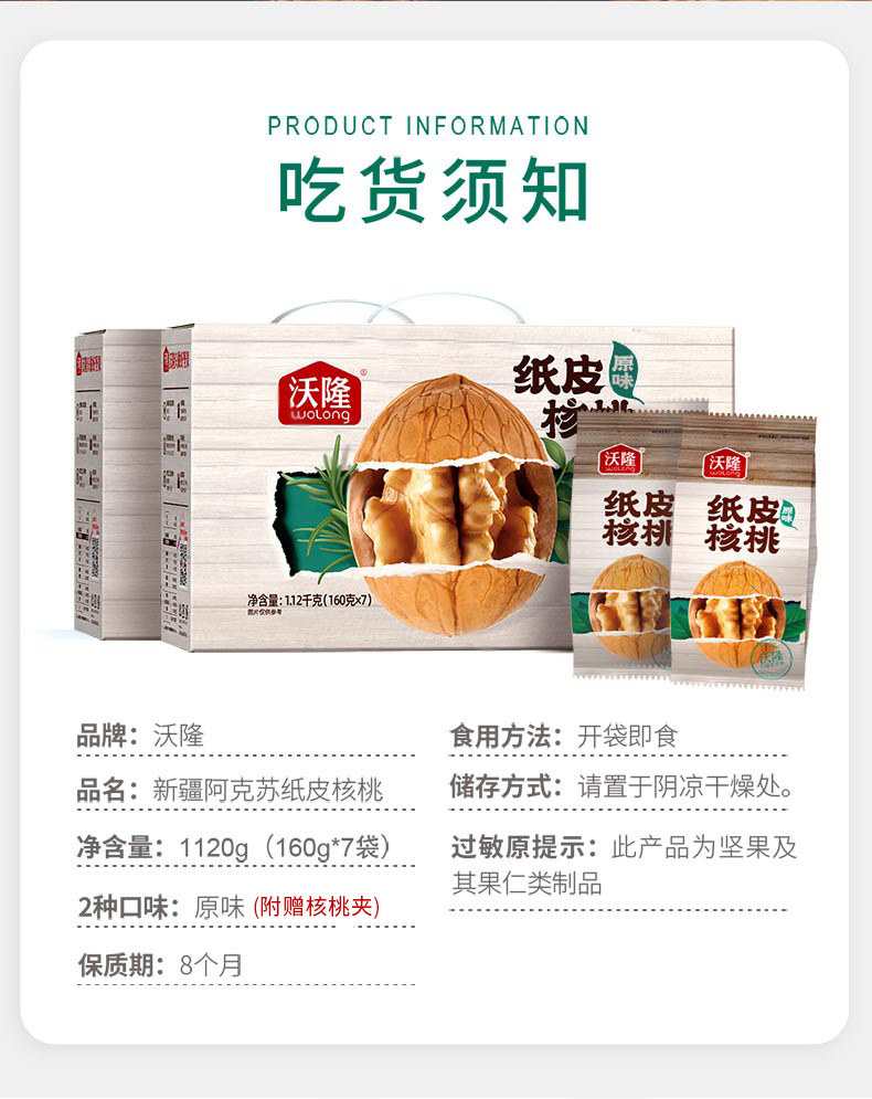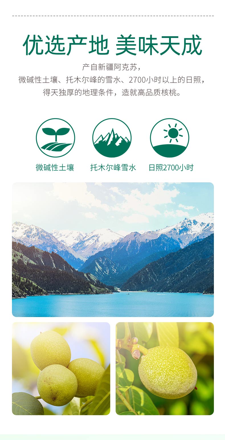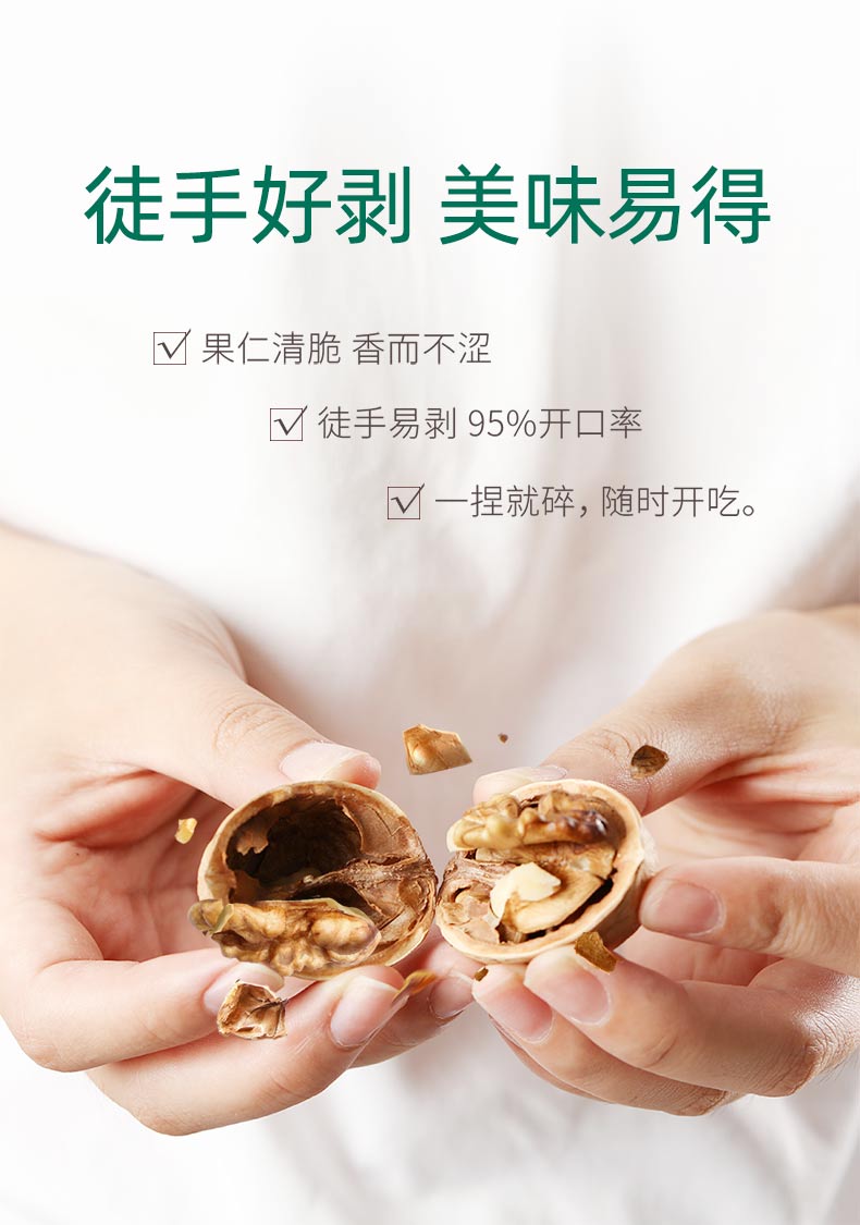 选用新疆阿克苏的纸皮核桃,这是属于新疆和田的特有品种,壳薄如纸,手捏即开,食用非常方便。果壳纹理清晰,天然光洁无漂白,果肉橙黄饱满,入口脆感无涩味。